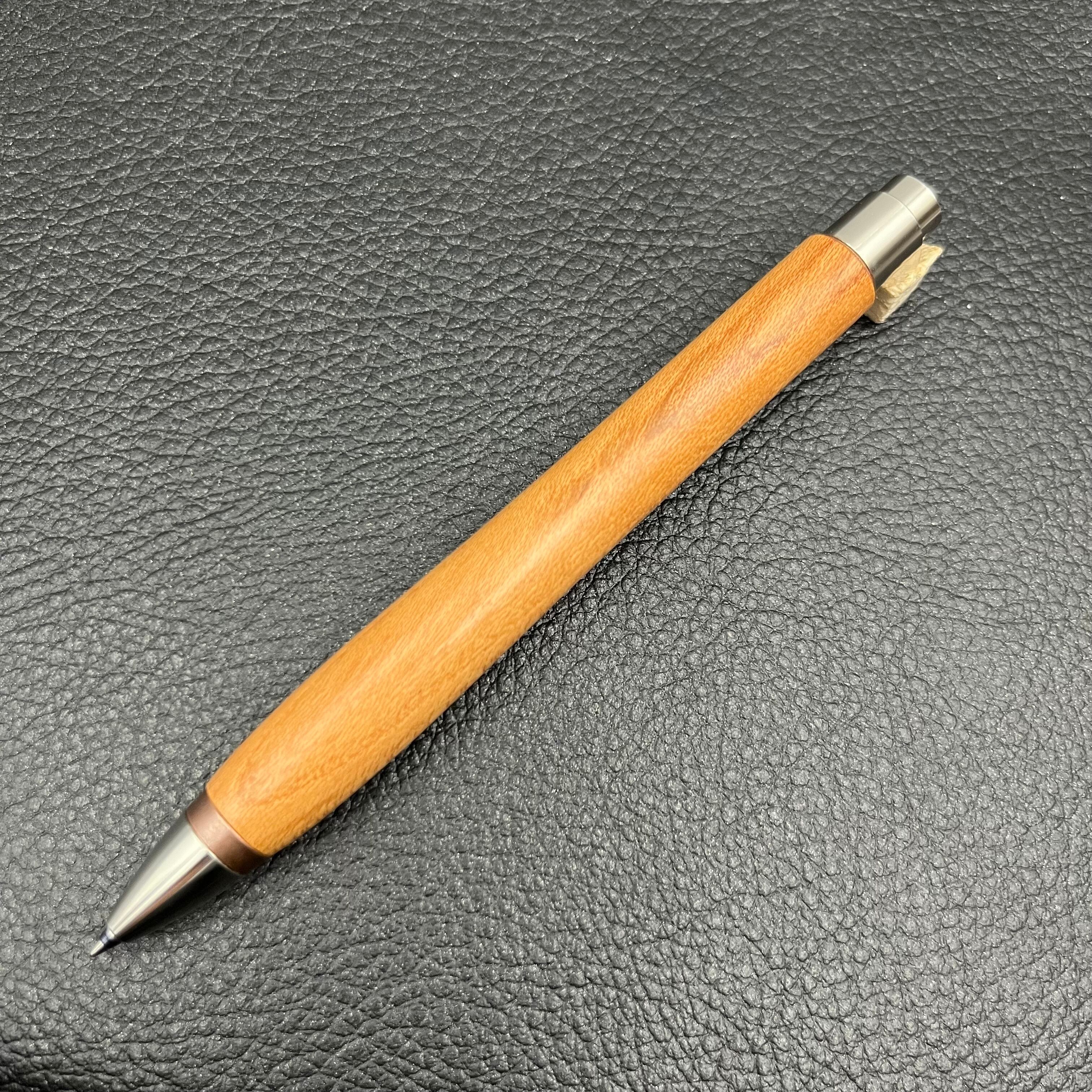 ボールペンのノックシステムは、ドイツ最高のクリックメカニズムを採用してあります。このメカニズムはユニークな機構のため、クリックしたときのカチカチ音が静かで、どんな場所でも気兼ねなく使うことができます。滑らかに動くこのプッシュ感覚を一度味わうと他には戻れなくなってしまうほどの魅力があります。 高級ステンレス材を100分の1単位の加工精度で削り出された口金により芯ブレも全くありません。内部のアルミを使ったリフィルアダプターもオリジナルです。