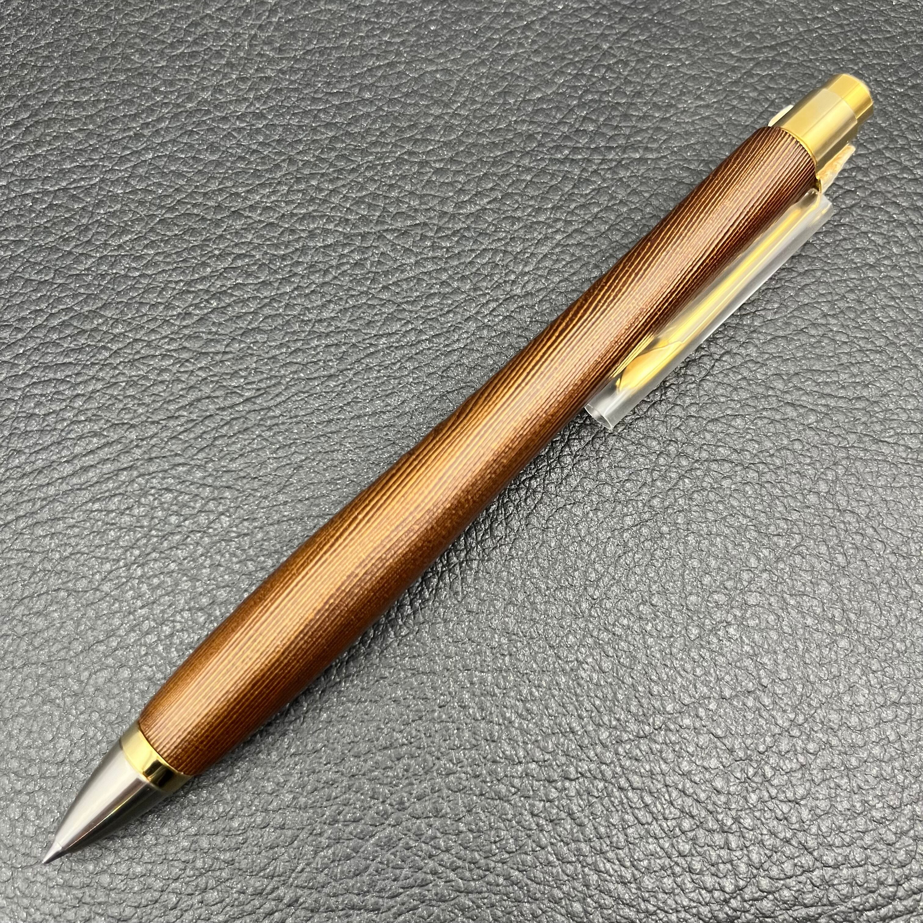 ※大阪の漆塗り職人さんの技術で浮造りした屋久杉に約1.77gの金粉を定着させ、国産生漆に染料を加えて金粉の発色を活かすことで、梨の肌のような仕上がりになっています。ノックは限定カラーのゴールドが付きます。このノックは、金メッキが取れますので研磨剤などでは磨かないようにして下さい。