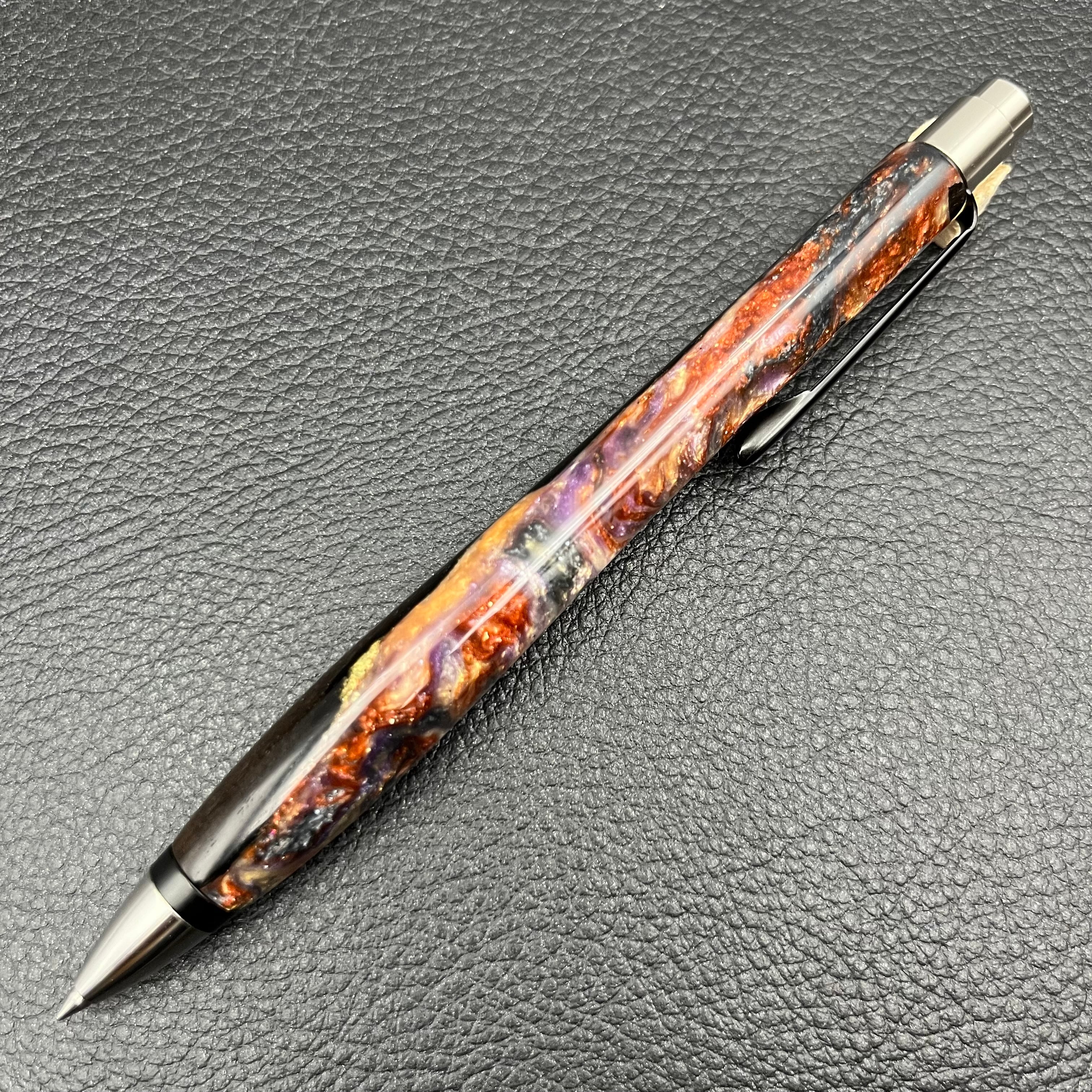 ボールペンのノックシステムは、ドイツ最高のクリックメカニズムを採用してあります。このメカニズムはユニークな機構のため、クリックしたときのカチカチ音が静かで、どんな場所でも気兼ねなく使うことができます。滑らかに動くこのプッシュ感覚を一度味わうと他には戻れなくなってしまうほどの魅力があります。 100分の1単位の加工精度で削り出されたペン先は、軸ブレも全くありません。