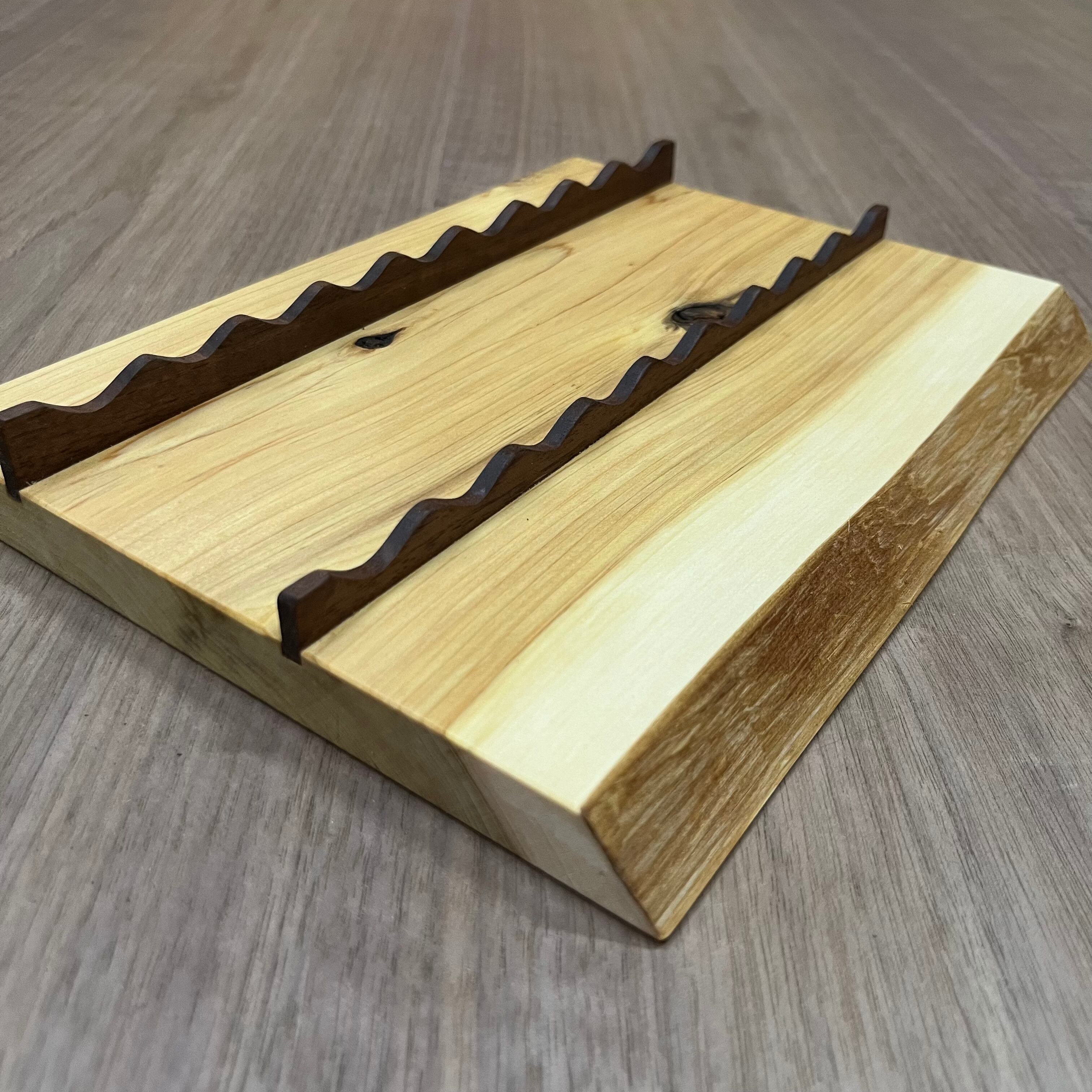 デスクの上でペンを9本飾ることができる、木の温かみや表情をそのまま活かしたペントレイです。ペンを優しく支えれるように白い曲線部分はメイプルを加工しています。