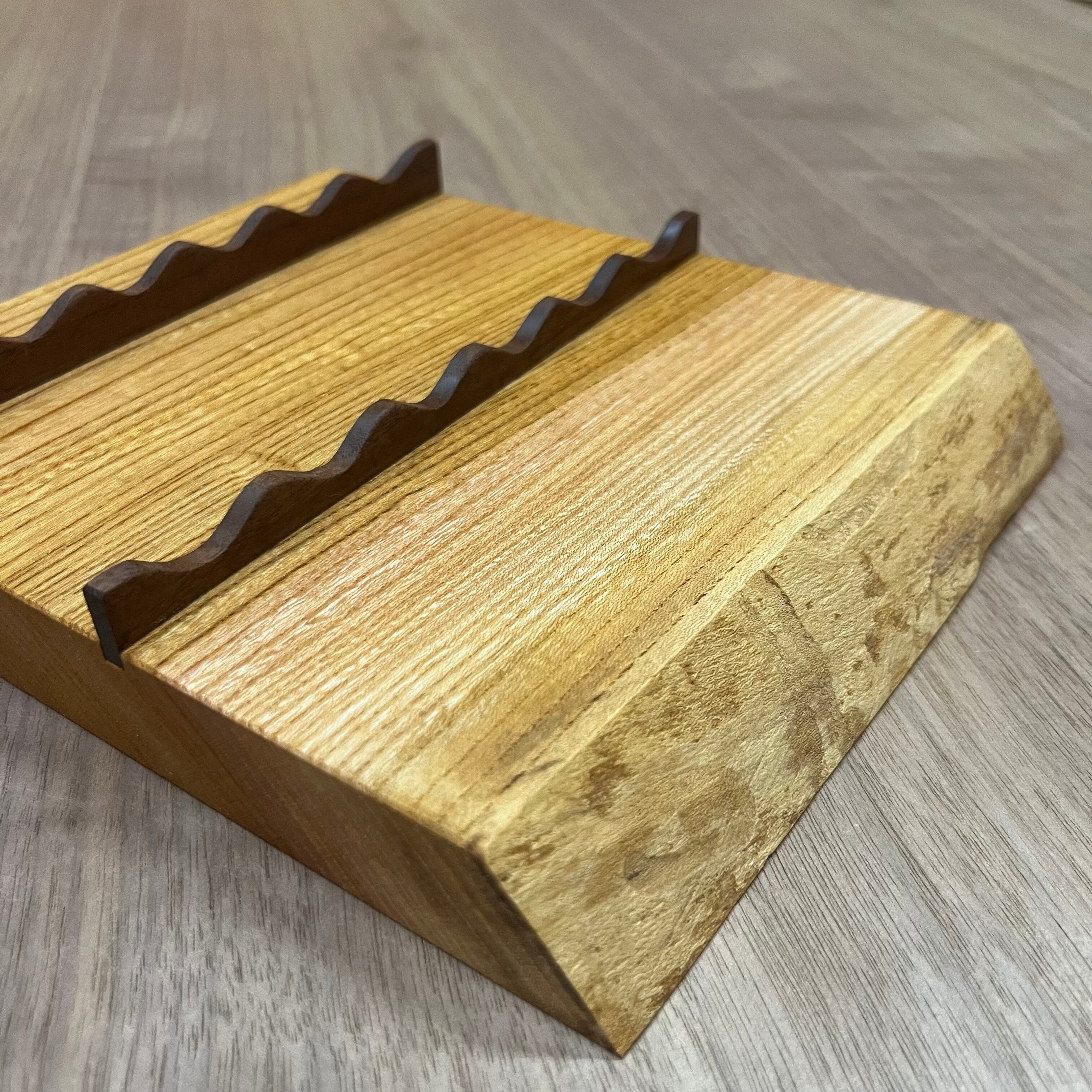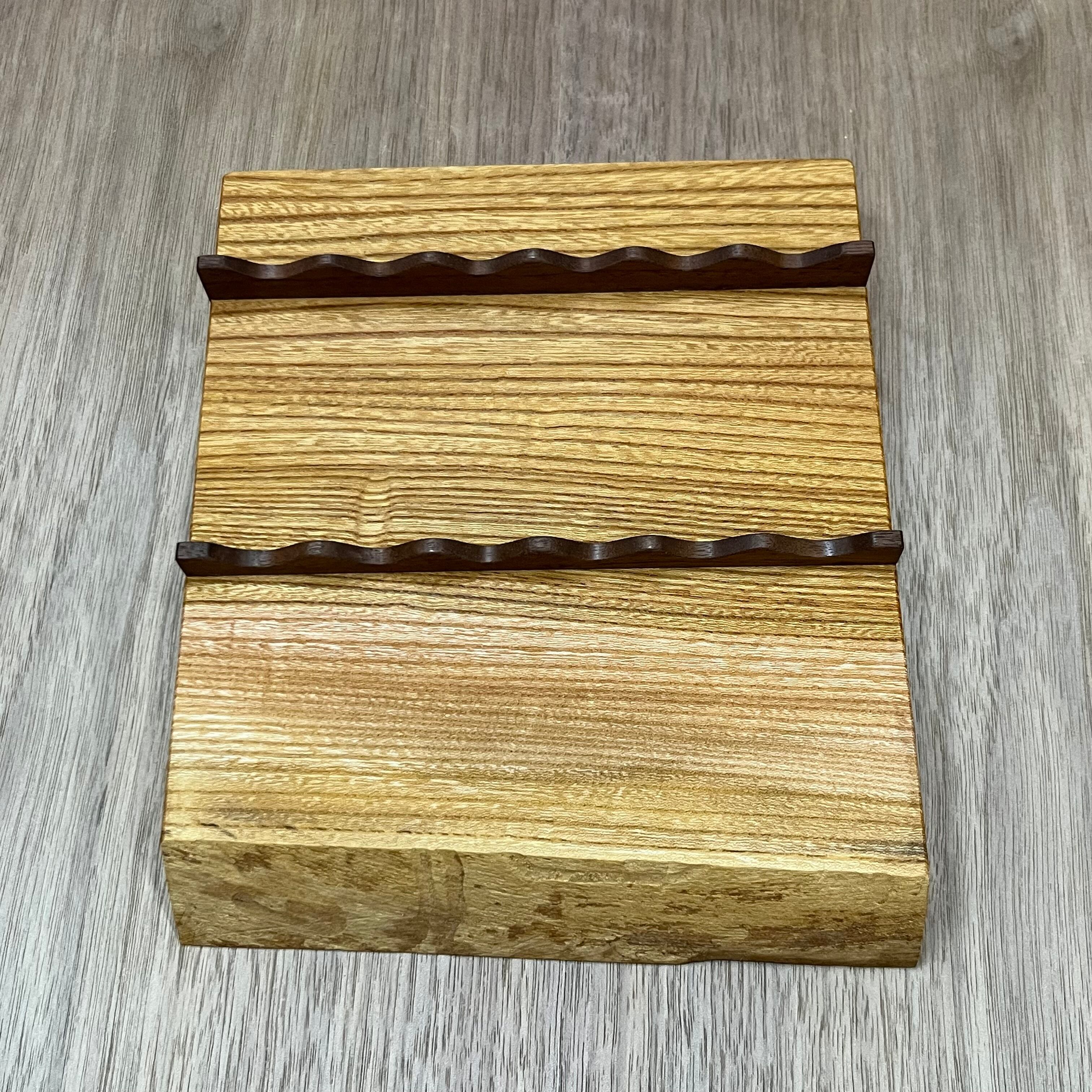 耳付き一枚板を天然オイルで仕上げてあり、ペンの長さや太さが違っても置けるように作られています。