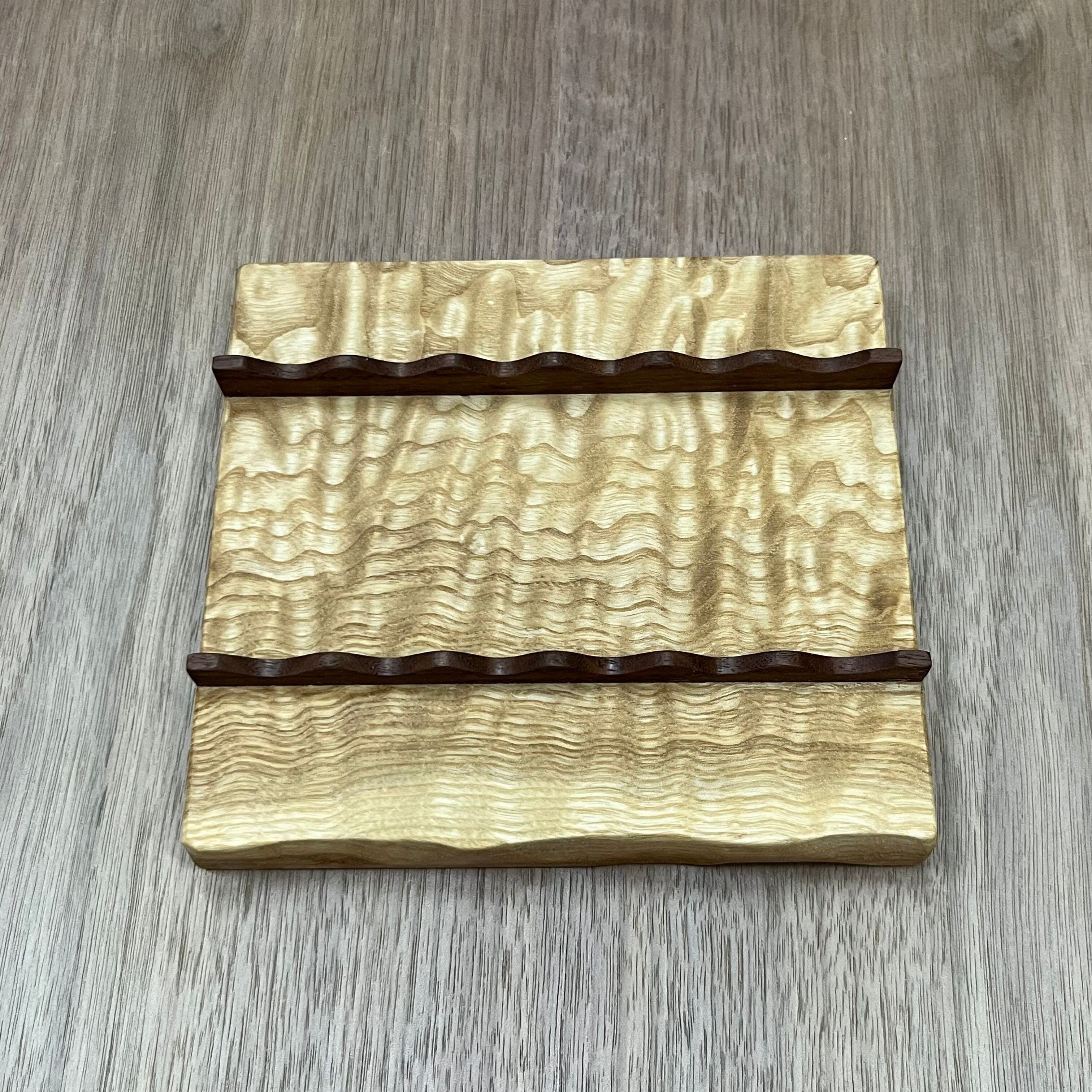 デスクの上でペンを6本飾ることができる、木の温かみや表情をそのまま活かした6本置きペントレイです。ペンを優しく支えれるように白い曲線部分はメイプルを加工しています。