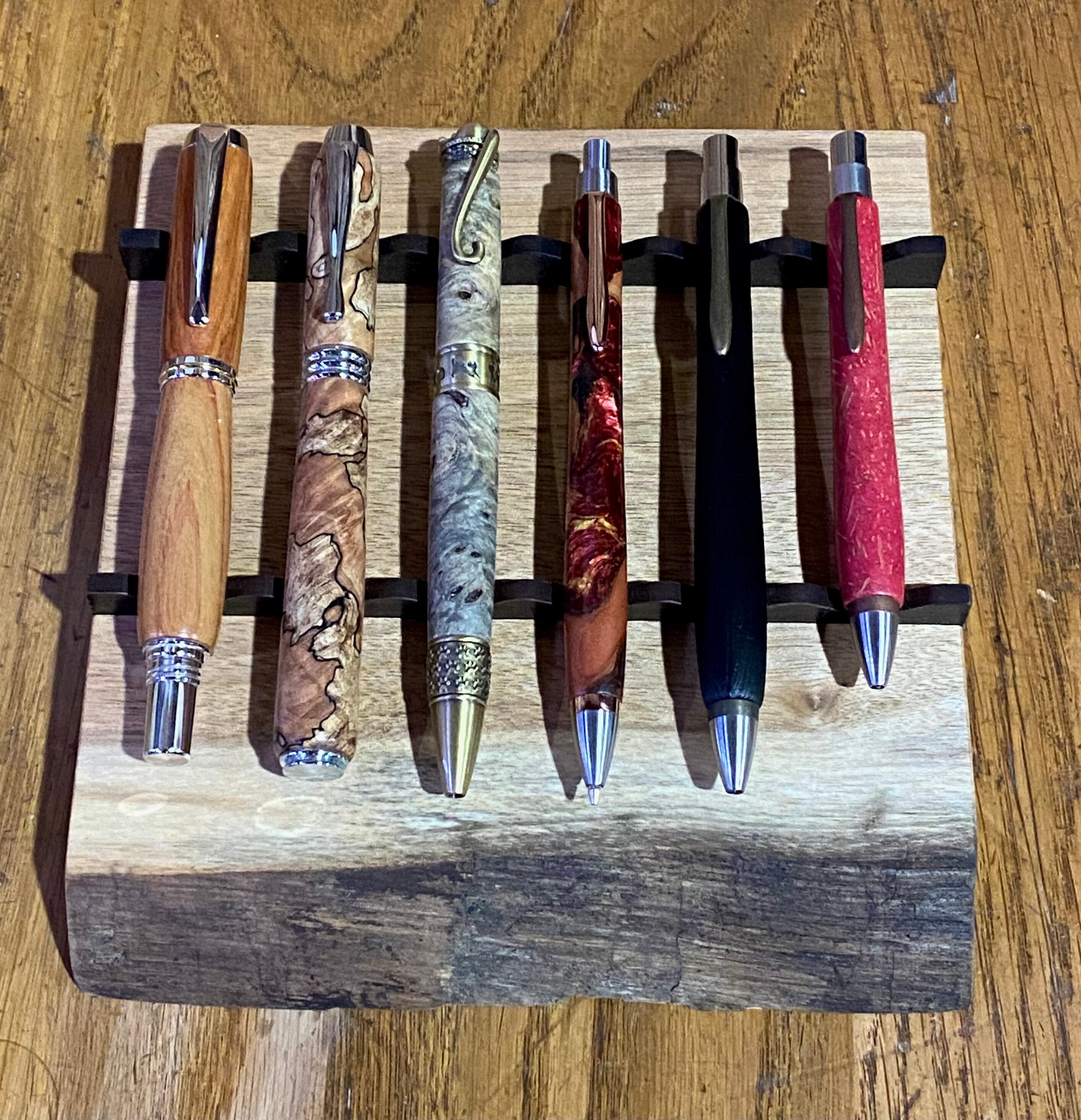 耳付き一枚板を天然オイルで仕上げてあり、ペンの長さや太さが違っても置けるように作られています。