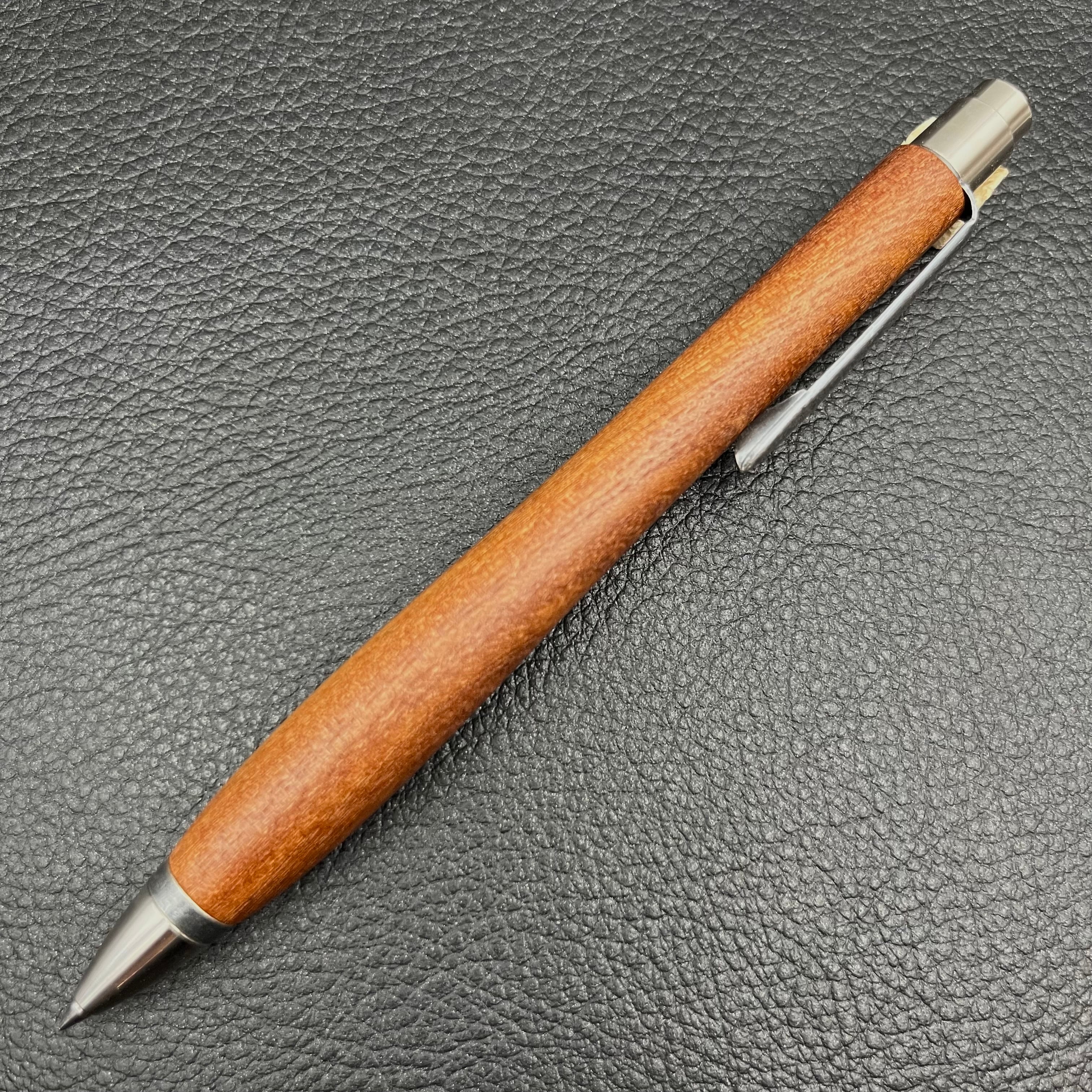 ボールペンのノックシステムは、ドイツ最高のクリックメカニズムを採用してあります。このメカニズムはユニークな機構のため、クリックしたときのカチカチ音が静かで、どんな場所でも気兼ねなく使うことができます。滑らかに動くこのプッシュ感覚を一度味わうと他には戻れなくなってしまうほどの魅力があります。 100分の1単位の加工精度で削り出されたペン先は、軸ブレも全くありません。