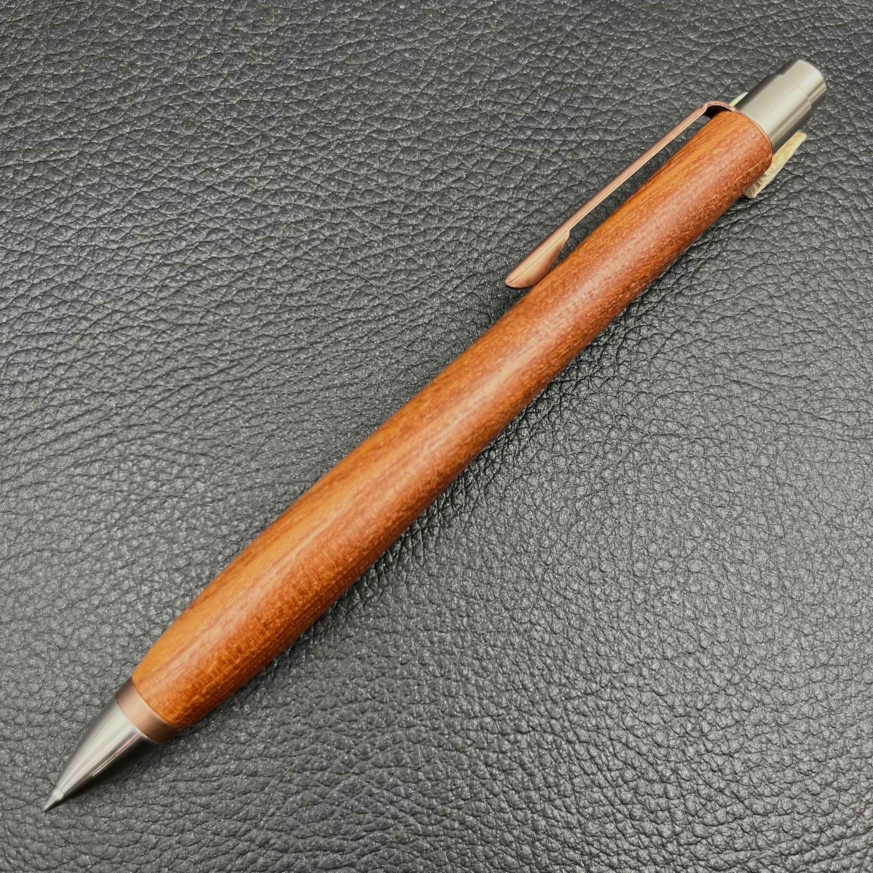 ペンに使った木は、推定50年以上も前に雷に打たれた大枝を強剪定したもので、巨木と雷の影響で普通の欅と色合いが全く違い濃いです。