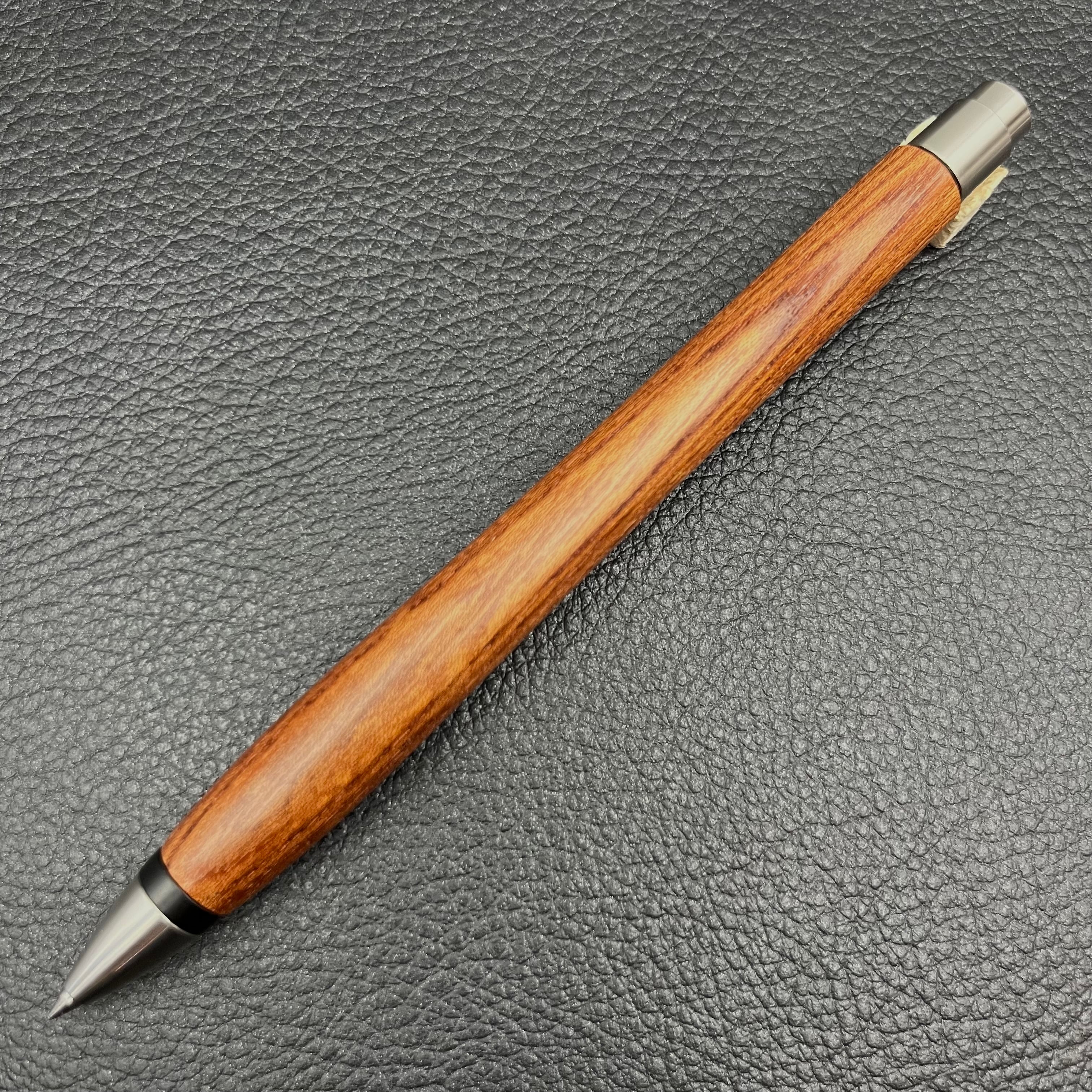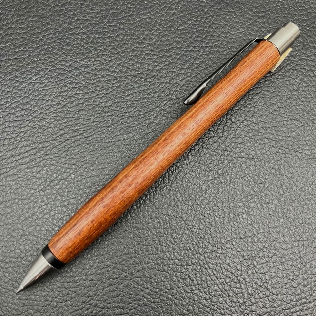 ペンに使った木は、推定50年以上も前に雷に打たれた大枝を強剪定したもので、巨木と雷の影響で普通の欅と色合いが全く違い濃いです。