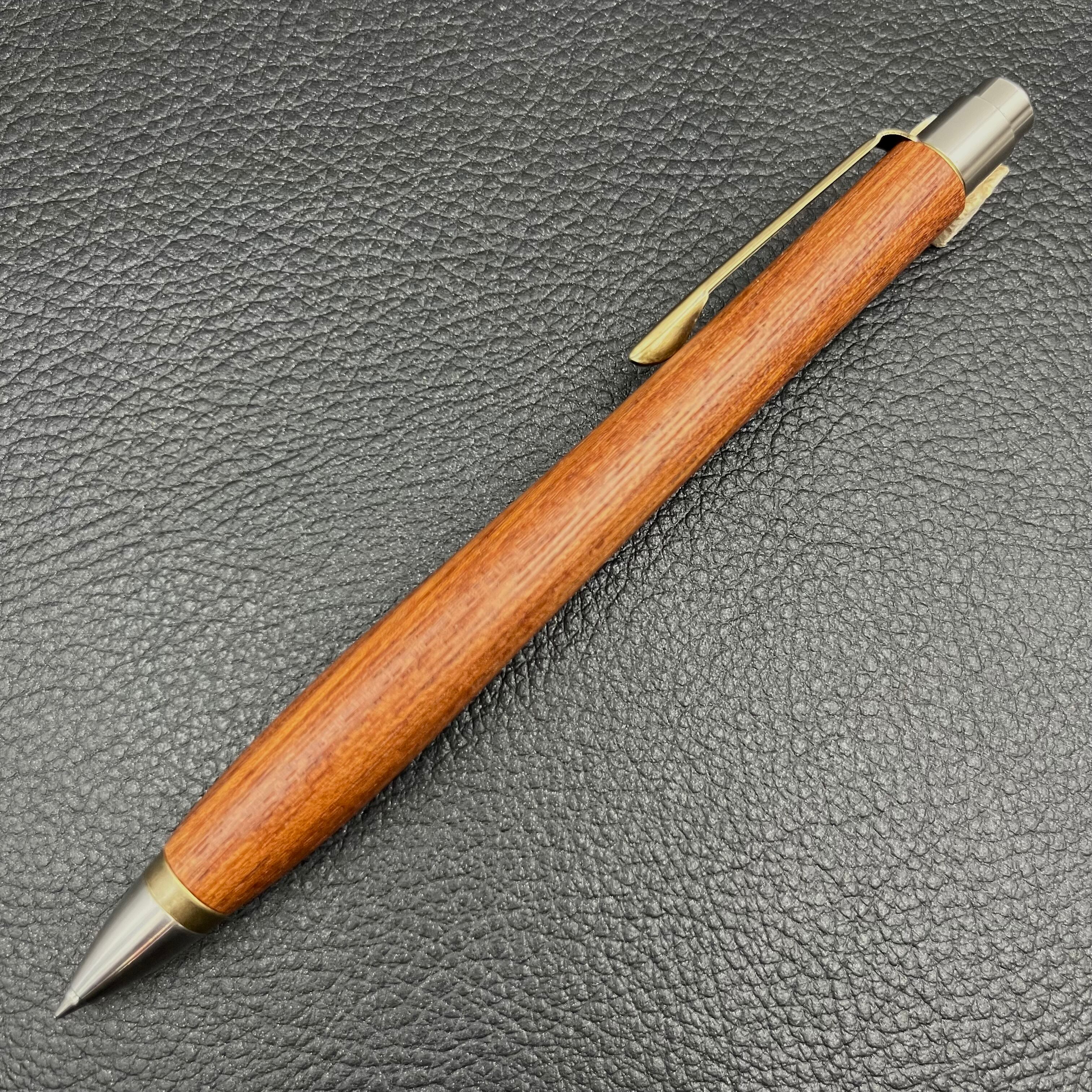 ペンに使った木は、推定50年以上も前に雷に打たれた大枝を強剪定したもので、巨木と雷の影響で普通の欅と色合いが全く違い濃いです。
