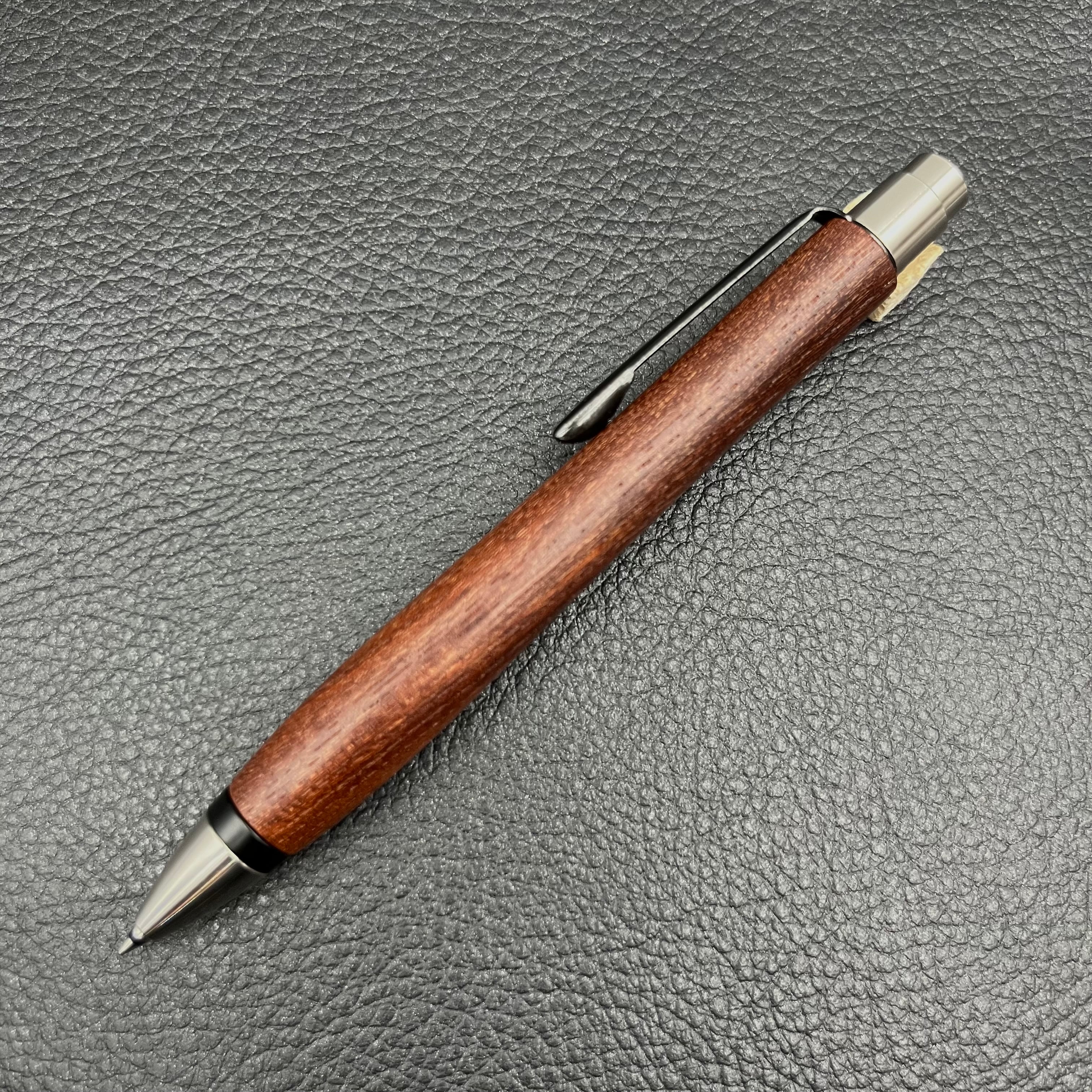 ペンに使った木は、推定50年以上も前に雷に打たれた大枝を強剪定したもので、巨木と雷の影響で普通の欅と色合いが全く違い濃いです。