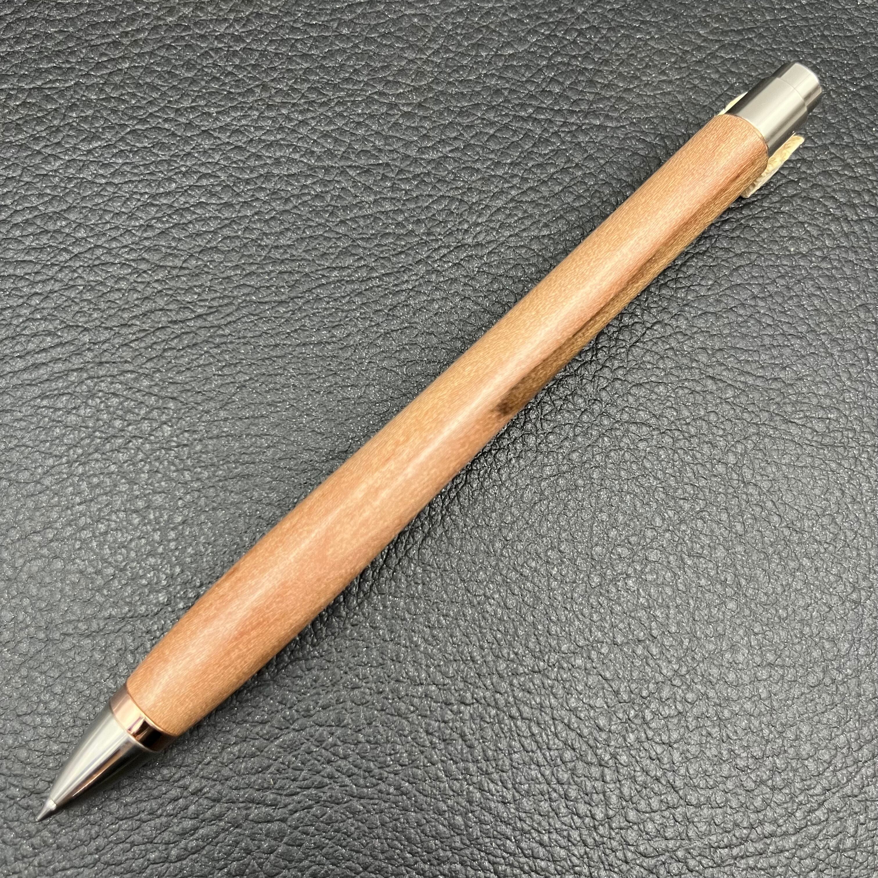 ボールペンのノックシステムは、ドイツ最高のクリックメカニズムを採用してあります。このメカニズムはユニークな機構のため、クリックしたときのカチカチ音が静かで、どんな場所でも気兼ねなく使うことができます。滑らかに動くこのプッシュ感覚を一度味わうと他には戻れなくなってしまうほどの魅力があります。 100分の1単位の加工精度で削り出されたペン先は、軸ブレも全くありません。