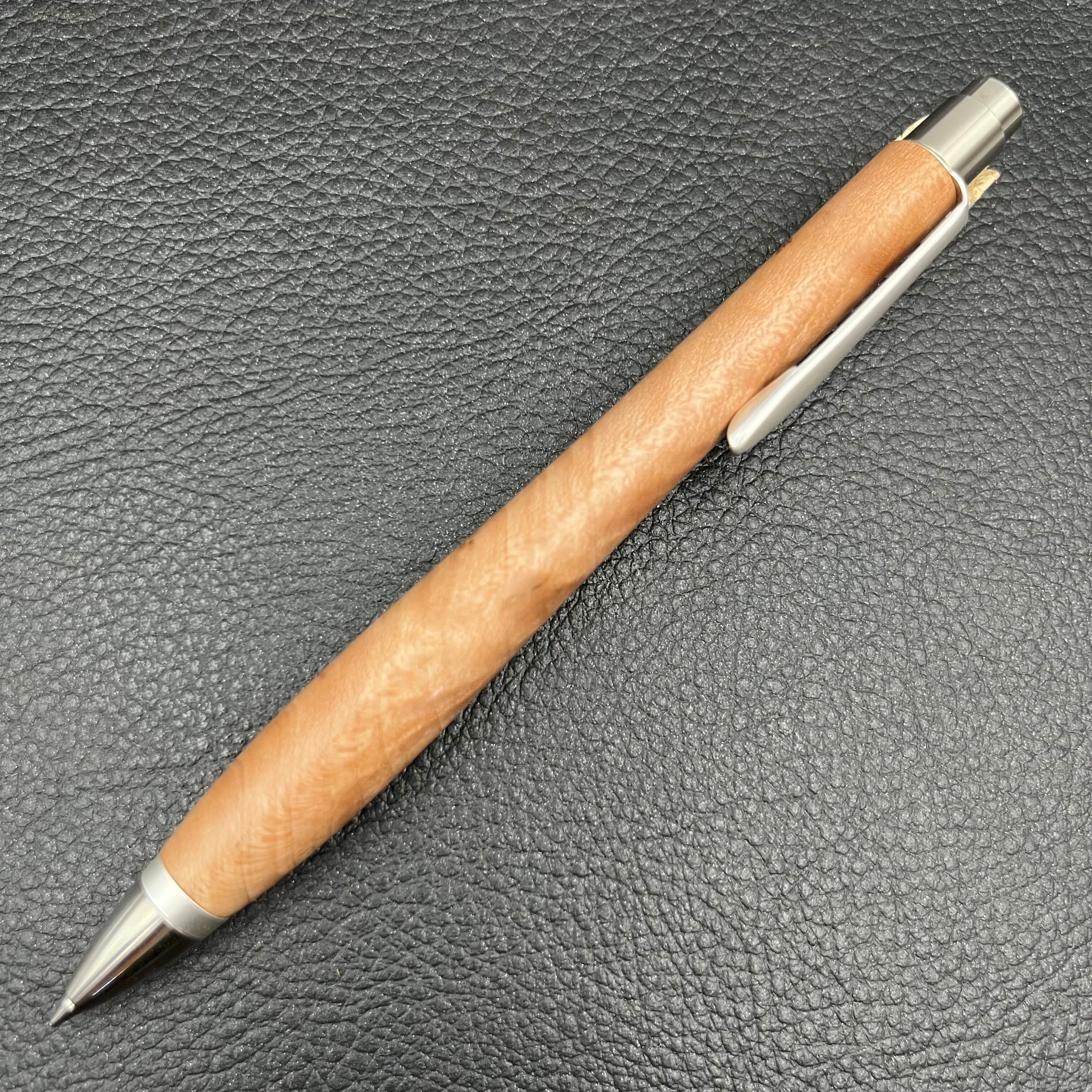 ボールペンのノックシステムは、ドイツ最高のクリックメカニズムを採用してあります。このメカニズムはユニークな機構のため、クリックしたときのカチカチ音が静かで、どんな場所でも気兼ねなく使うことができます。滑らかに動くこのプッシュ感覚を一度味わうと他には戻れなくなってしまうほどの魅力があります。 100分の1単位の加工精度で削り出されたペン先は、軸ブレも全くありません。