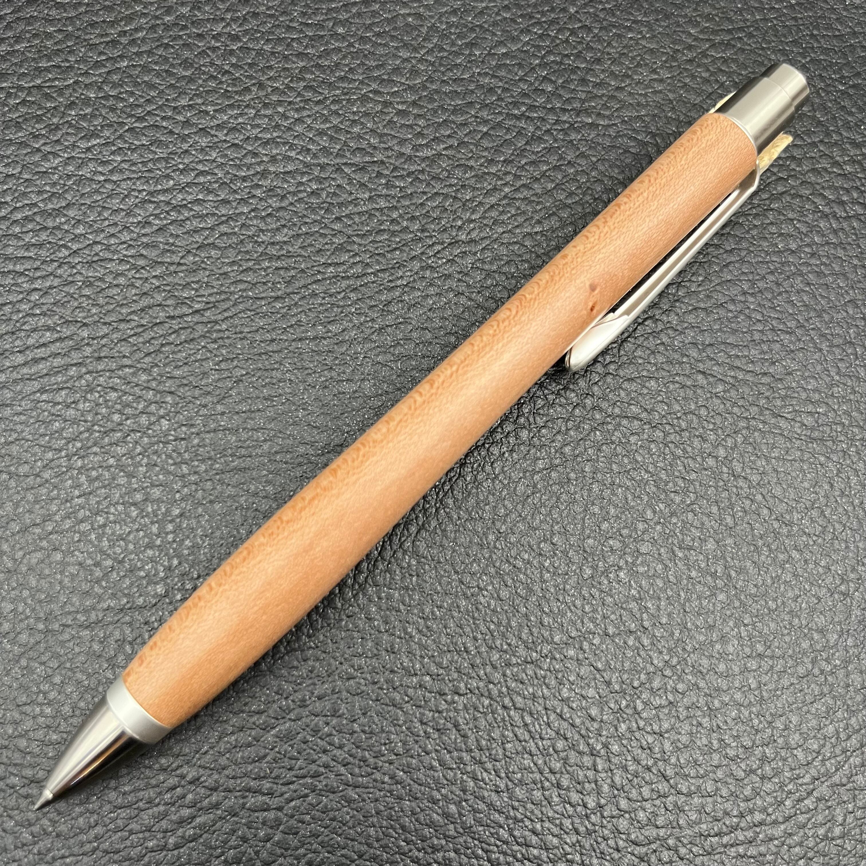 ボールペンのノックシステムは、ドイツ最高のクリックメカニズムを採用してあります。このメカニズムはユニークな機構のため、クリックしたときのカチカチ音が静かで、どんな場所でも気兼ねなく使うことができます。滑らかに動くこのプッシュ感覚を一度味わうと他には戻れなくなってしまうほどの魅力があります。 100分の1単位の加工精度で削り出されたペン先は、軸ブレも全くありません。