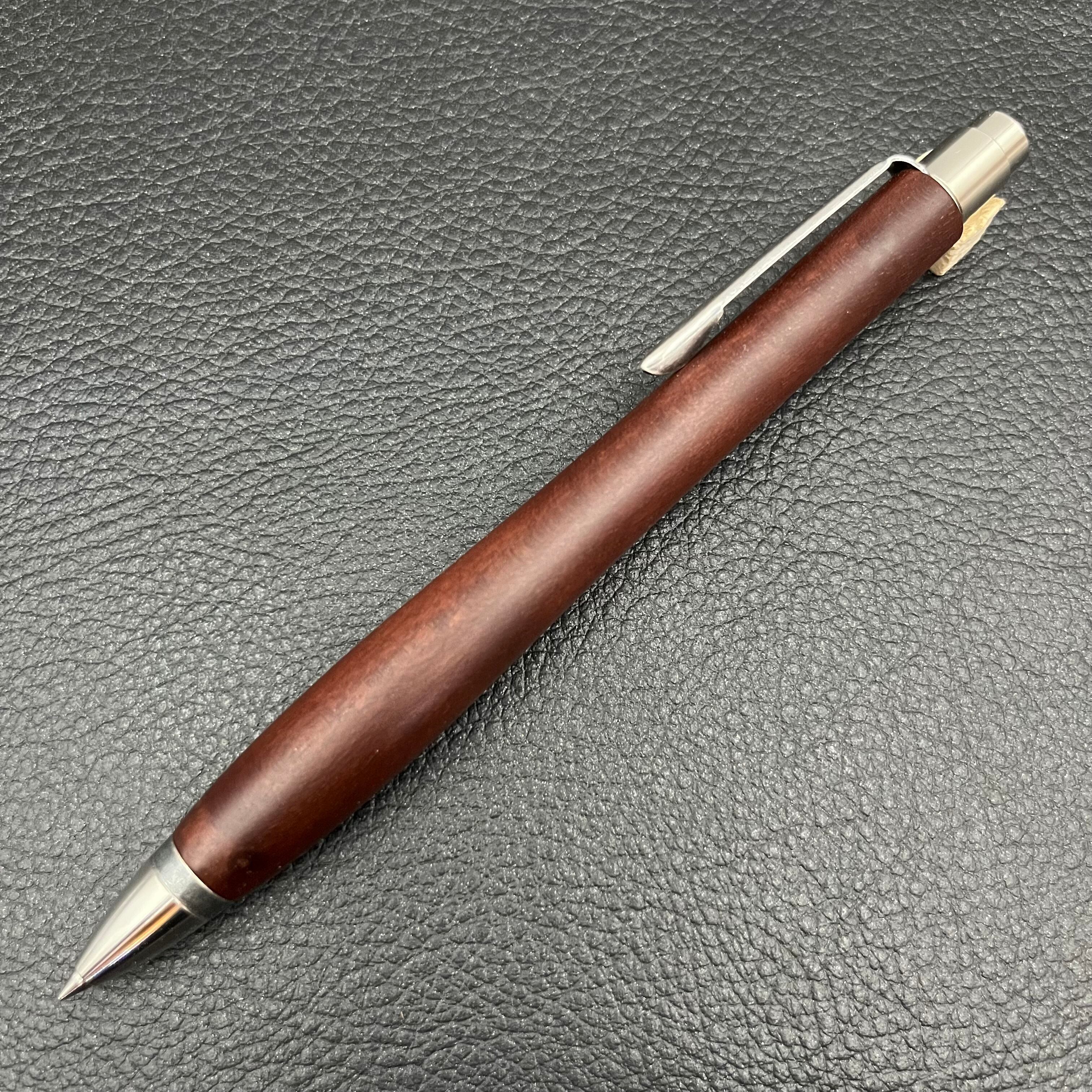 ・沖縄のアカギでペンを制作しました。日本では赤色の木は珍しく時間が経つと濃い茶色になります。