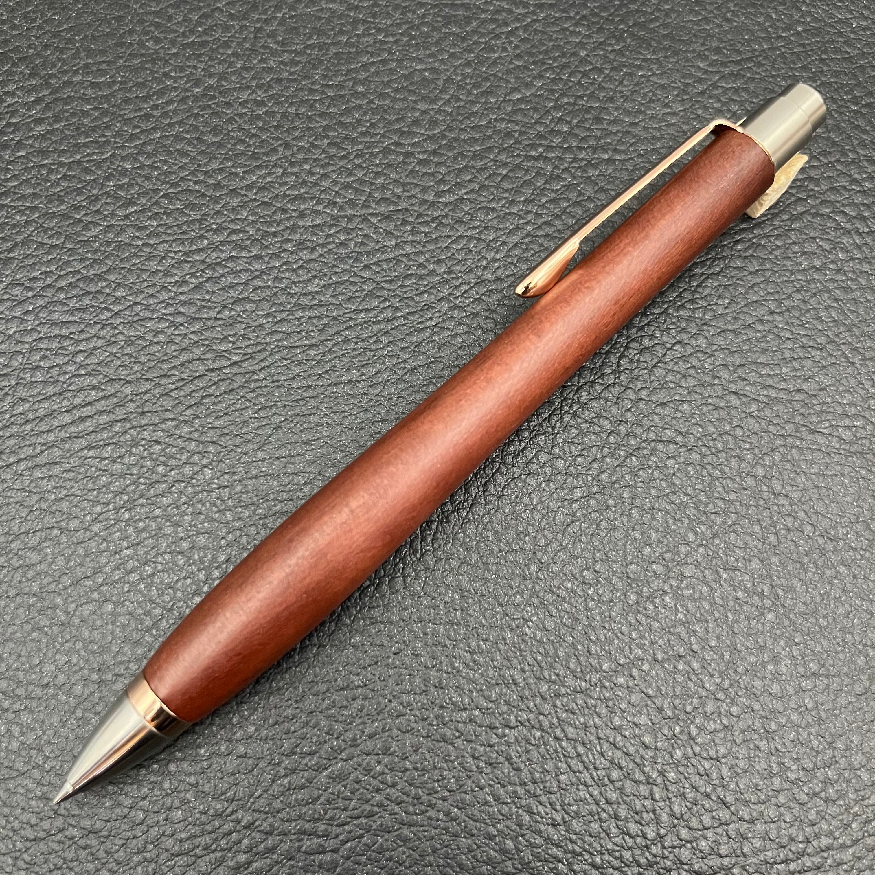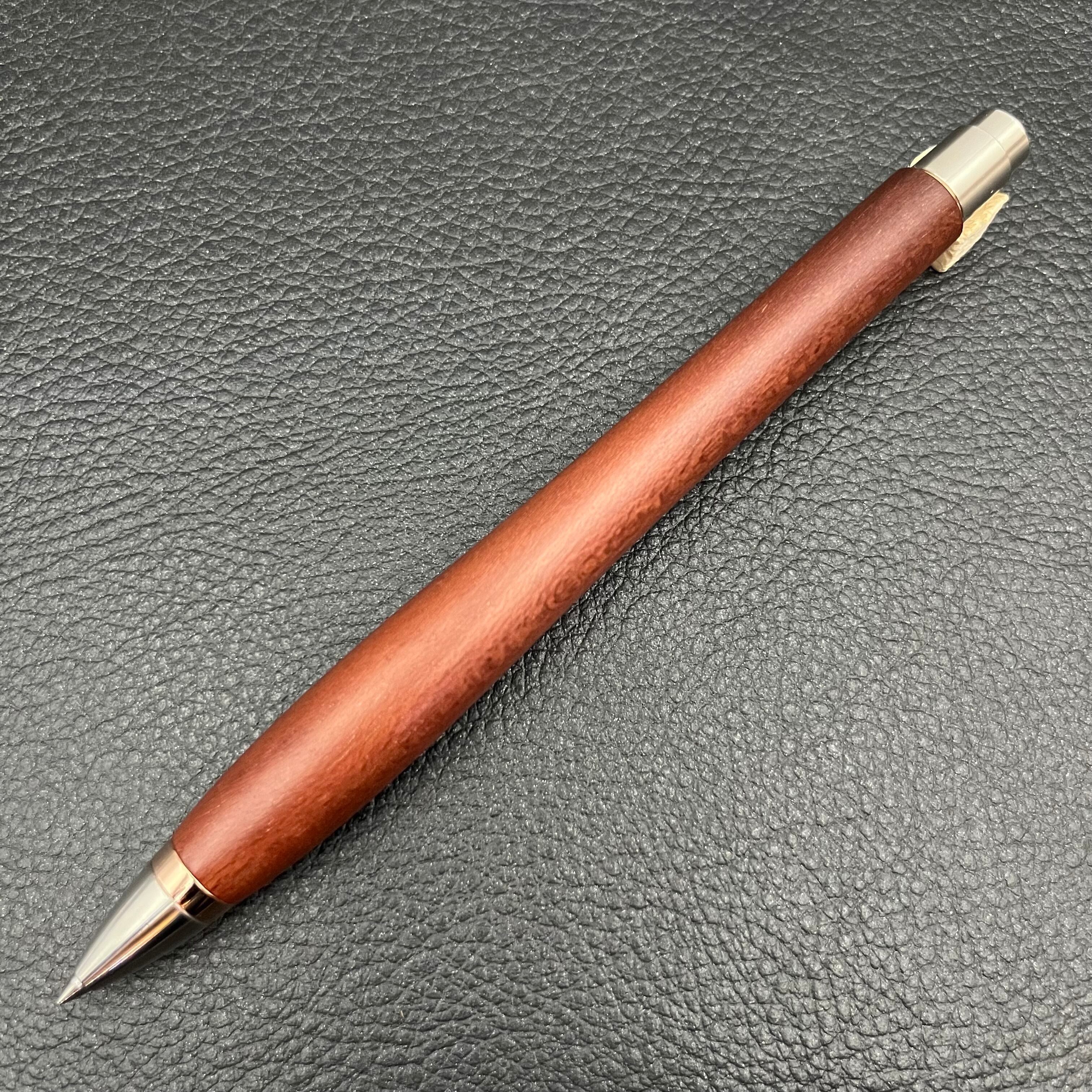 ・沖縄のアカギでペンを制作しました。日本では赤色の木は珍しく時間が経つと濃い茶色になります。