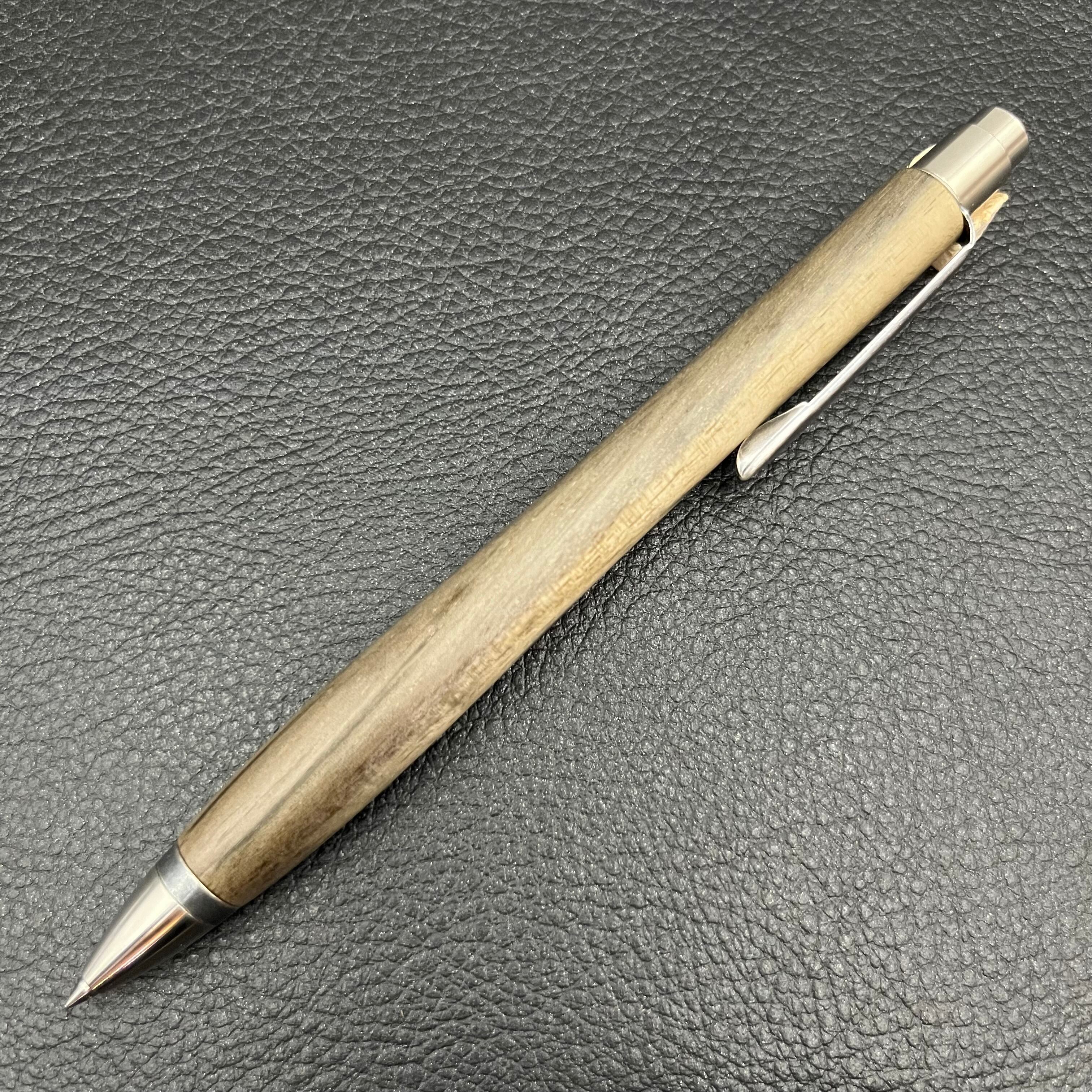 ボールペンのノックシステムは、ドイツ最高のクリックメカニズムを採用してあります。このメカニズムはユニークな機構のため、クリックしたときのカチカチ音が静かで、どんな場所でも気兼ねなく使うことができます。滑らかに動くこのプッシュ感覚を一度味わうと他には戻れなくなってしまうほどの魅力があります。 100分の1単位の加工精度で削り出されたペン先は、軸ブレも全くありません。