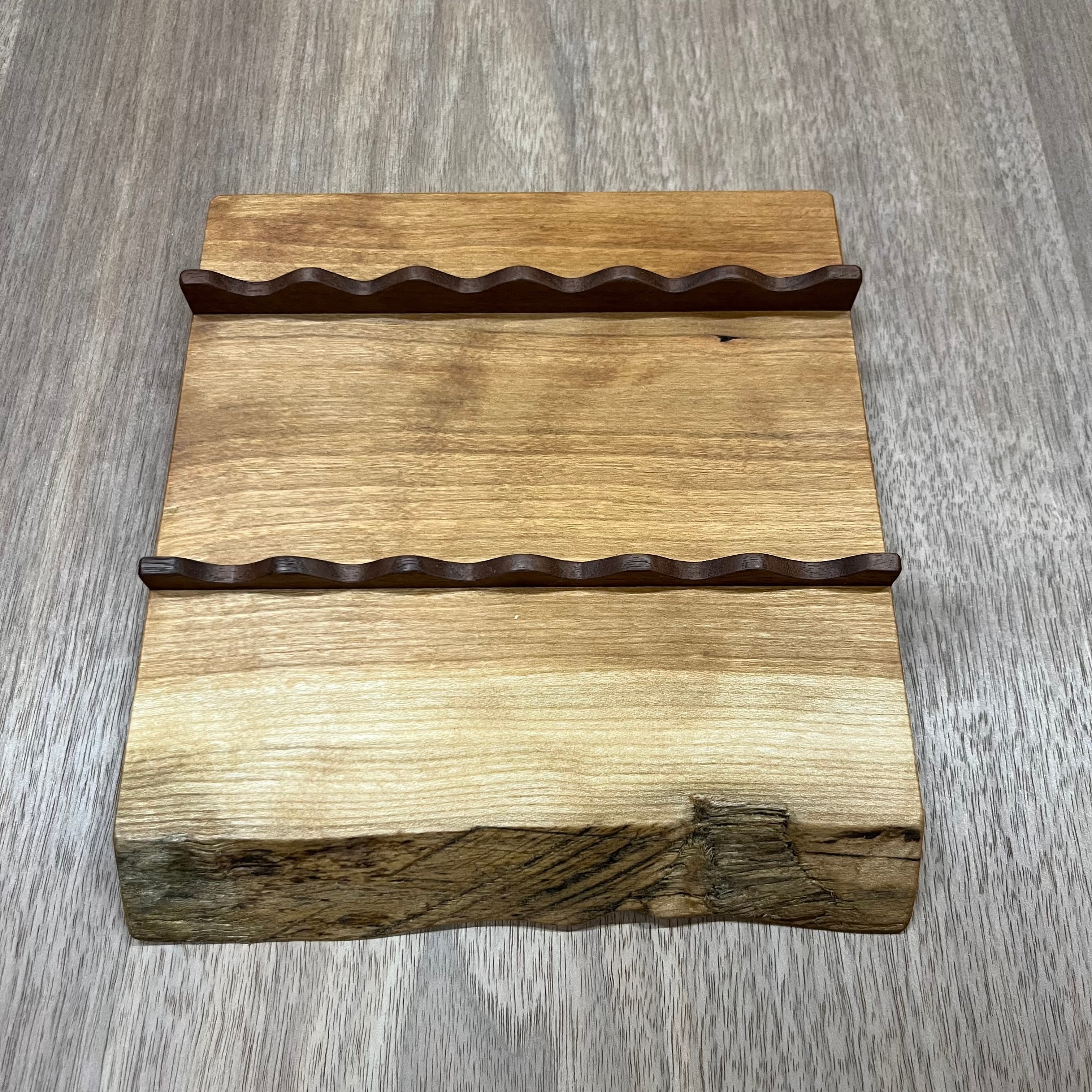 耳付き一枚板を天然オイルで仕上げてあり、ペンの長さや太さが違っても置けるように作られています。