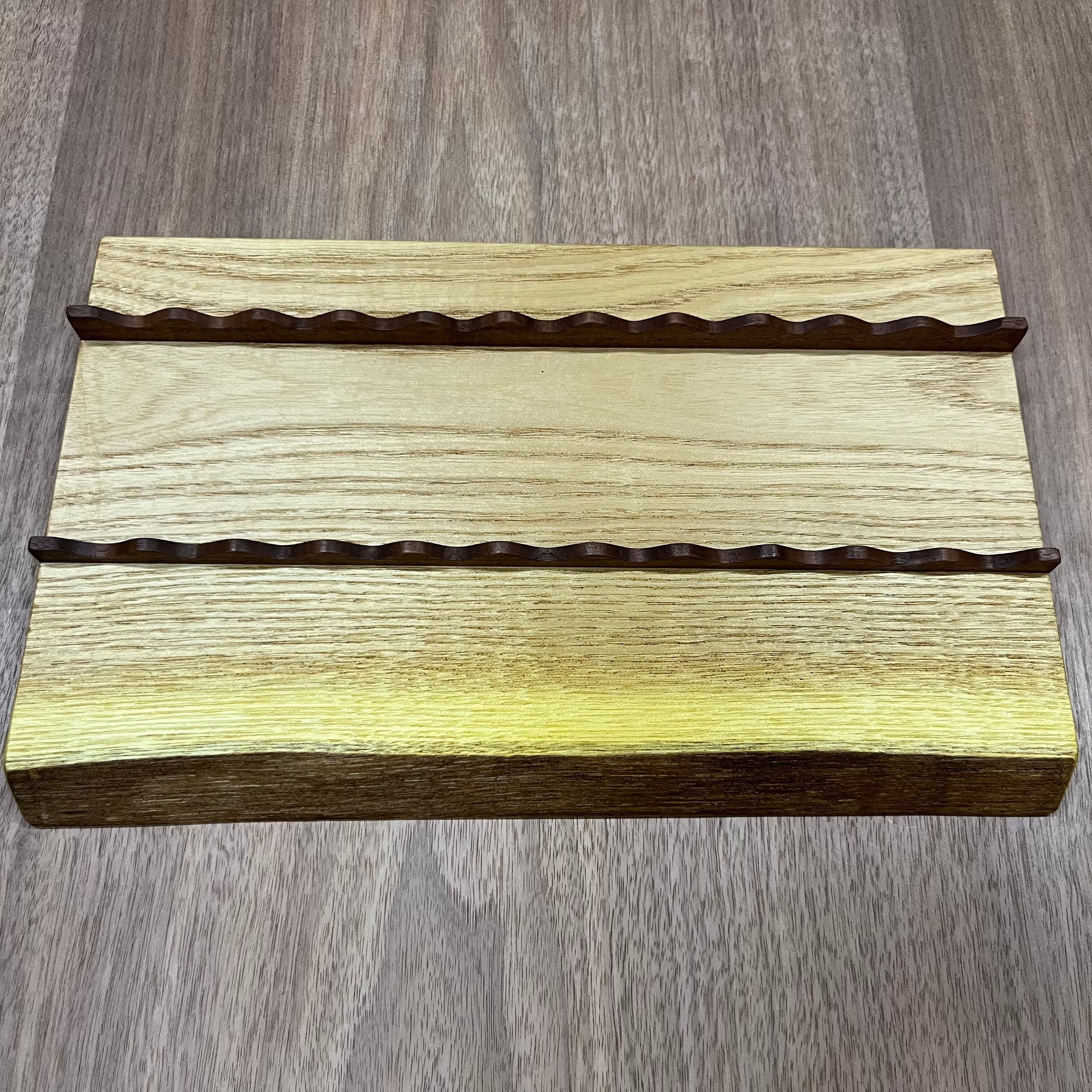 耳付き一枚板を天然オイルで仕上げてあり、ペンの長さや太さが違っても置けるように作られています。