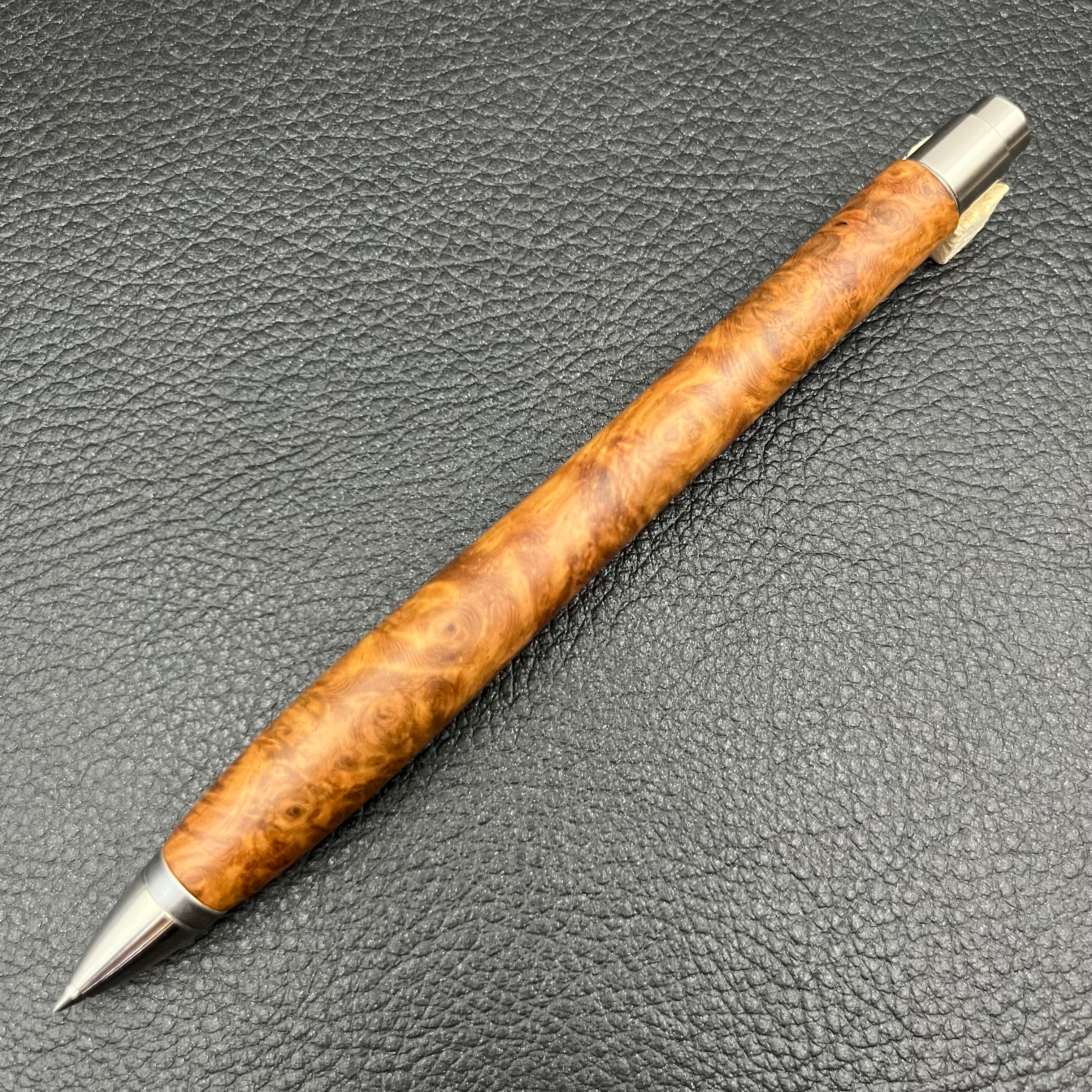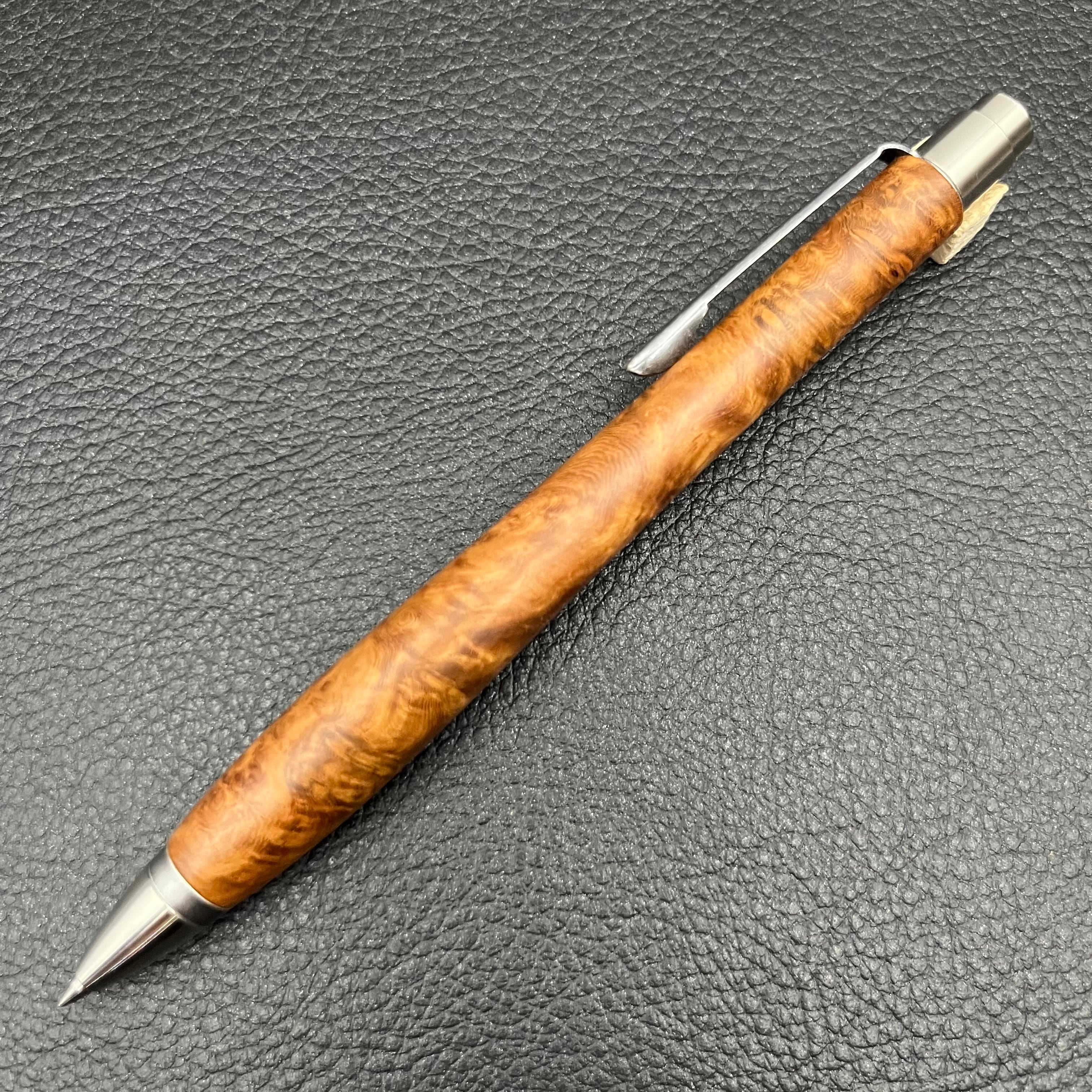 ボールペンのノックシステムは、ドイツ最高のクリックメカニズムを採用してあります。このメカニズムはユニークな機構のため、クリックしたときのカチカチ音が静かで、どんな場所でも気兼ねなく使うことができます。滑らかに動くこのプッシュ感覚を一度味わうと他には戻れなくなってしまうほどの魅力があります。 100分の1単位の加工精度で削り出されたペン先は、軸ブレも全くありません。
