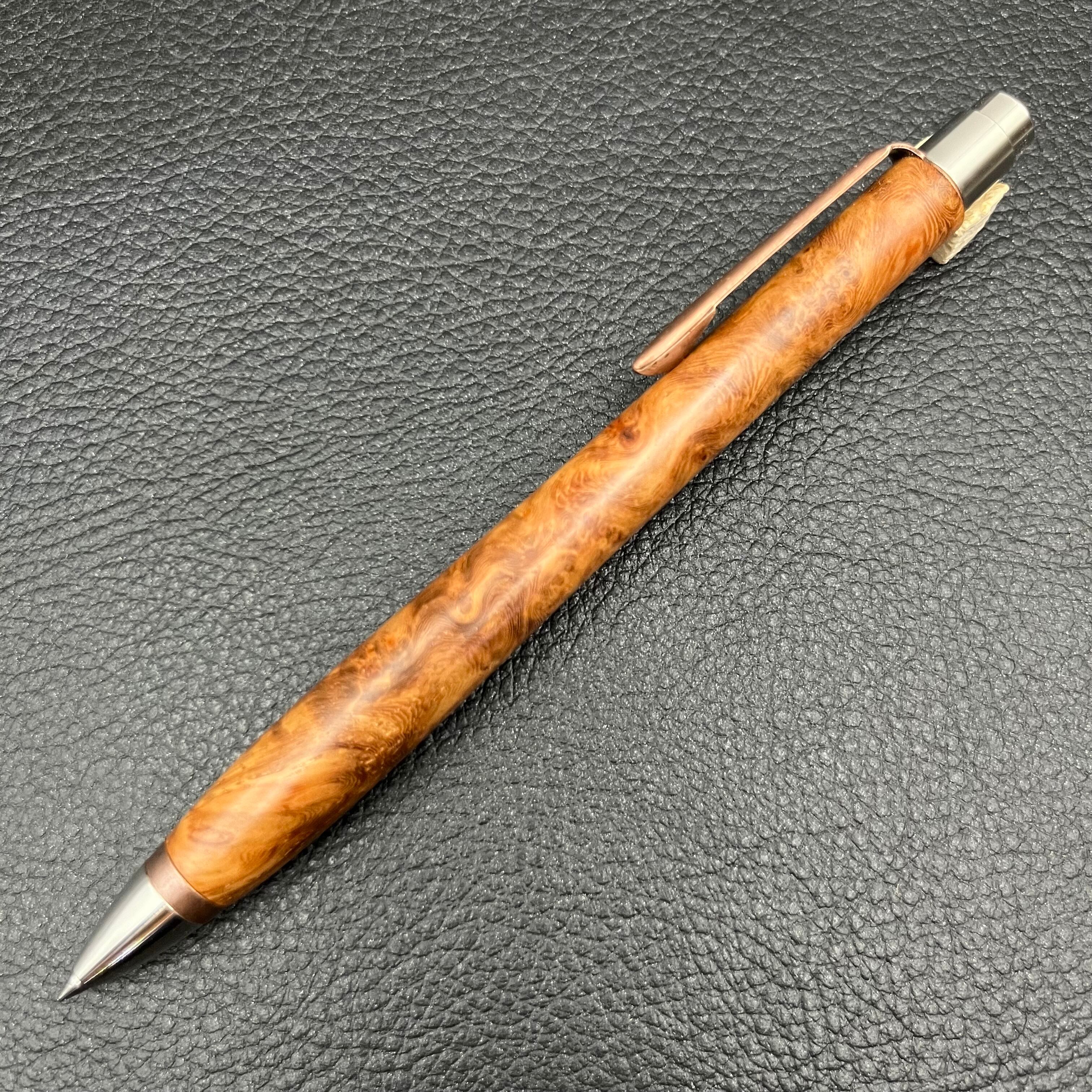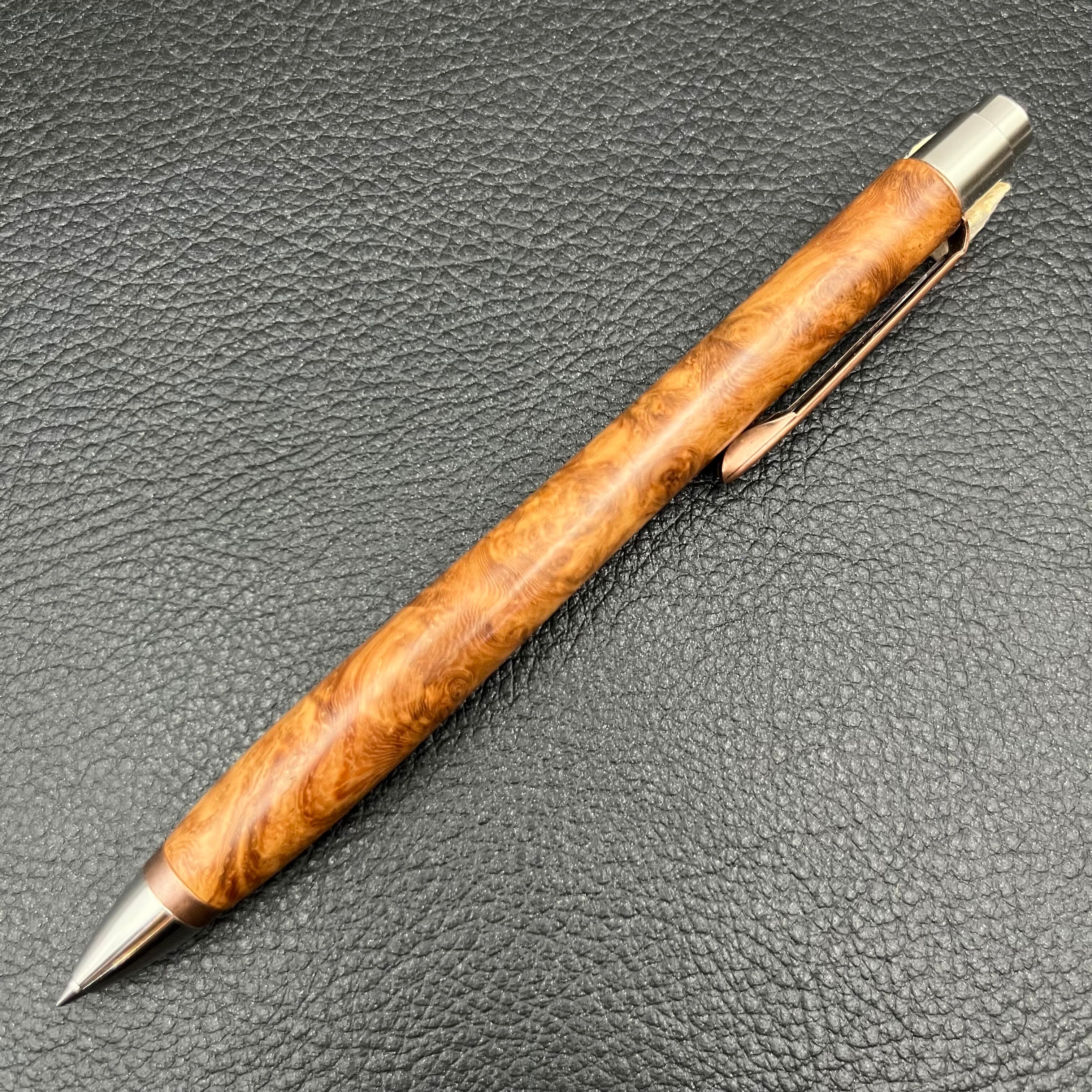 ボールペンのノックシステムは、ドイツ最高のクリックメカニズムを採用してあります。このメカニズムはユニークな機構のため、クリックしたときのカチカチ音が静かで、どんな場所でも気兼ねなく使うことができます。滑らかに動くこのプッシュ感覚を一度味わうと他には戻れなくなってしまうほどの魅力があります。 100分の1単位の加工精度で削り出されたペン先は、軸ブレも全くありません。