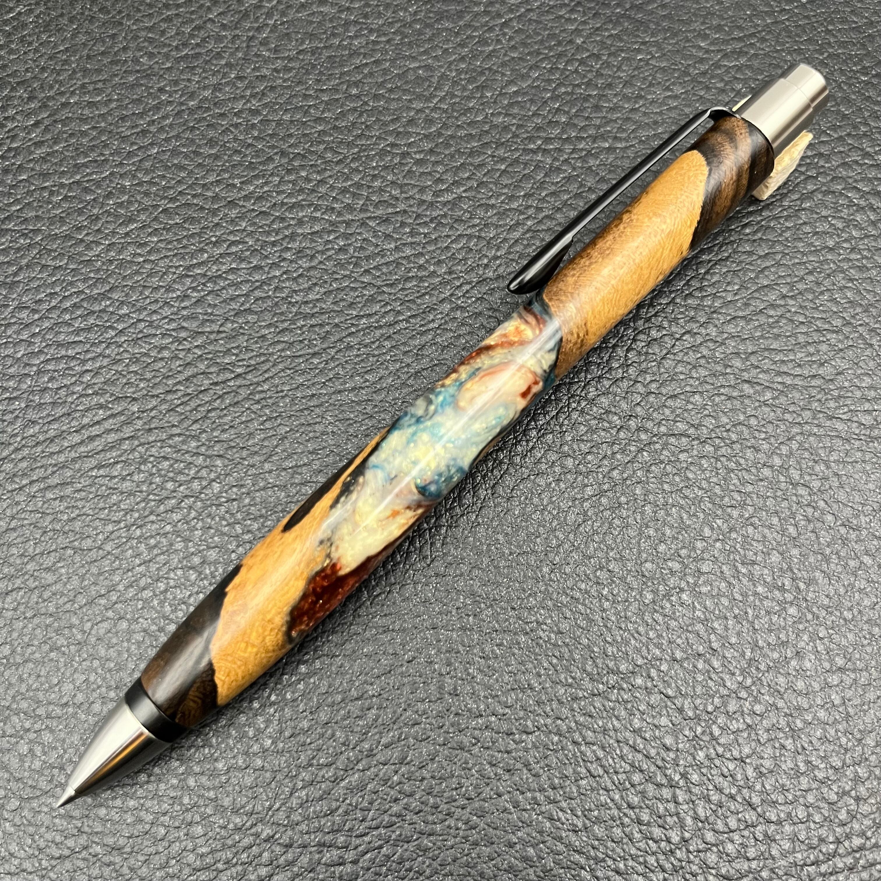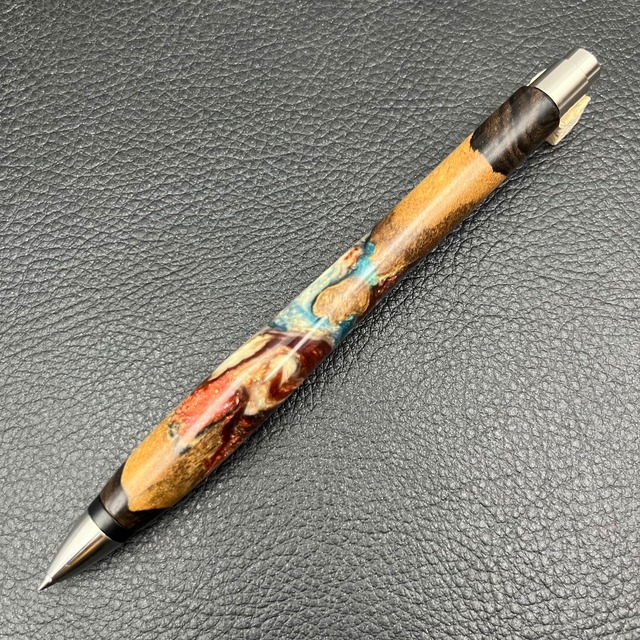 ボールペンのノックシステムは、ドイツ最高のクリックメカニズムを採用してあります。このメカニズムはユニークな機構のため、クリックしたときのカチカチ音が静かで、どんな場所でも気兼ねなく使うことができます。滑らかに動くこのプッシュ感覚を一度味わうと他には戻れなくなってしまうほどの魅力があります。 100分の1単位の加工精度で削り出されたペン先は、軸ブレも全くありません。