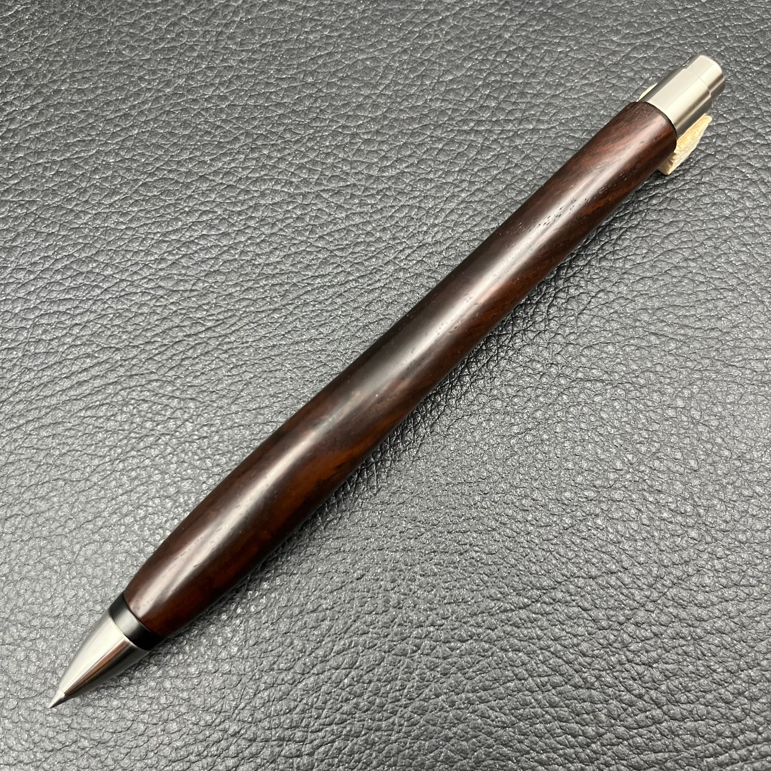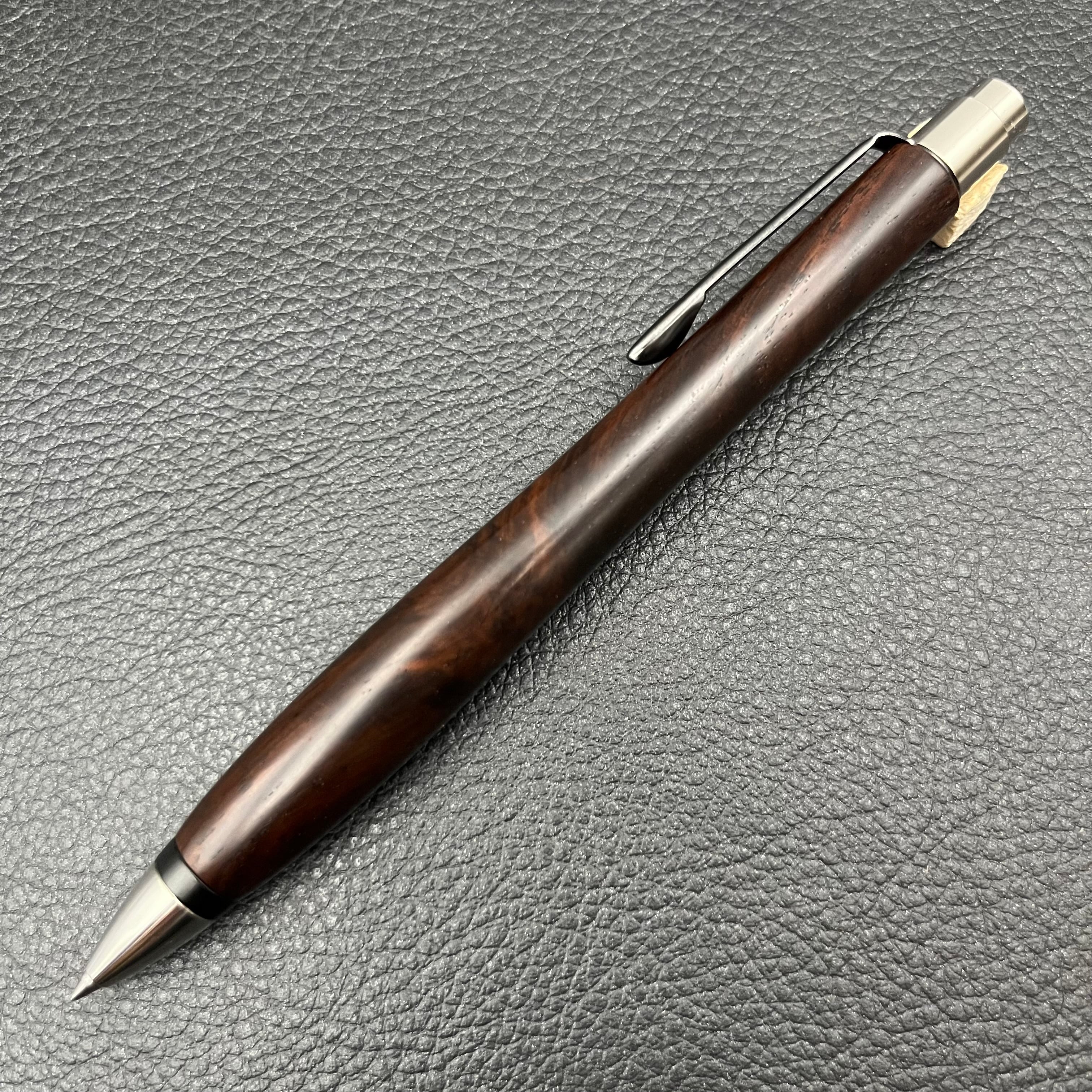 ボールペンのノックシステムは、ドイツ最高のクリックメカニズムを採用してあります。このメカニズムはユニークな機構のため、クリックしたときのカチカチ音が静かで、どんな場所でも気兼ねなく使うことができます。滑らかに動くこのプッシュ感覚を一度味わうと他には戻れなくなってしまうほどの魅力があります。 100分の1単位の加工精度で削り出されたペン先は、軸ブレも全くありません。