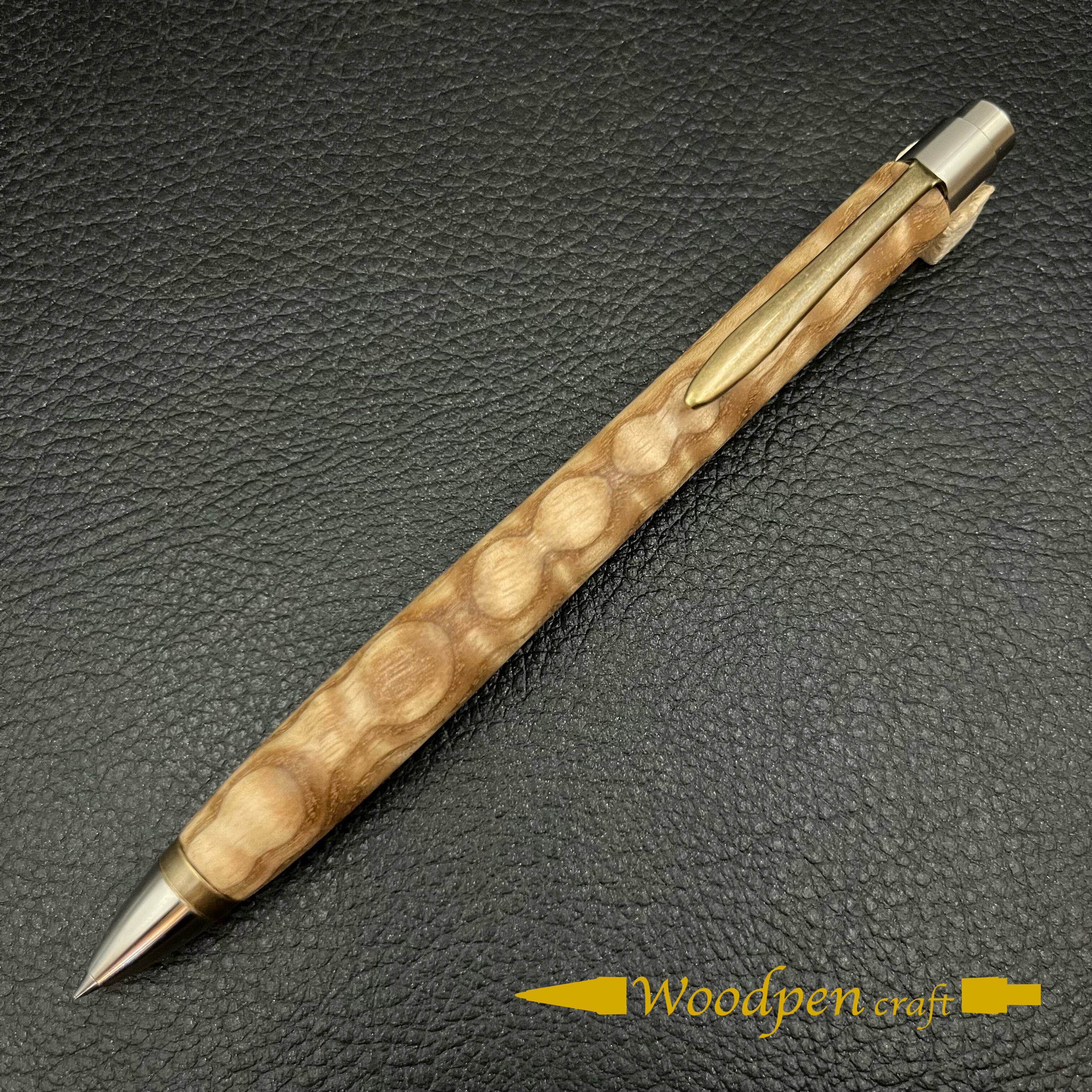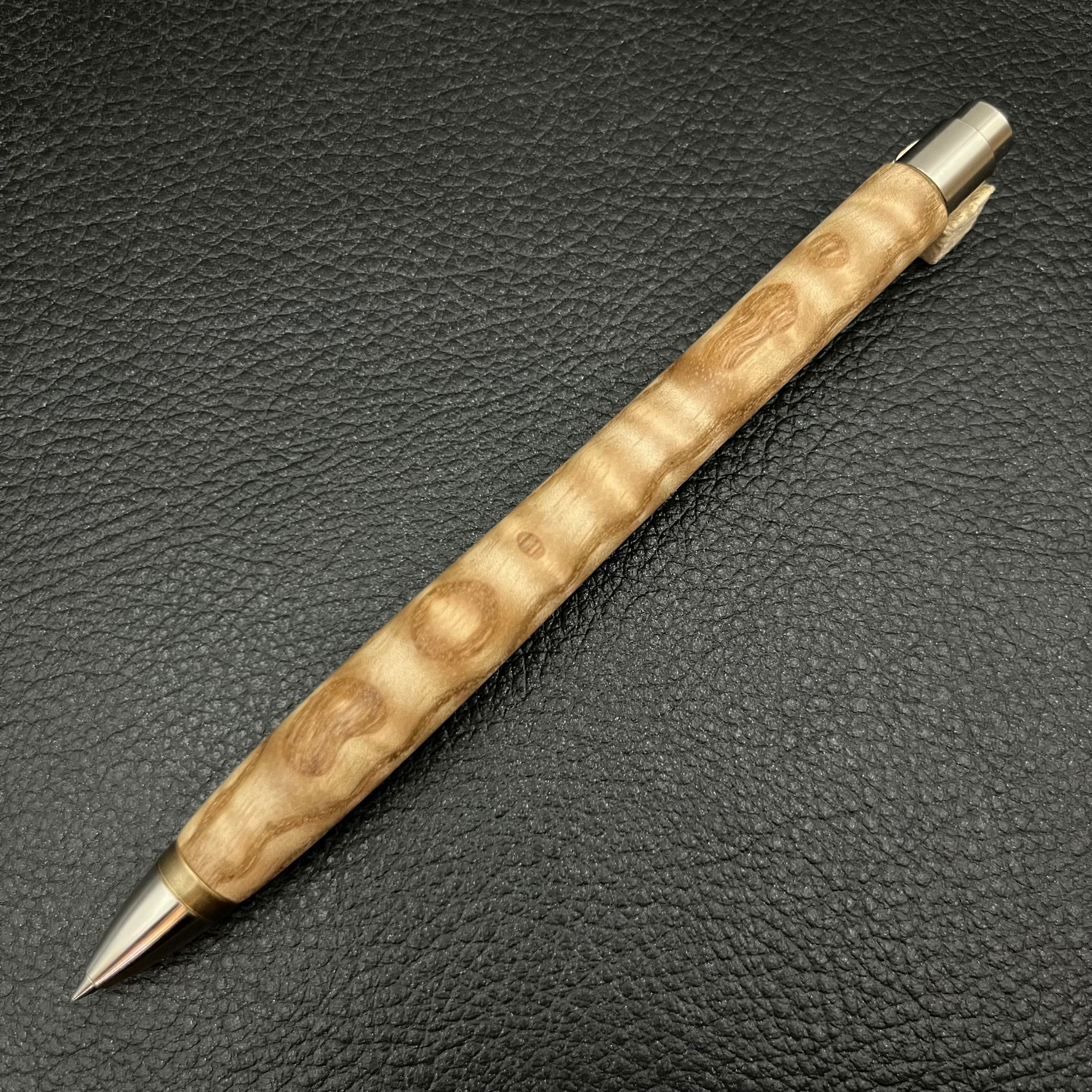 ボールペンのノックシステムは、ドイツ最高のクリックメカニズムを採用してあります。このメカニズムはユニークな機構のため、クリックしたときのカチカチ音が静かで、どんな場所でも気兼ねなく使うことができます。滑らかに動くこのプッシュ感覚を一度味わうと他には戻れなくなってしまうほどの魅力があります。 100分の1単位の加工精度で削り出されたペン先は、軸ブレも全くありません。