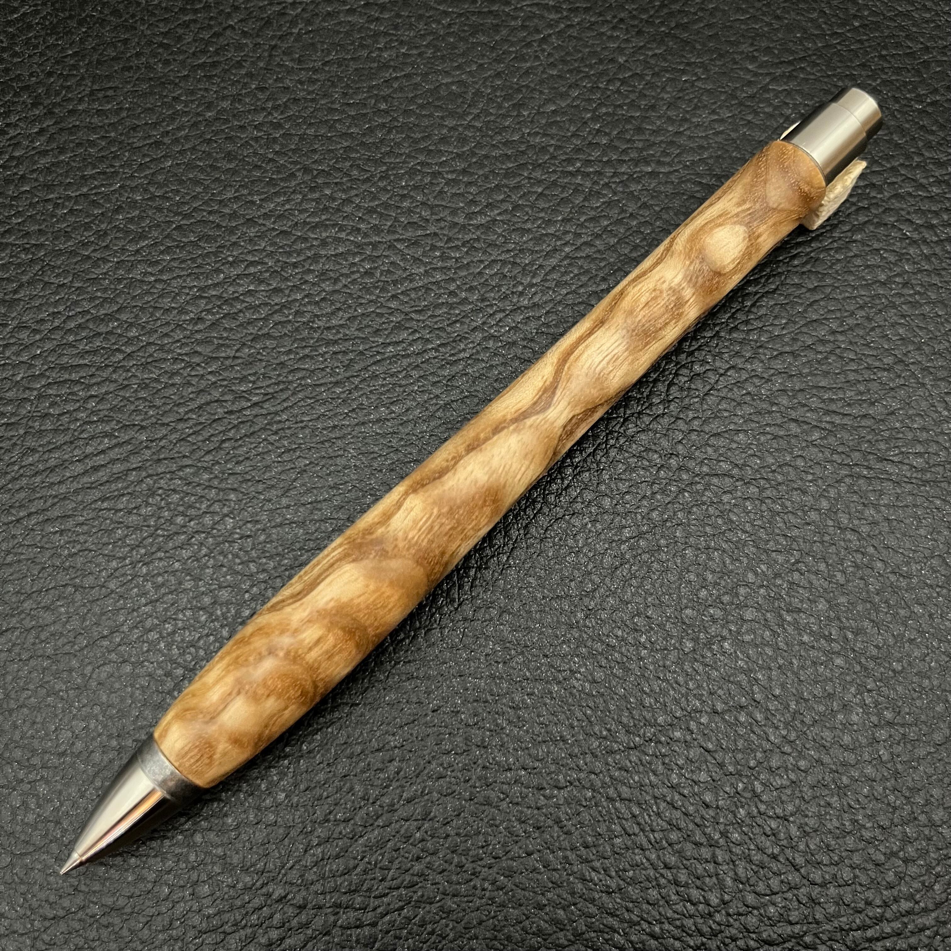 ボールペンのノックシステムは、ドイツ最高のクリックメカニズムを採用してあります。このメカニズムはユニークな機構のため、クリックしたときのカチカチ音が静かで、どんな場所でも気兼ねなく使うことができます。滑らかに動くこのプッシュ感覚を一度味わうと他には戻れなくなってしまうほどの魅力があります。 100分の1単位の加工精度で削り出されたペン先は、軸ブレも全くありません。