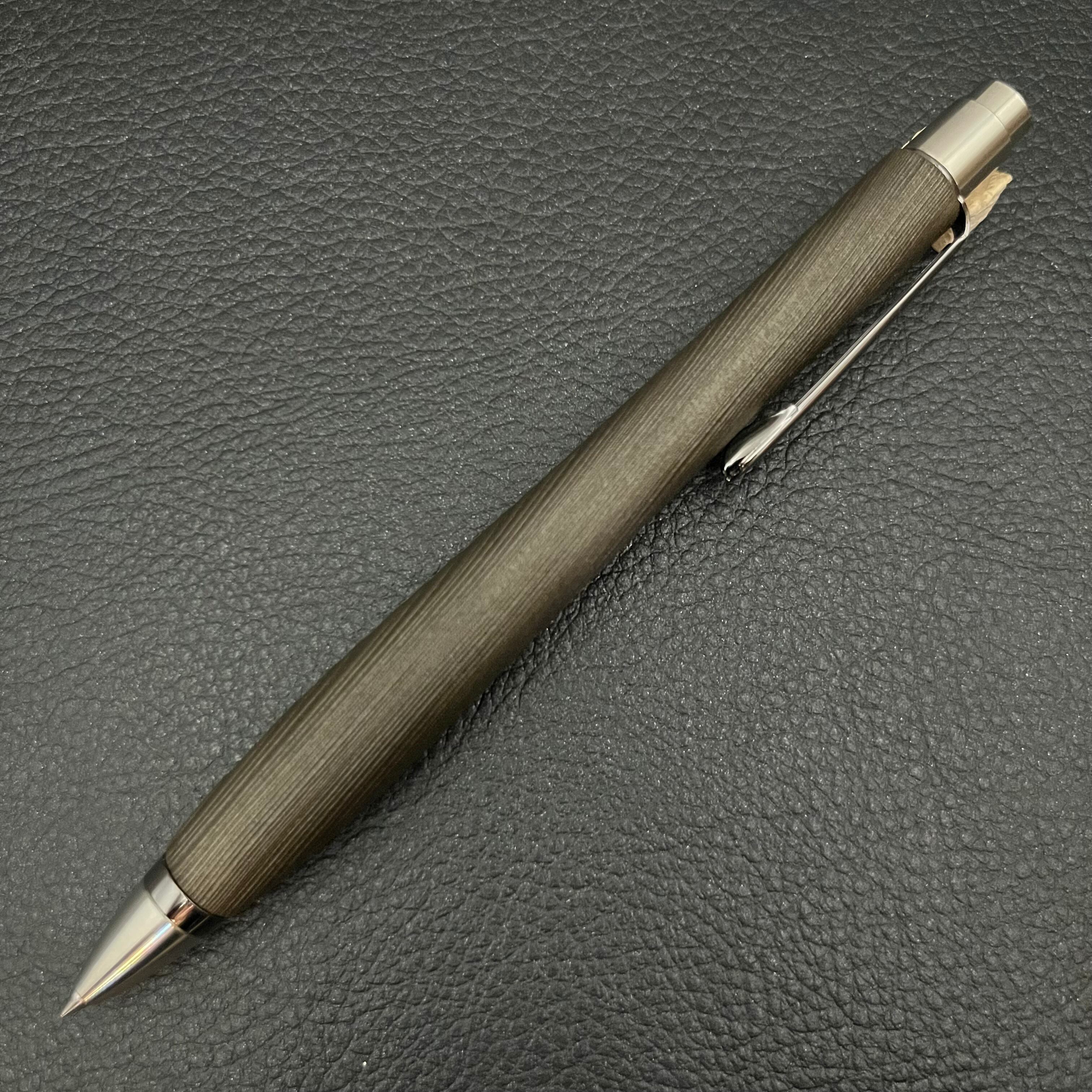 ボールペンのノックシステムは、ドイツ最高のクリックメカニズムを採用してあります。このメカニズムはユニークな機構のため、クリックしたときのカチカチ音が静かで、どんな場所でも気兼ねなく使うことができます。滑らかに動くこのプッシュ感覚を一度味わうと他には戻れなくなってしまうほどの魅力があります。 100分の1単位の加工精度で削り出されたペン先は、軸ブレも全くありません。