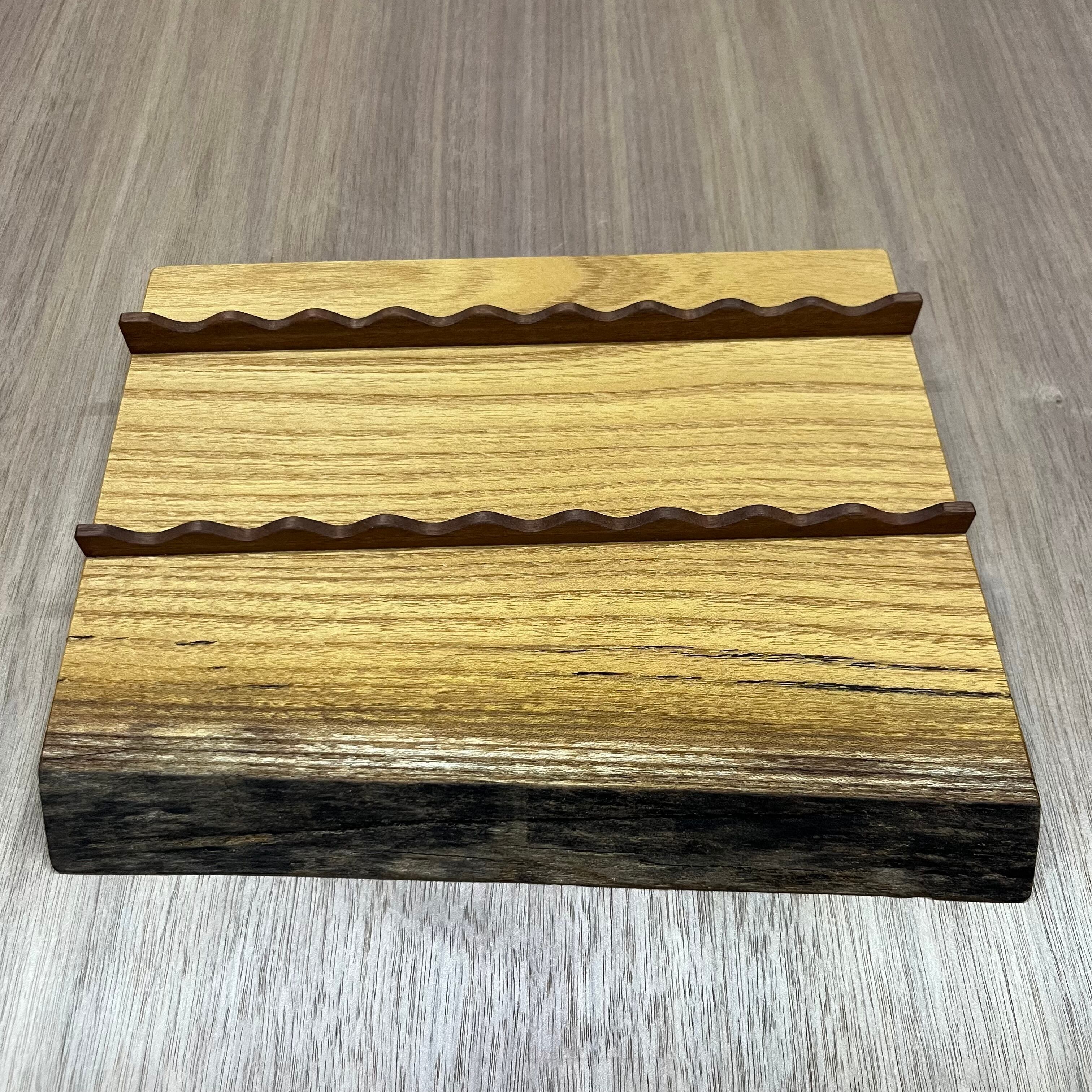 耳付き一枚板を天然オイルで仕上げてあり、ペンの長さや太さが違っても置けるように作られています。