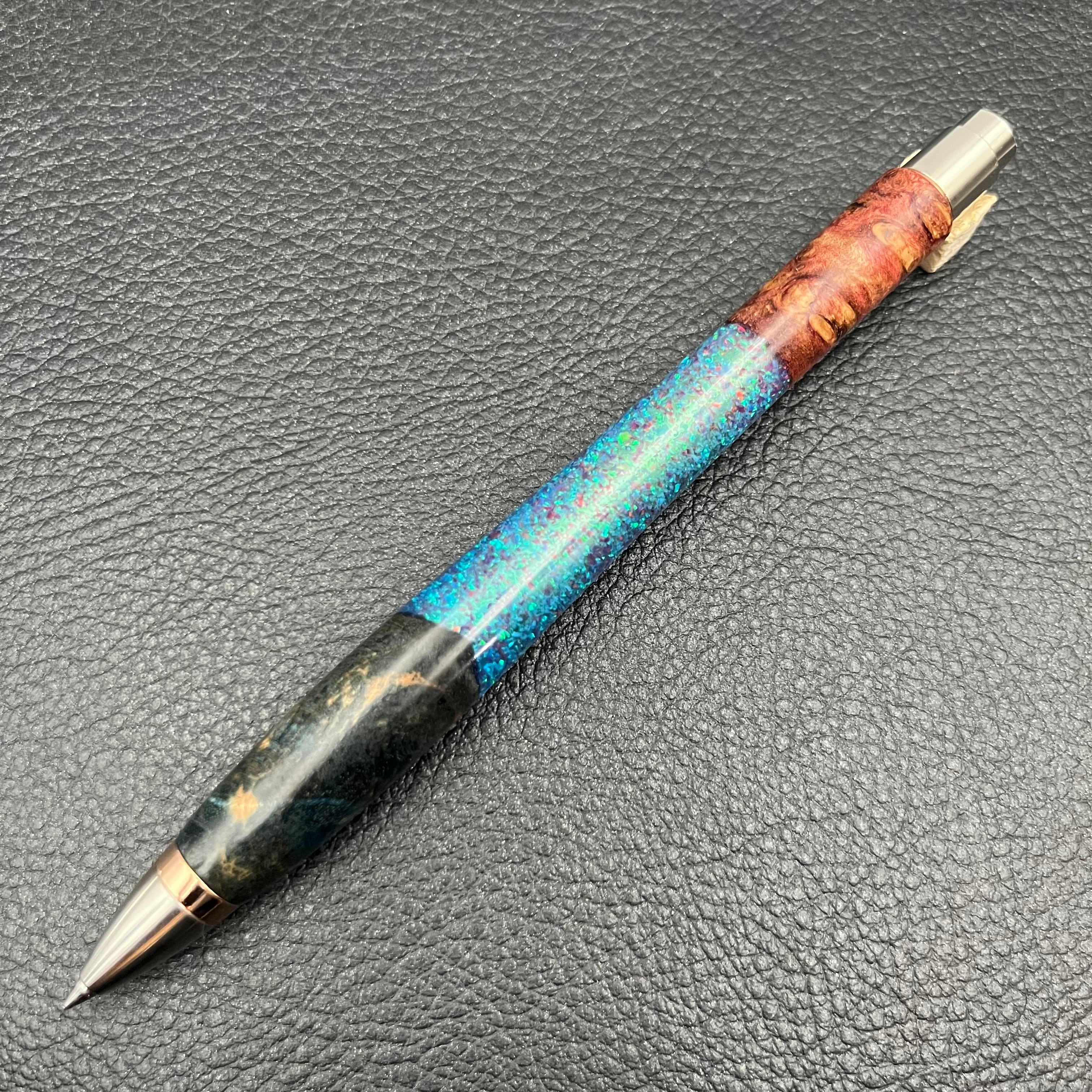ボールペンのノックシステムは、ドイツ最高のクリックメカニズムを採用してあります。このメカニズムはユニークな機構のため、クリックしたときのカチカチ音が静かで、どんな場所でも気兼ねなく使うことができます。滑らかに動くこのプッシュ感覚を一度味わうと他には戻れなくなってしまうほどの魅力があります。 100分の1単位の加工精度で削り出されたペン先は、軸ブレも全くありません。