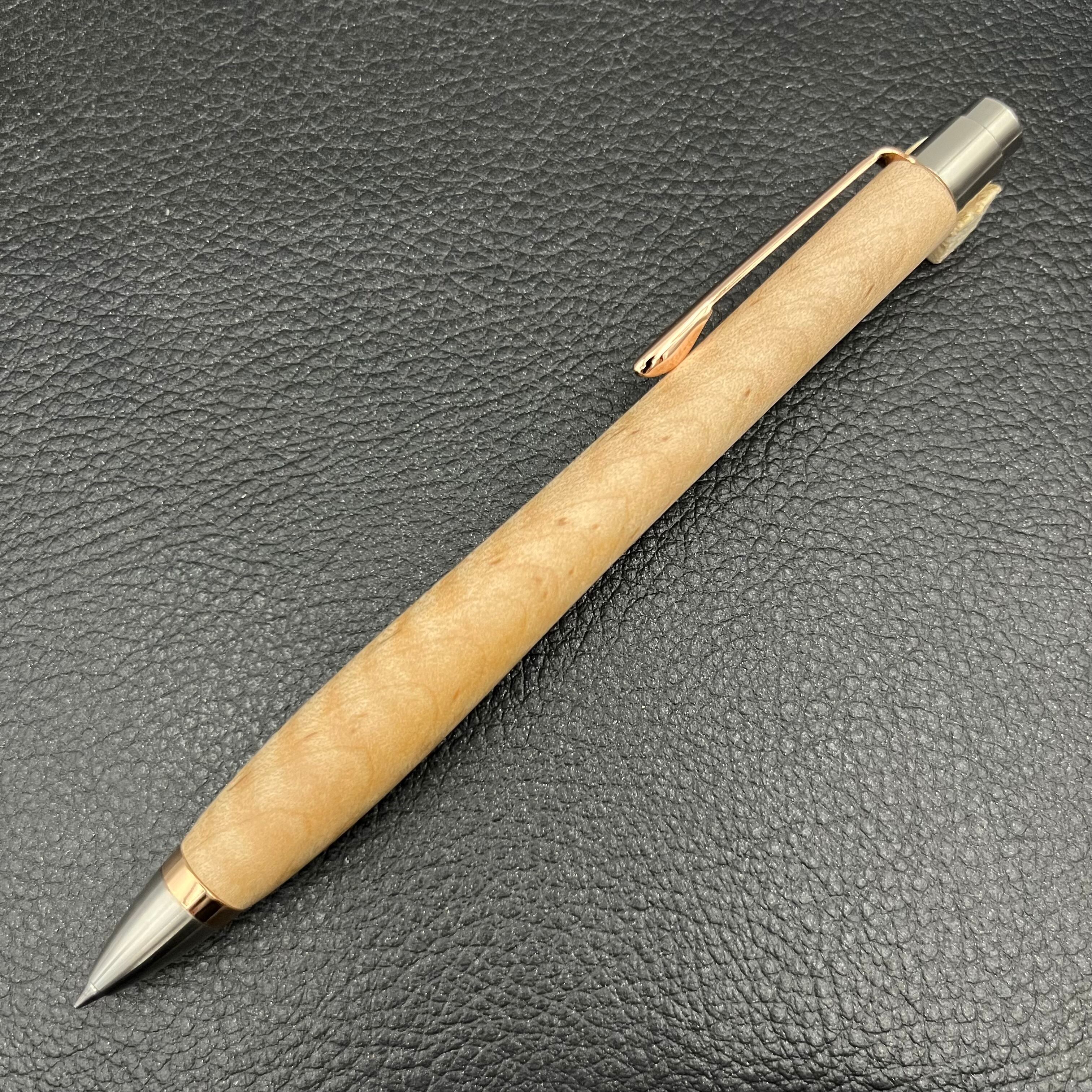 ボールペンのノックシステムは、ドイツ最高のクリックメカニズムを採用してあります。このメカニズムはユニークな機構のため、クリックしたときのカチカチ音が静かで、どんな場所でも気兼ねなく使うことができます。滑らかに動くこのプッシュ感覚を一度味わうと他には戻れなくなってしまうほどの魅力があります。 100分の1単位の加工精度で削り出されたペン先は、軸ブレも全くありません。