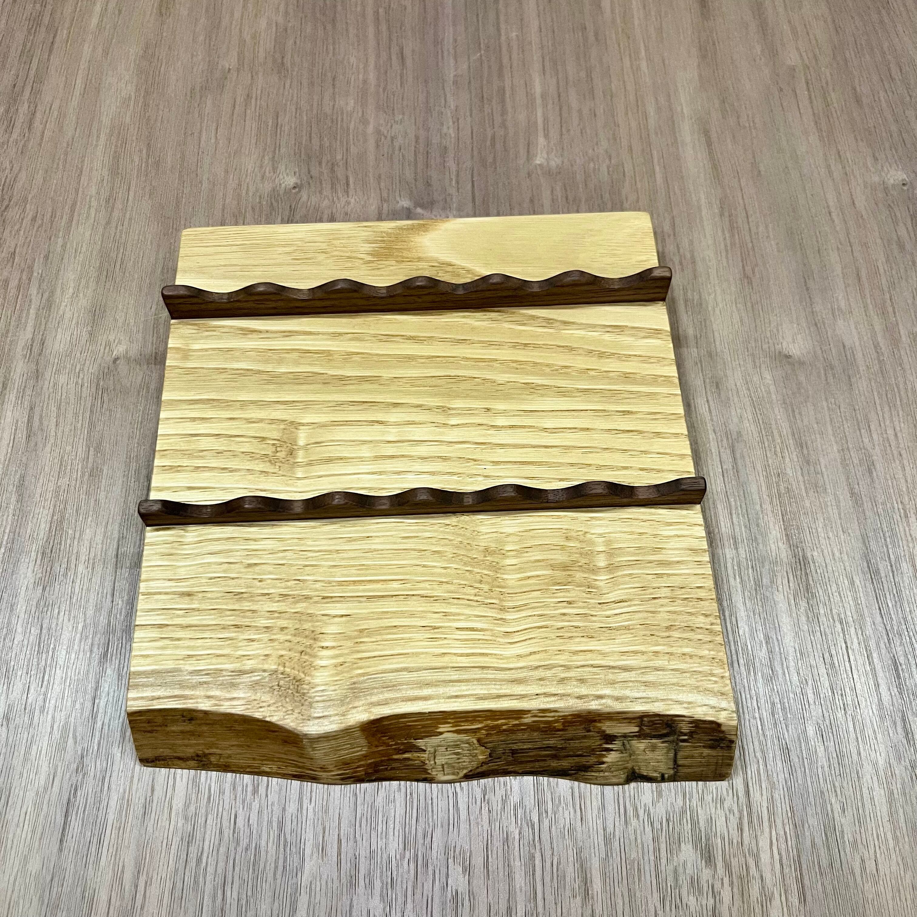 耳付き一枚板を天然オイルで仕上げてあり、ペンの長さや太さが違っても置けるように作られています。