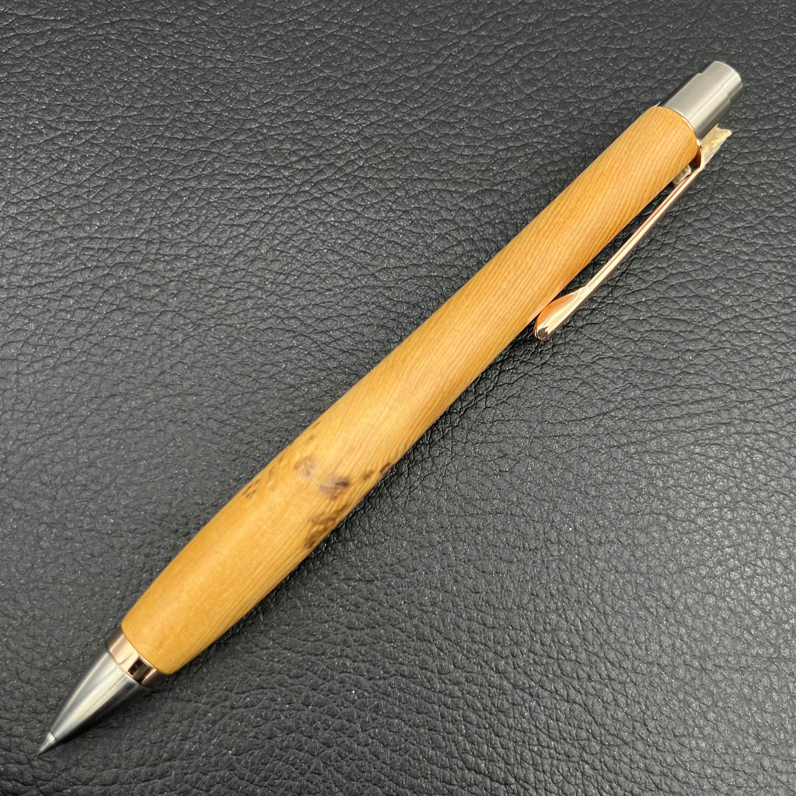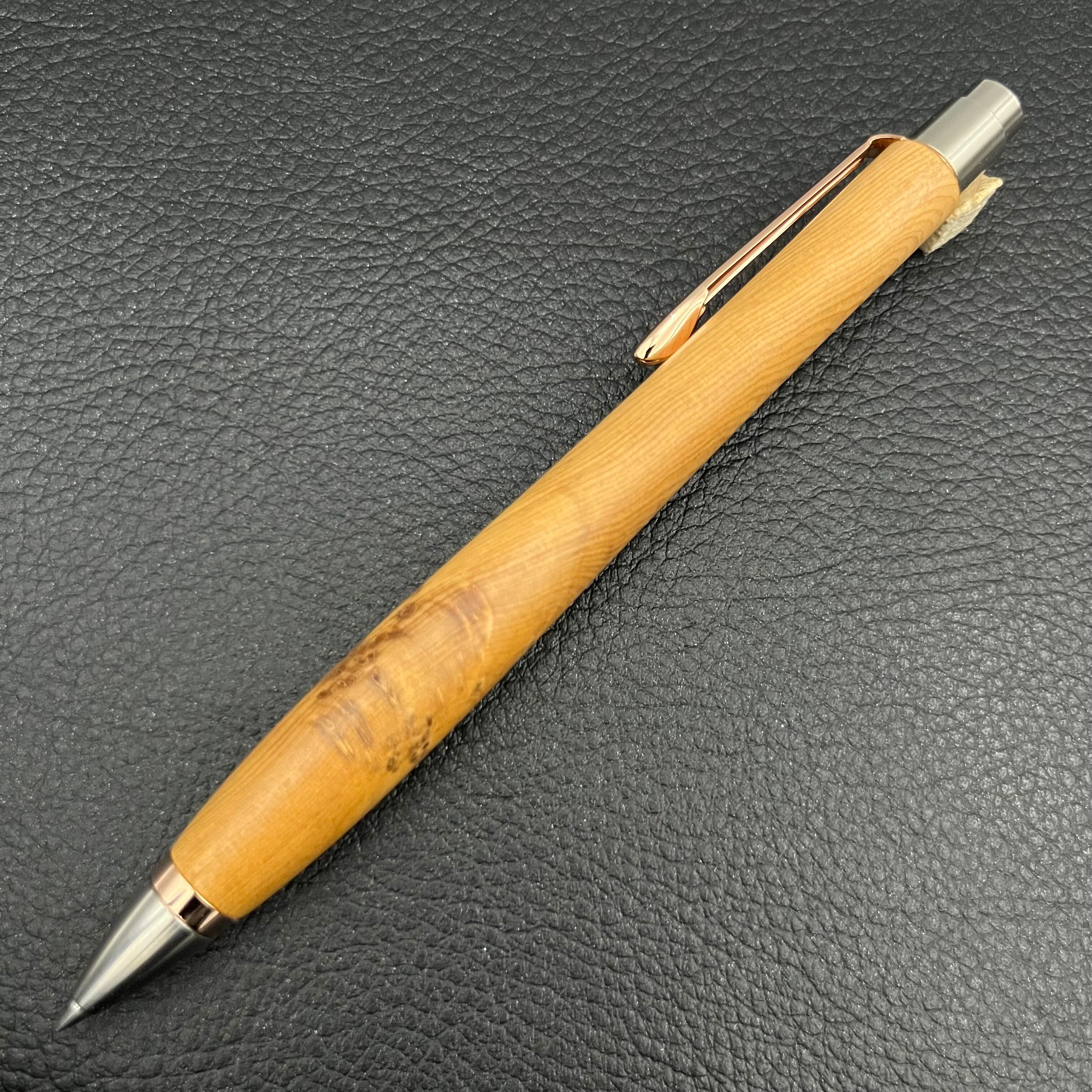 ボールペンのノックシステムは、ドイツ最高のクリックメカニズムを採用してあります。このメカニズムはユニークな機構のため、クリックしたときのカチカチ音が静かで、どんな場所でも気兼ねなく使うことができます。滑らかに動くこのプッシュ感覚を一度味わうと他には戻れなくなってしまうほどの魅力があります。 100分の1単位の加工精度で削り出されたペン先は、軸ブレも全くありません。