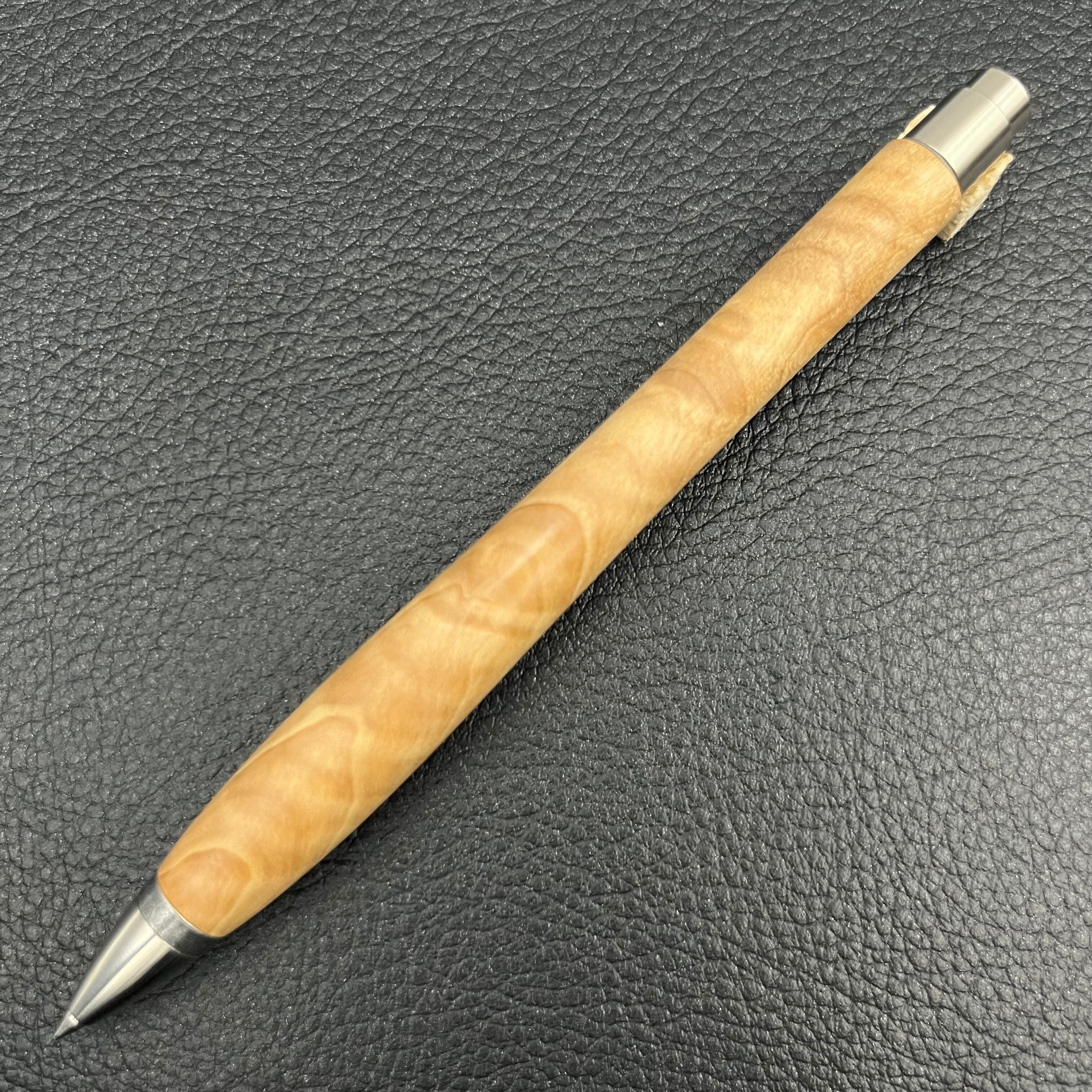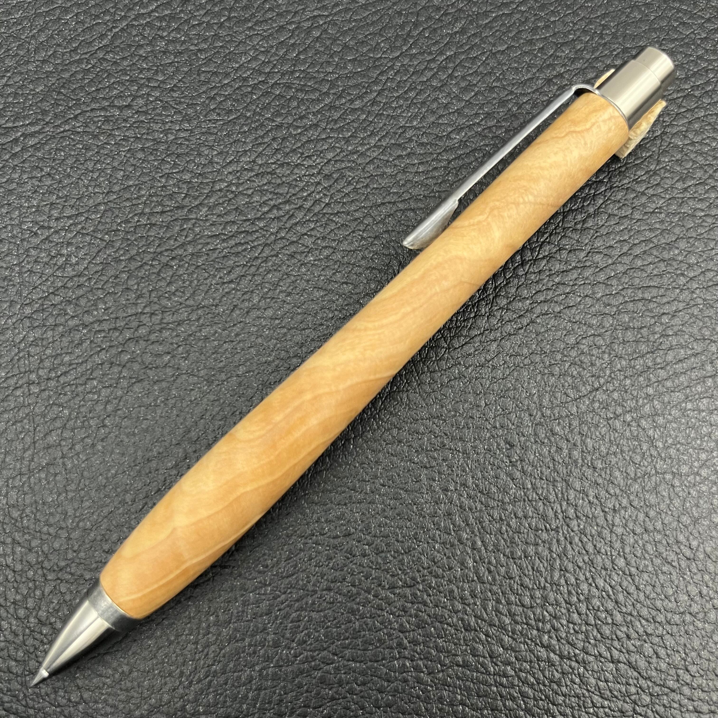 ボールペンのノックシステムは、ドイツ最高のクリックメカニズムを採用してあります。このメカニズムはユニークな機構のため、クリックしたときのカチカチ音が静かで、どんな場所でも気兼ねなく使うことができます。滑らかに動くこのプッシュ感覚を一度味わうと他には戻れなくなってしまうほどの魅力があります。 100分の1単位の加工精度で削り出されたペン先は、軸ブレも全くありません。