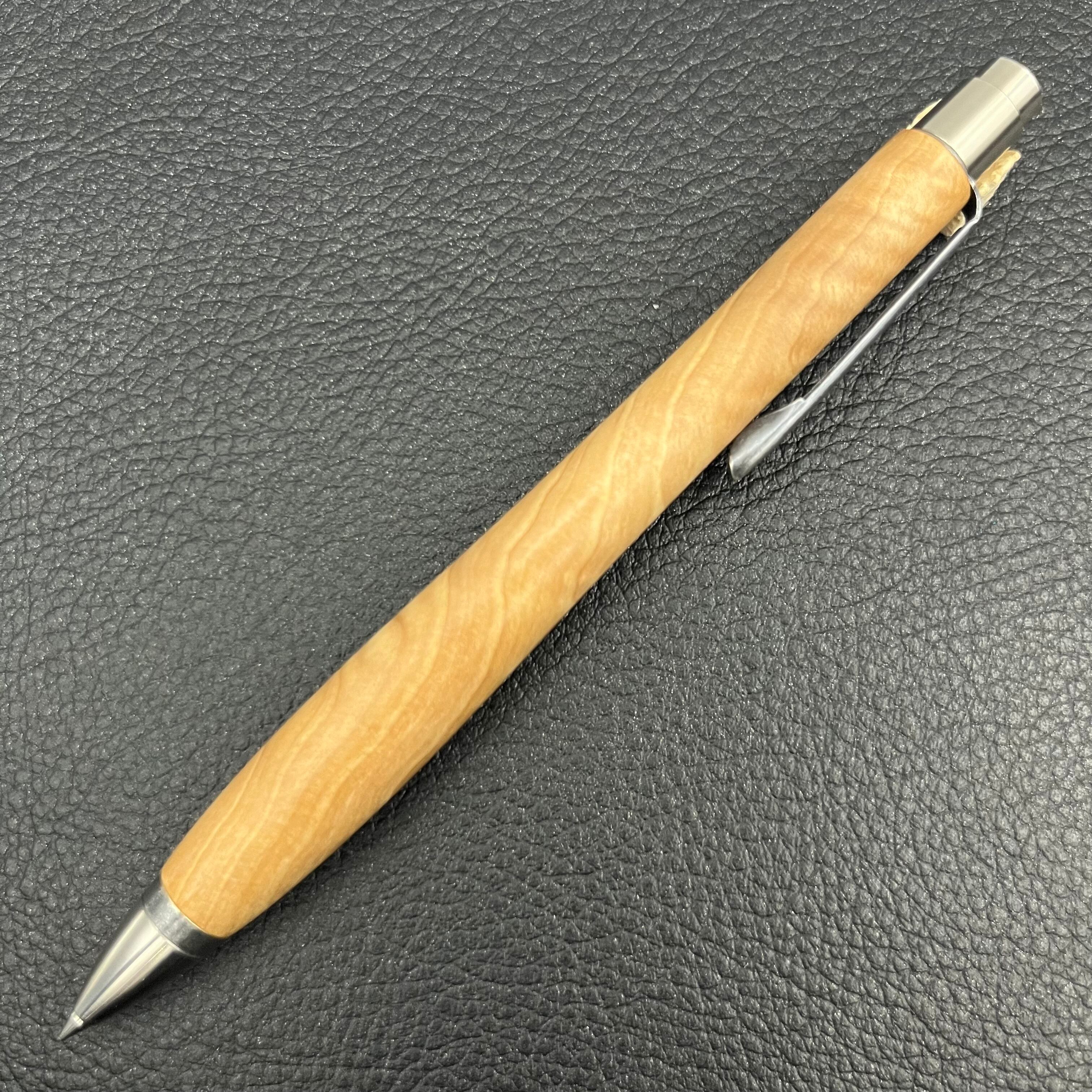 ボールペンのノックシステムは、ドイツ最高のクリックメカニズムを採用してあります。このメカニズムはユニークな機構のため、クリックしたときのカチカチ音が静かで、どんな場所でも気兼ねなく使うことができます。滑らかに動くこのプッシュ感覚を一度味わうと他には戻れなくなってしまうほどの魅力があります。 100分の1単位の加工精度で削り出されたペン先は、軸ブレも全くありません。