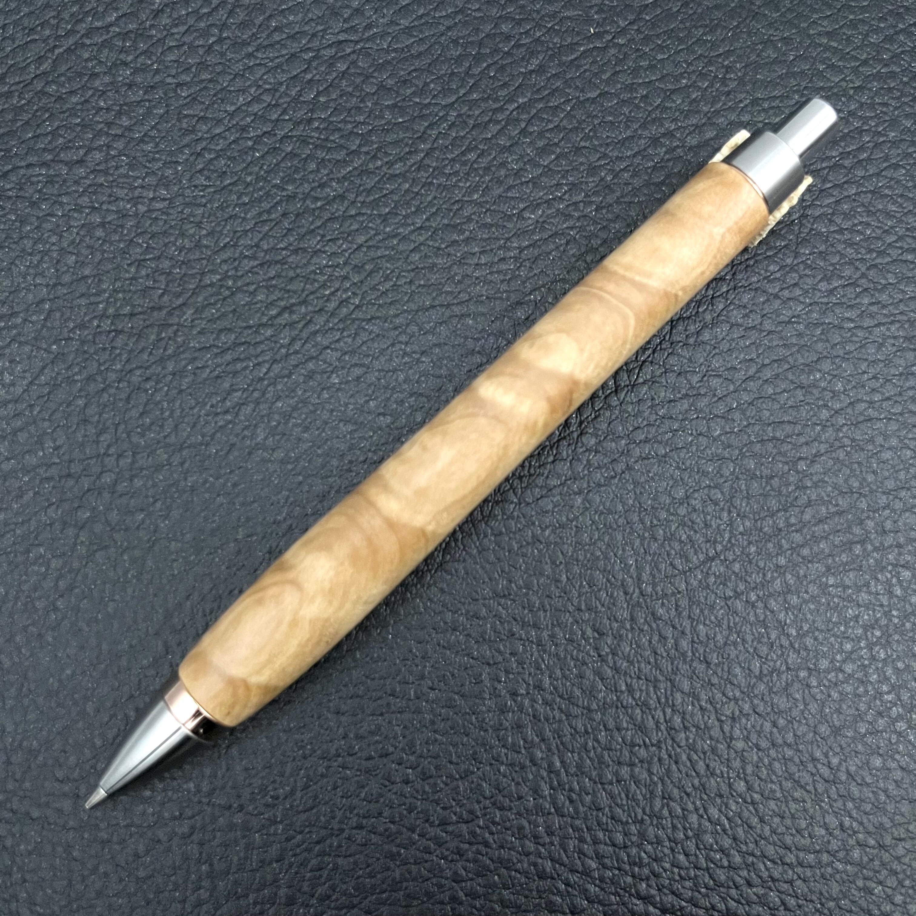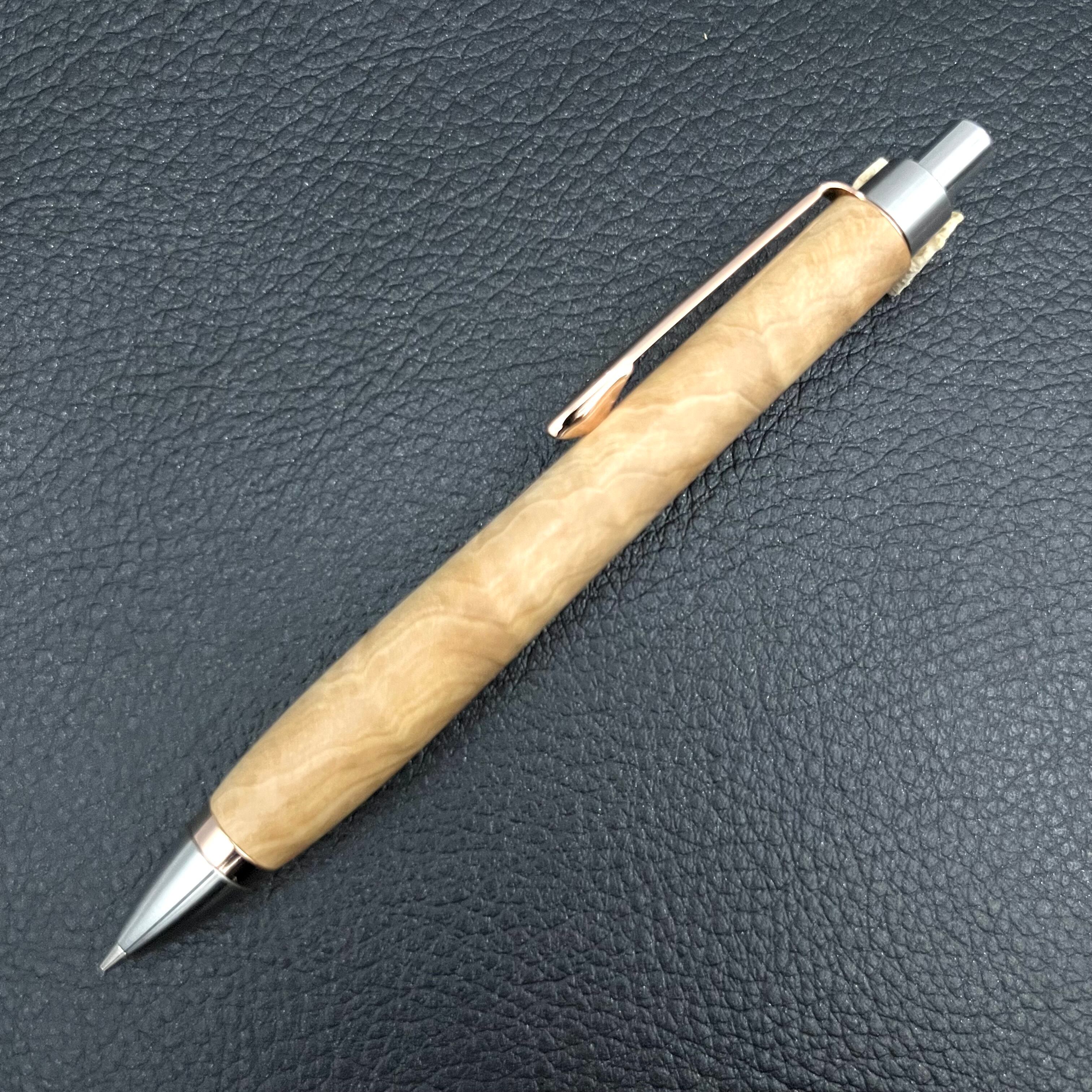 ペンシルは軸ブレが起こりにくい固定式口金を採用し、木の表情を最大限に楽しめる木軸の長さと、書き心地にこだわったバランスで金具を設計してあります。
