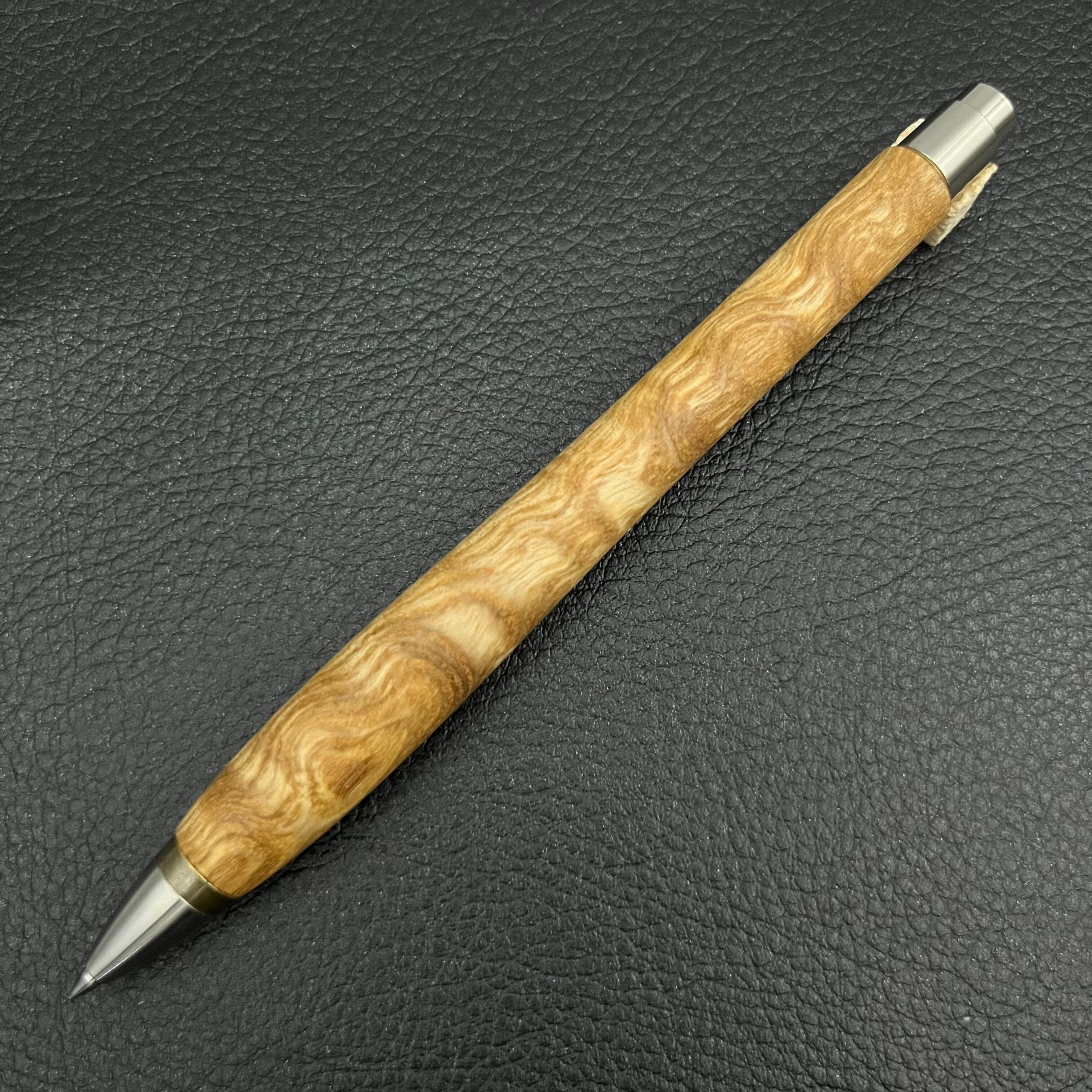 ボールペンのノックシステムは、ドイツ最高のクリックメカニズムを採用してあります。このメカニズムはユニークな機構のため、クリックしたときのカチカチ音が静かで、どんな場所でも気兼ねなく使うことができます。滑らかに動くこのプッシュ感覚を一度味わうと他には戻れなくなってしまうほどの魅力があります。 100分の1単位の加工精度で削り出されたペン先は、軸ブレも全くありません。