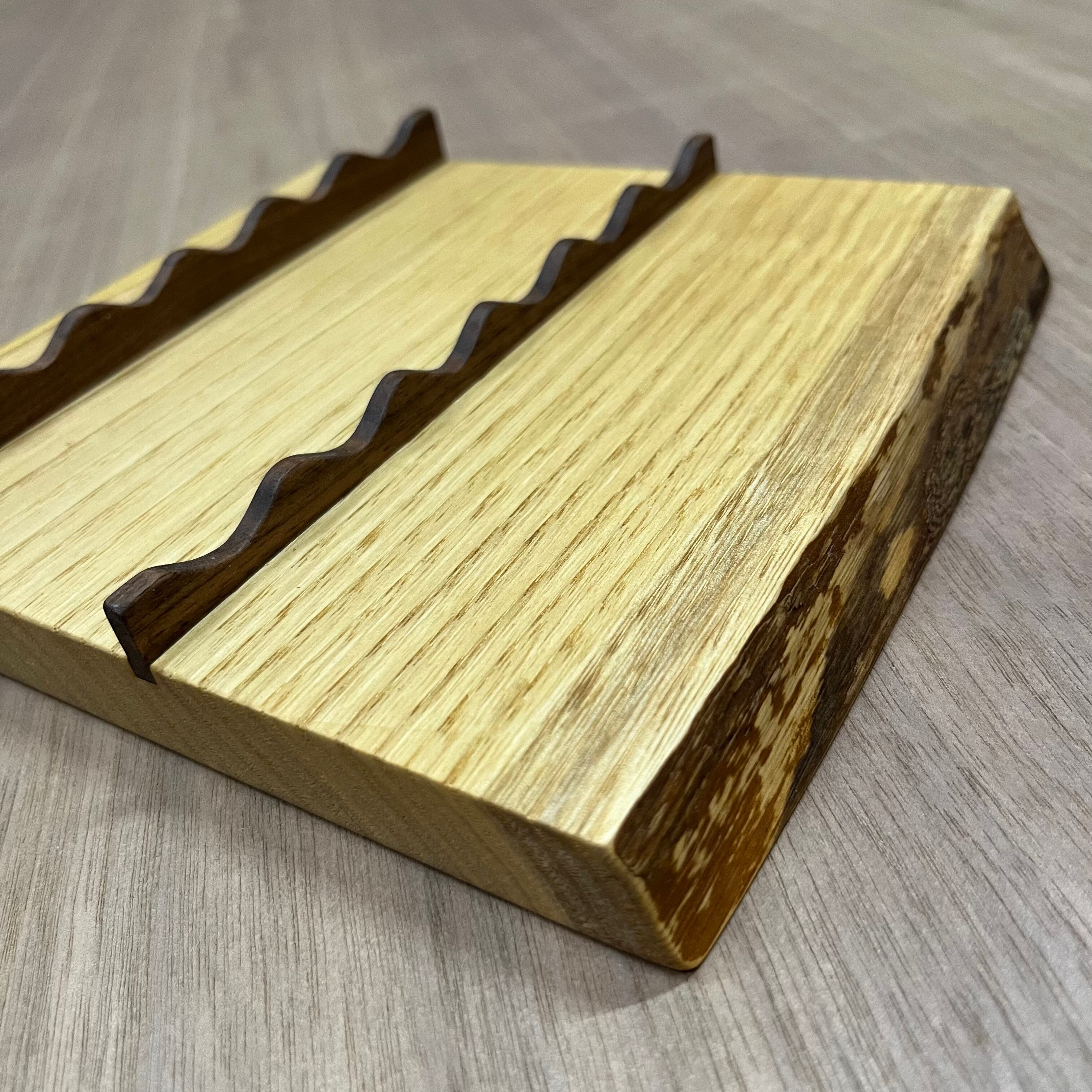 耳付き一枚板を天然オイルで仕上げてあり、ペンの長さや太さが違っても置けるように作られています。