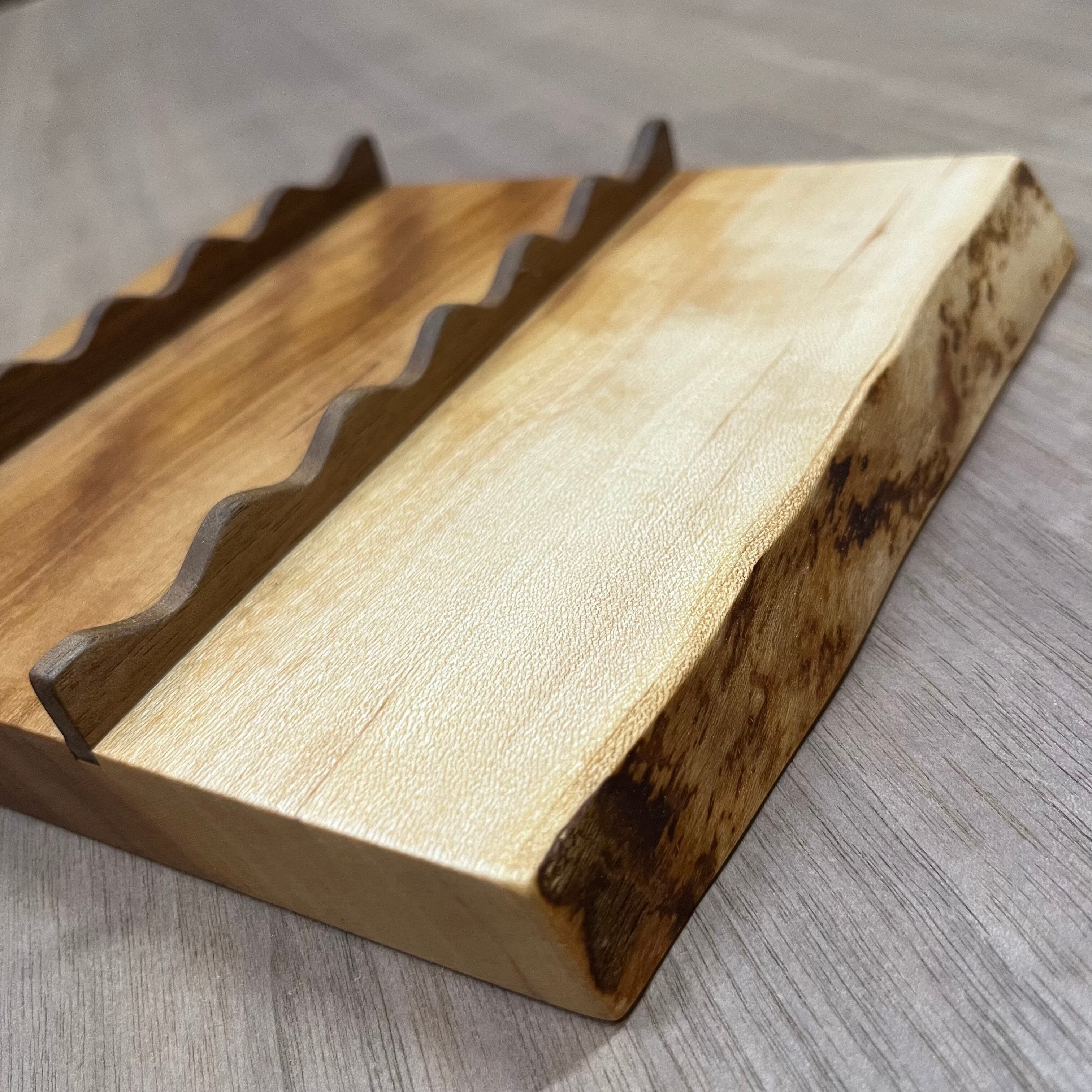 耳付き一枚板を天然オイルで仕上げてあり、ペンの長さや太さが違っても置けるように作られています。