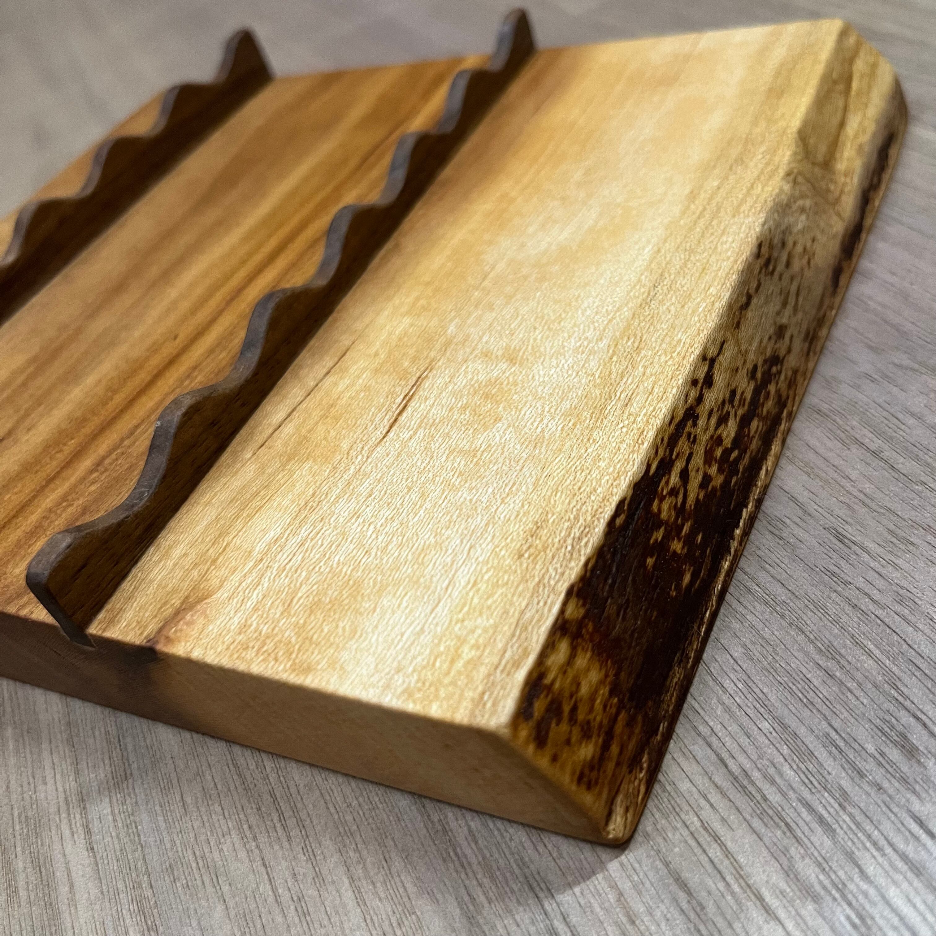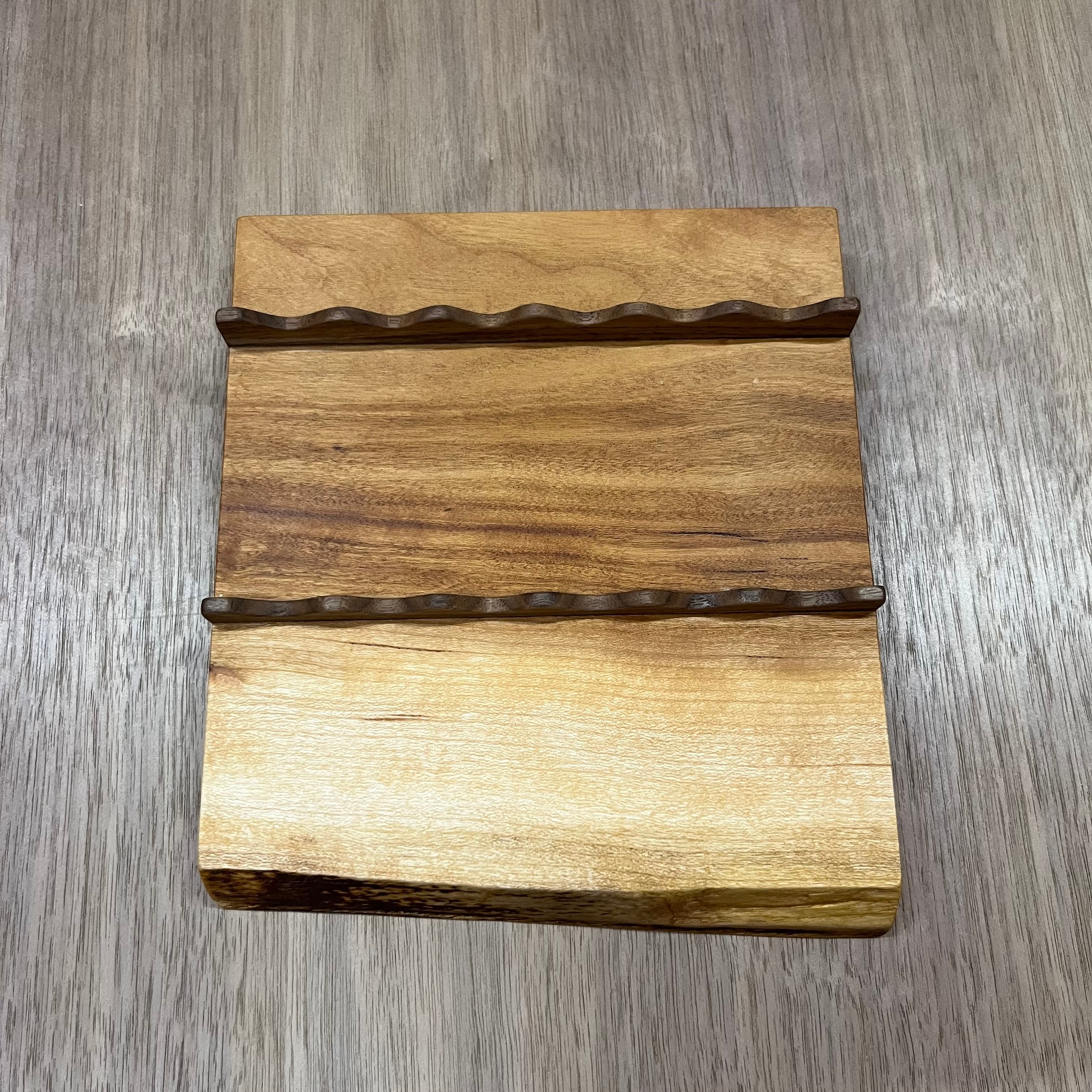 耳付き一枚板を天然オイルで仕上げてあり、ペンの長さや太さが違っても置けるように作られています。