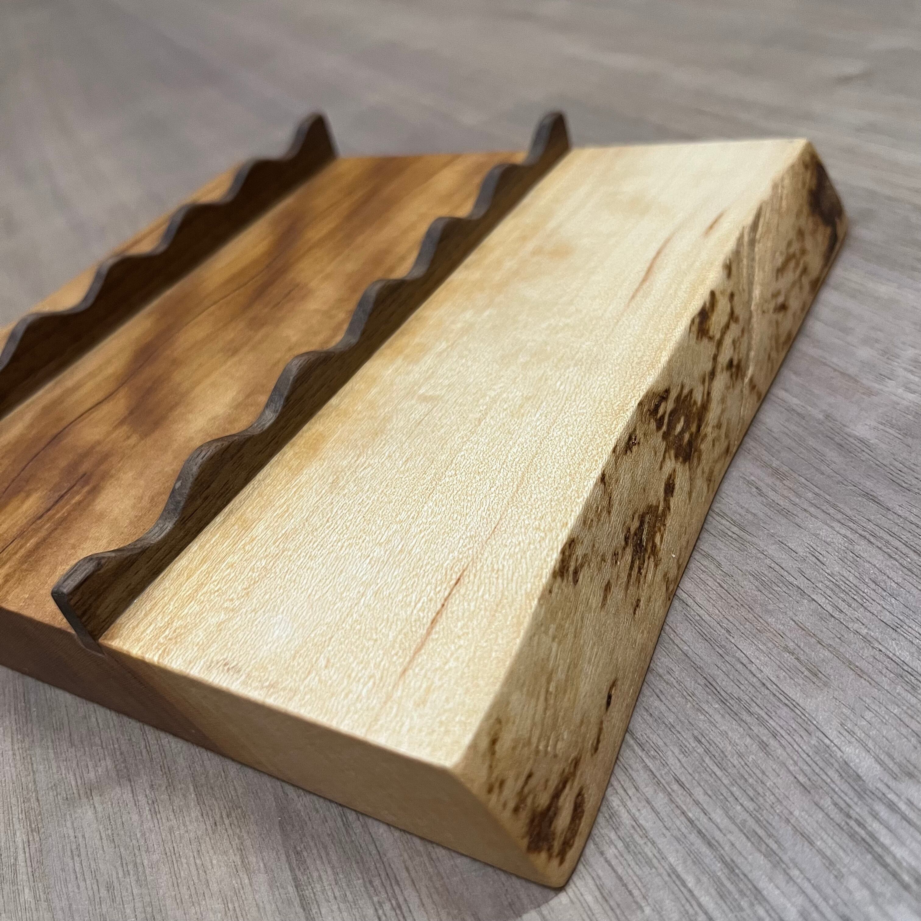耳付き一枚板を天然オイルで仕上げてあり、ペンの長さや太さが違っても置けるように作られています。