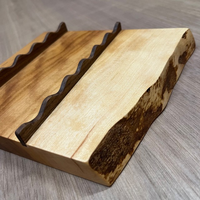 耳付き一枚板を天然オイルで仕上げてあり、ペンの長さや太さが違っても置けるように作られています。