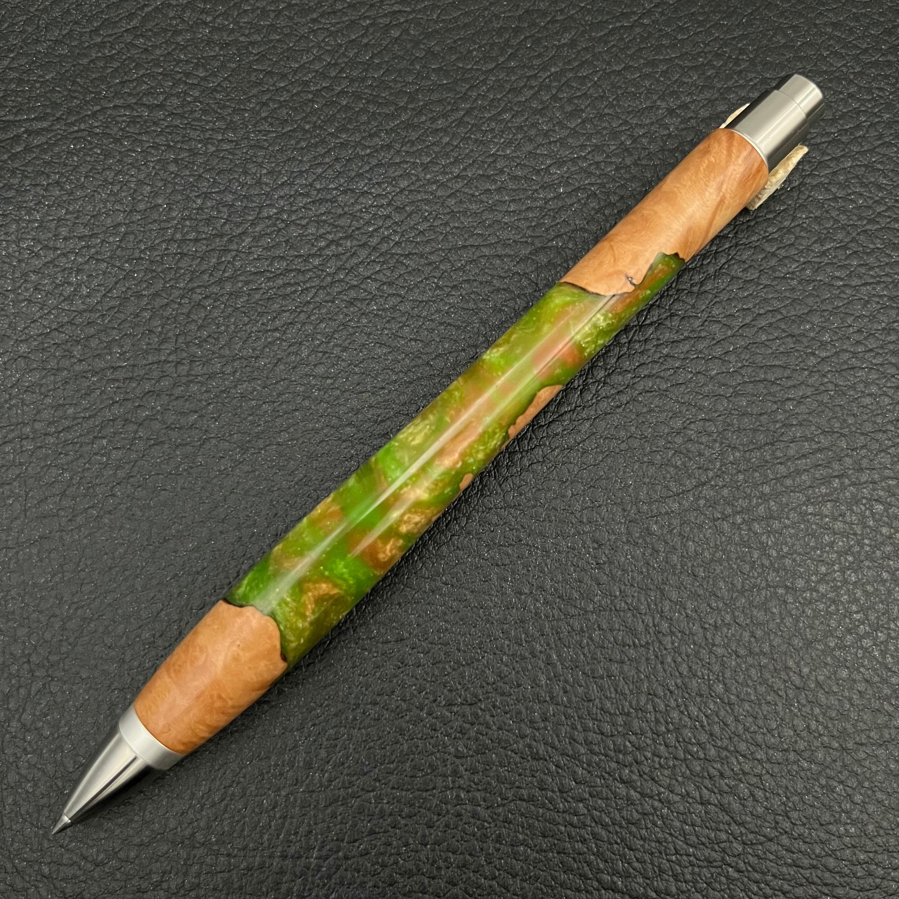 ボールペンのノックシステムは、ドイツ最高のクリックメカニズムを採用してあります。このメカニズムはユニークな機構のため、クリックしたときのカチカチ音が静かで、どんな場所でも気兼ねなく使うことができます。滑らかに動くこのプッシュ感覚を一度味わうと他には戻れなくなってしまうほどの魅力があります。 100分の1単位の加工精度で削り出されたペン先は、軸ブレも全くありません。