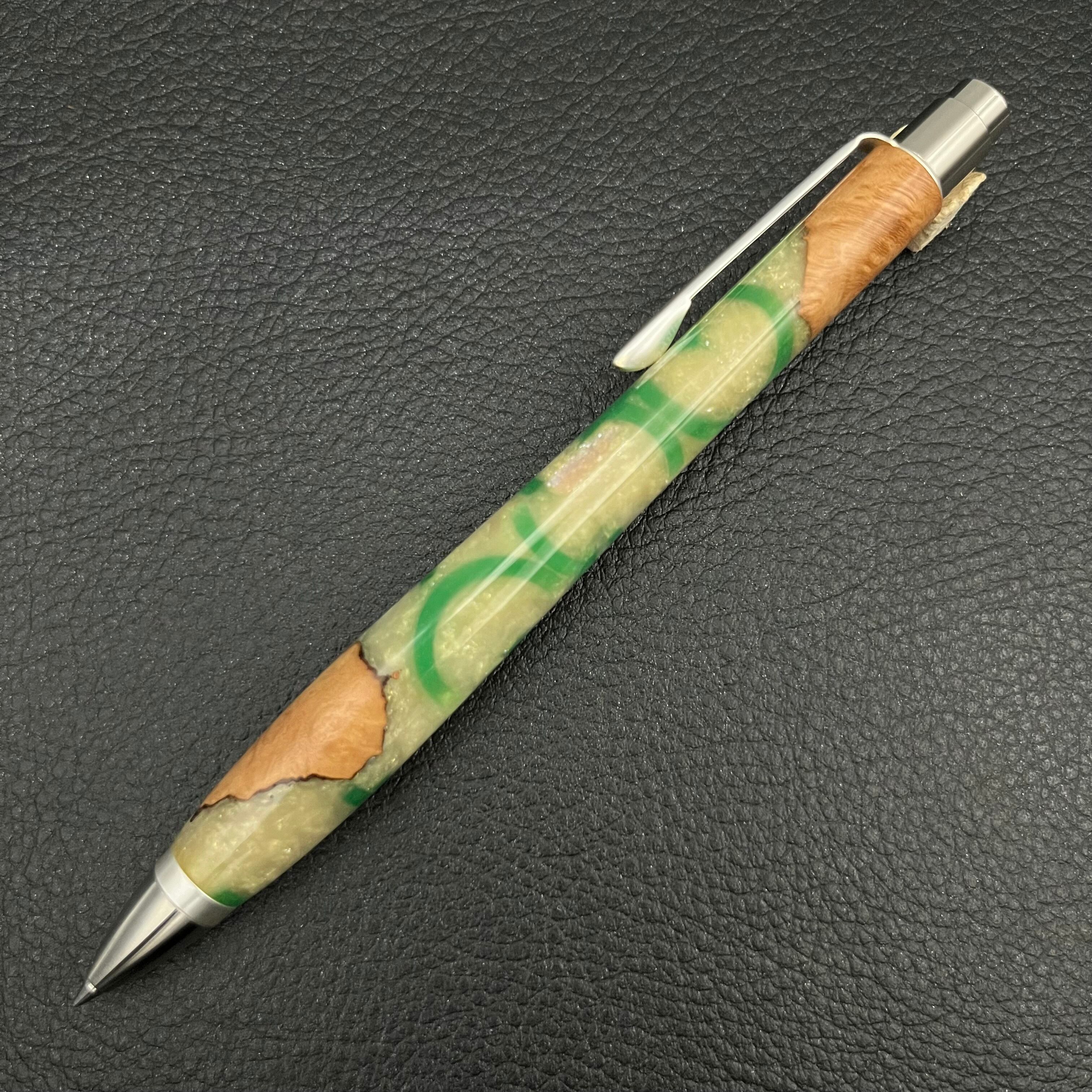 ボールペンのノックシステムは、ドイツ最高のクリックメカニズムを採用してあります。このメカニズムはユニークな機構のため、クリックしたときのカチカチ音が静かで、どんな場所でも気兼ねなく使うことができます。滑らかに動くこのプッシュ感覚を一度味わうと他には戻れなくなってしまうほどの魅力があります。 100分の1単位の加工精度で削り出されたペン先は、軸ブレも全くありません。