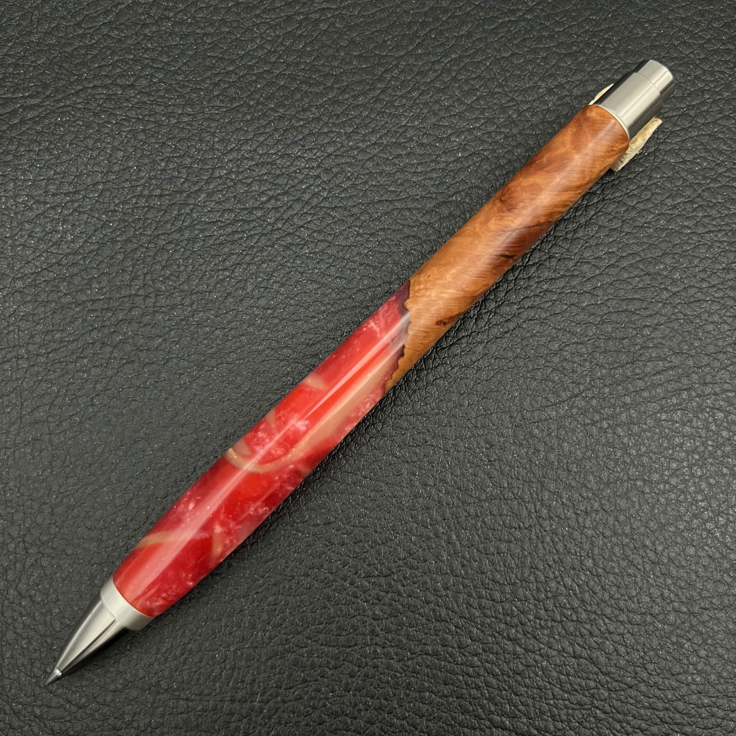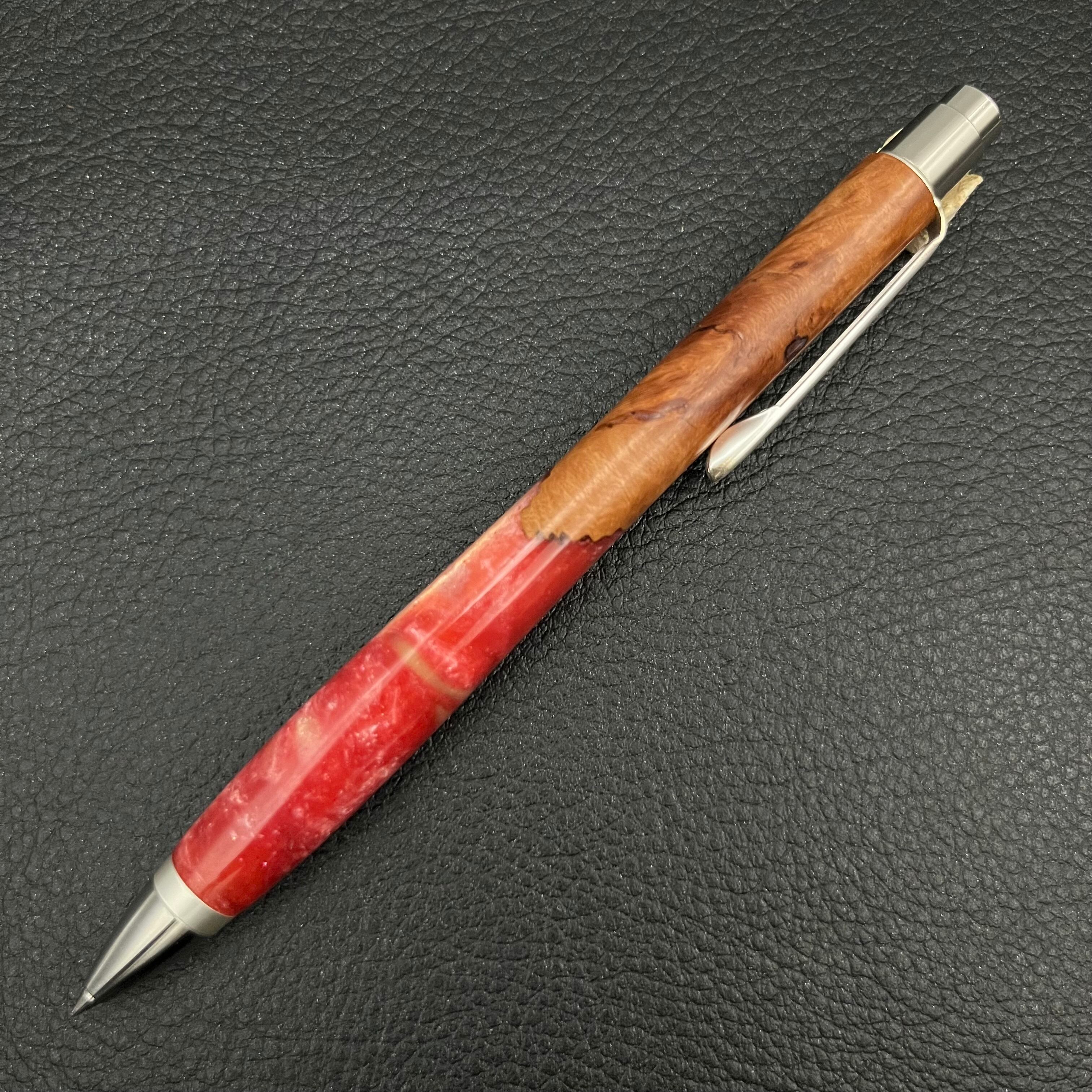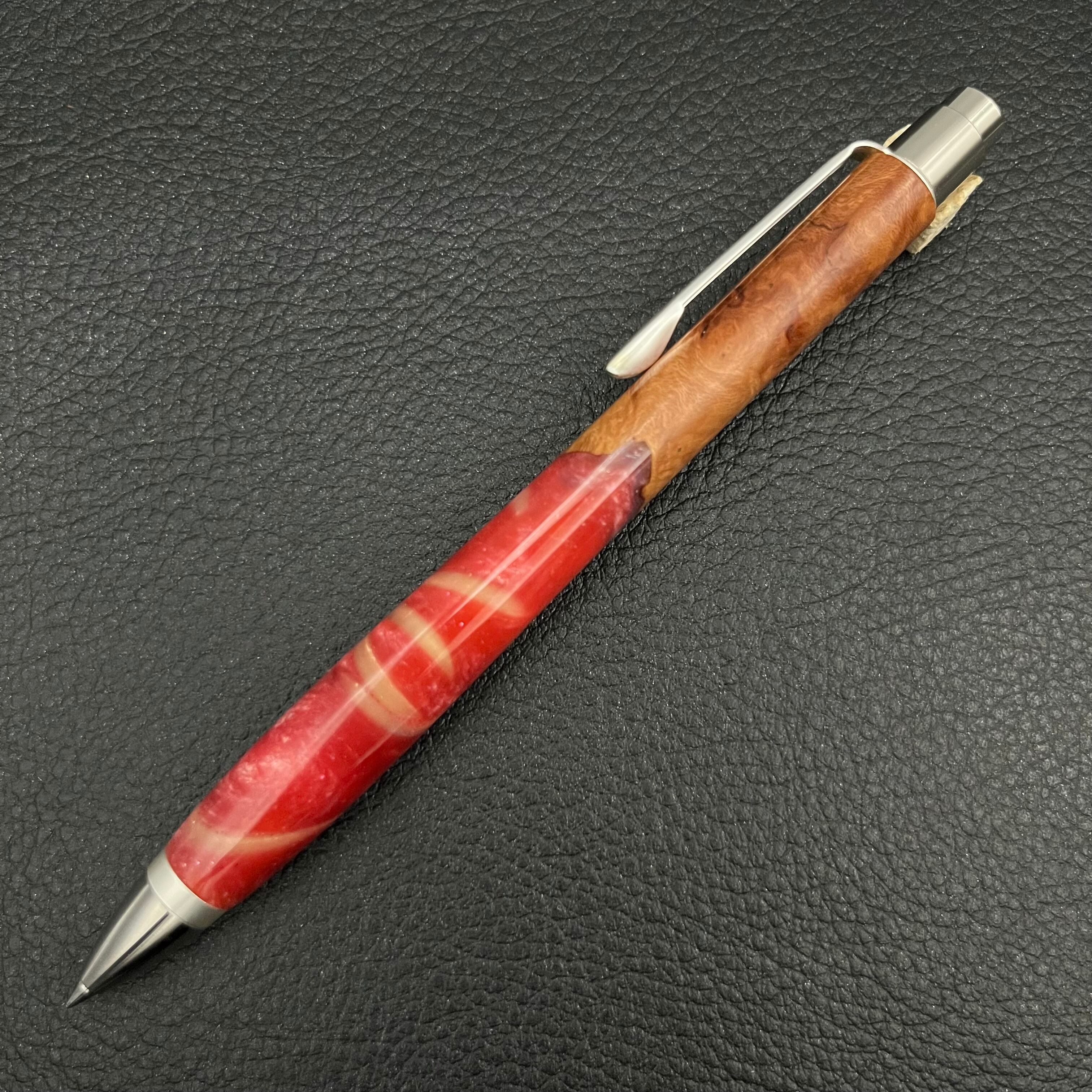 ボールペンのノックシステムは、ドイツ最高のクリックメカニズムを採用してあります。このメカニズムはユニークな機構のため、クリックしたときのカチカチ音が静かで、どんな場所でも気兼ねなく使うことができます。滑らかに動くこのプッシュ感覚を一度味わうと他には戻れなくなってしまうほどの魅力があります。 100分の1単位の加工精度で削り出されたペン先は、軸ブレも全くありません。