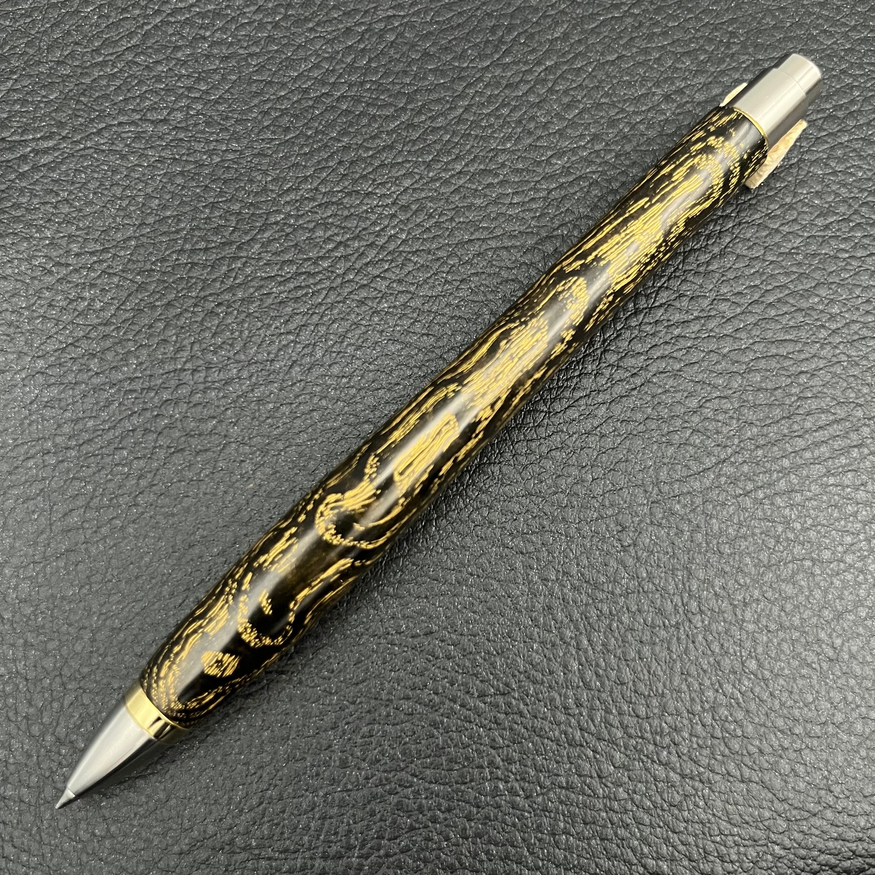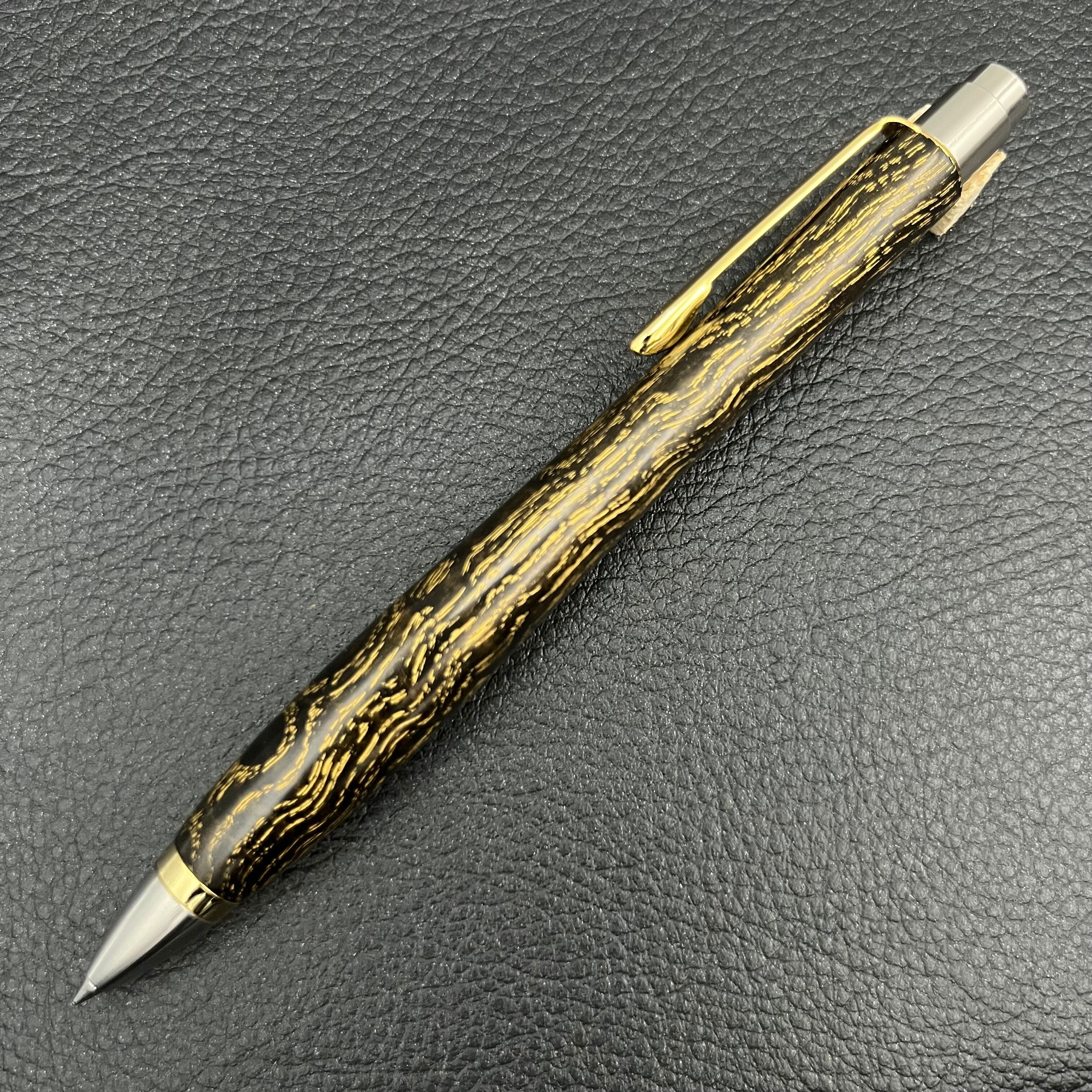 ・やちだも玉杢に国産黒漆を摺り漆(拭き漆)の技法で塗り重ねて、本金で木目を装飾しています。こちらのペンは2024年・2025年制作予定はありません。