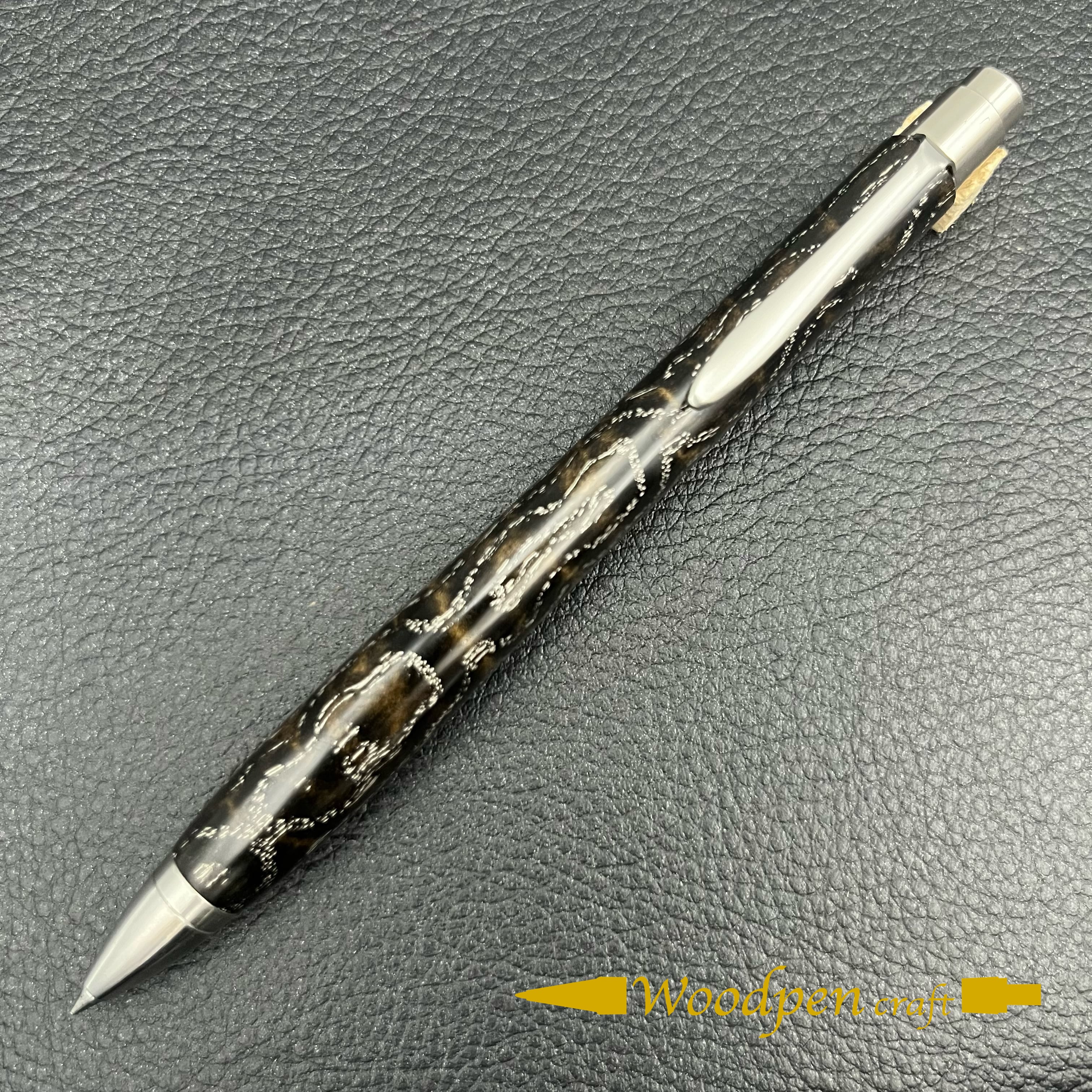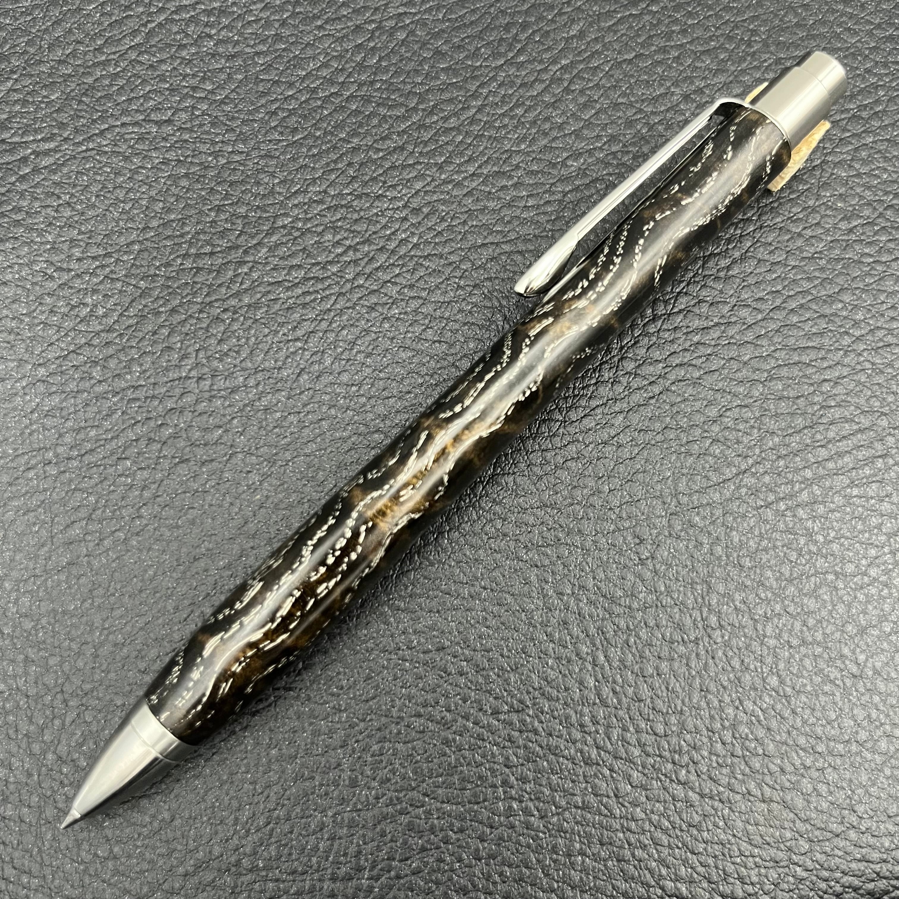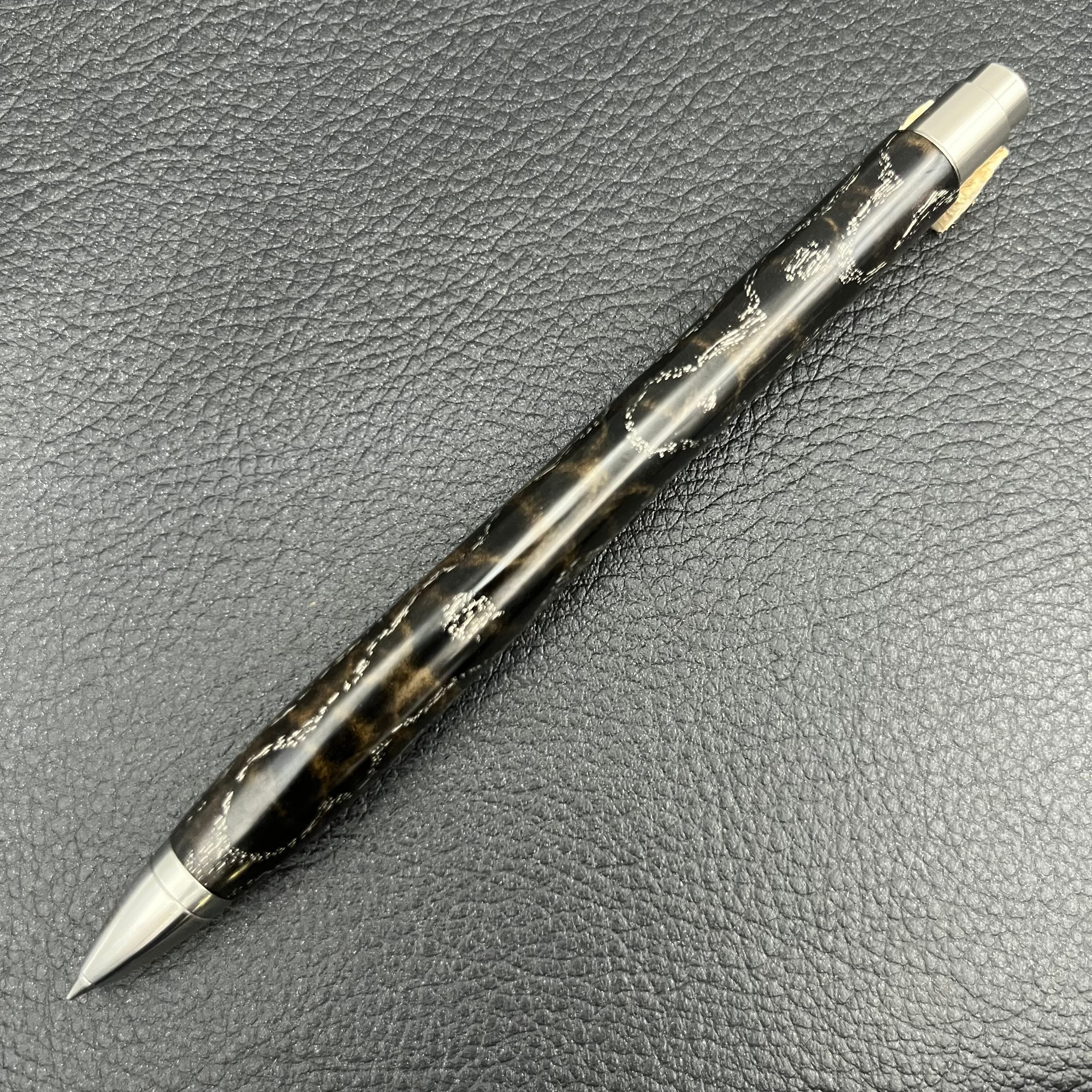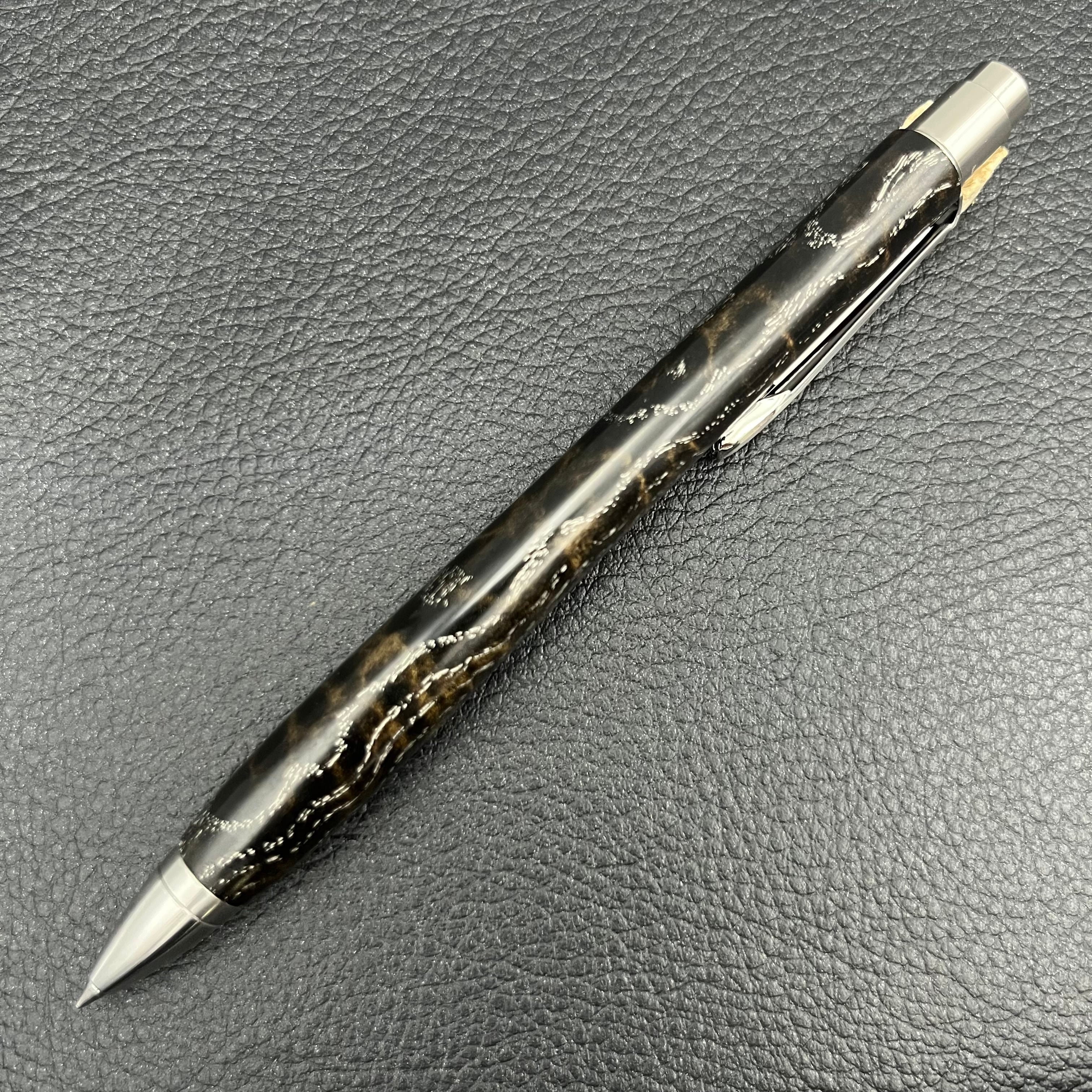 ・やちだも玉杢に国産黒漆を摺り漆(拭き漆)の技法で塗り重ねて、白金(プラチナ)で木目を装飾しています。こちらのペンは2024年・2025年制作予定はありません。