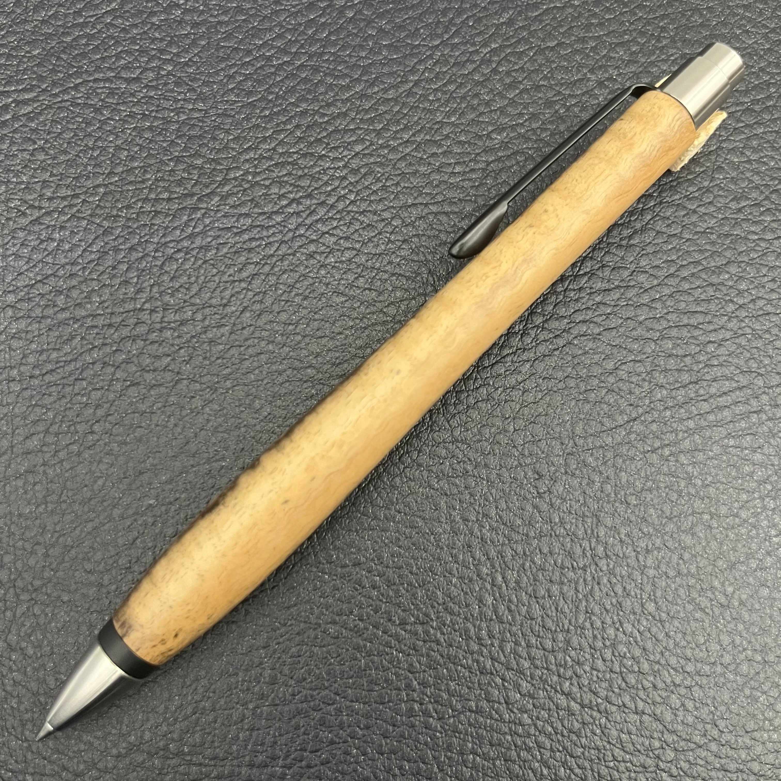 ボールペンのノックシステムは、ドイツ最高のクリックメカニズムを採用してあります。このメカニズムはユニークな機構のため、クリックしたときのカチカチ音が静かで、どんな場所でも気兼ねなく使うことができます。滑らかに動くこのプッシュ感覚を一度味わうと他には戻れなくなってしまうほどの魅力があります。 100分の1単位の加工精度で削り出されたペン先は、軸ブレも全くありません。