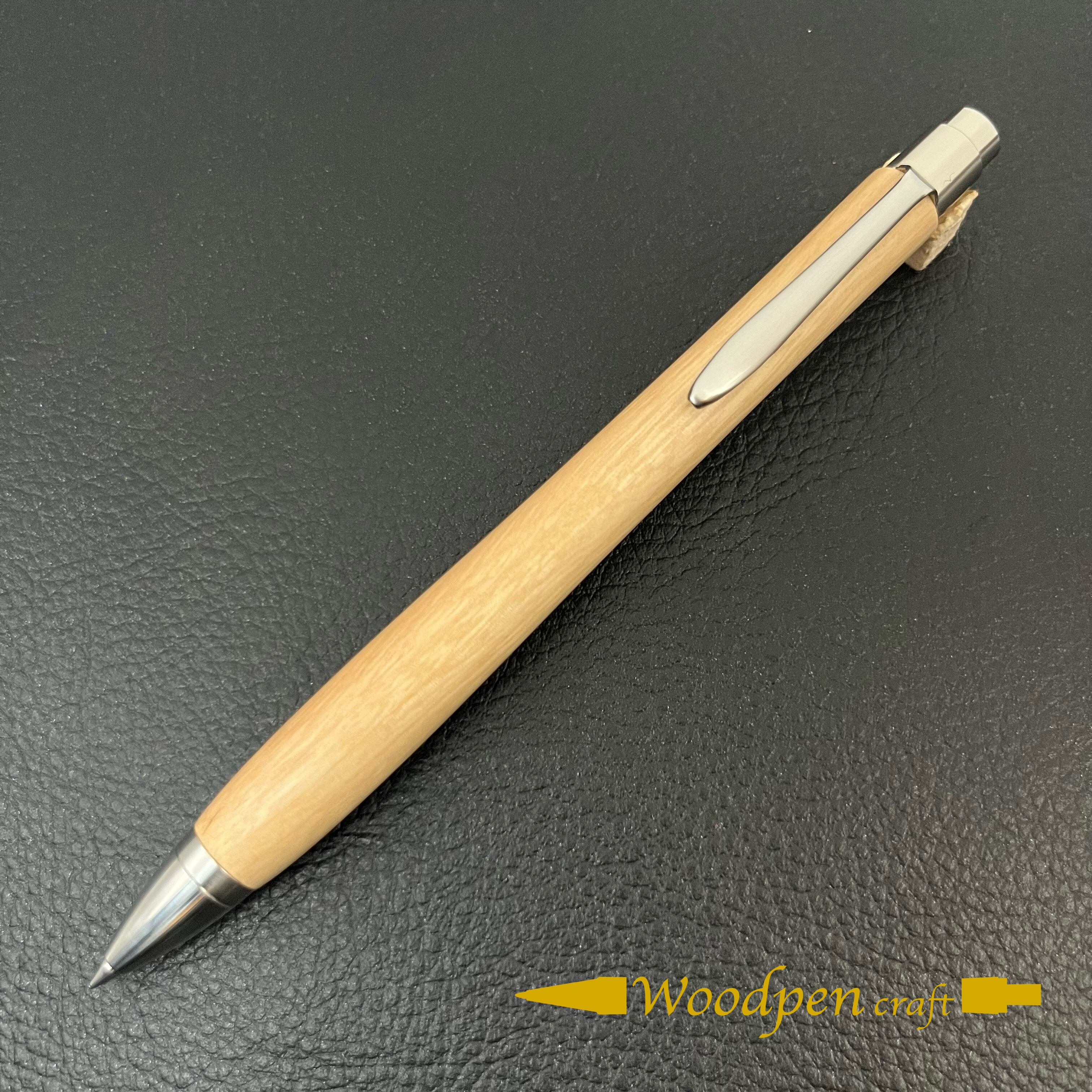 ボールペンのノックシステムは、ドイツ最高のクリックメカニズムを採用してあります。このメカニズムはユニークな機構のため、クリックしたときのカチカチ音が静かで、どんな場所でも気兼ねなく使うことができます。滑らかに動くこのプッシュ感覚を一度味わうと他には戻れなくなってしまうほどの魅力があります。 100分の1単位の加工精度で削り出されたペン先は、軸ブレも全くありません。