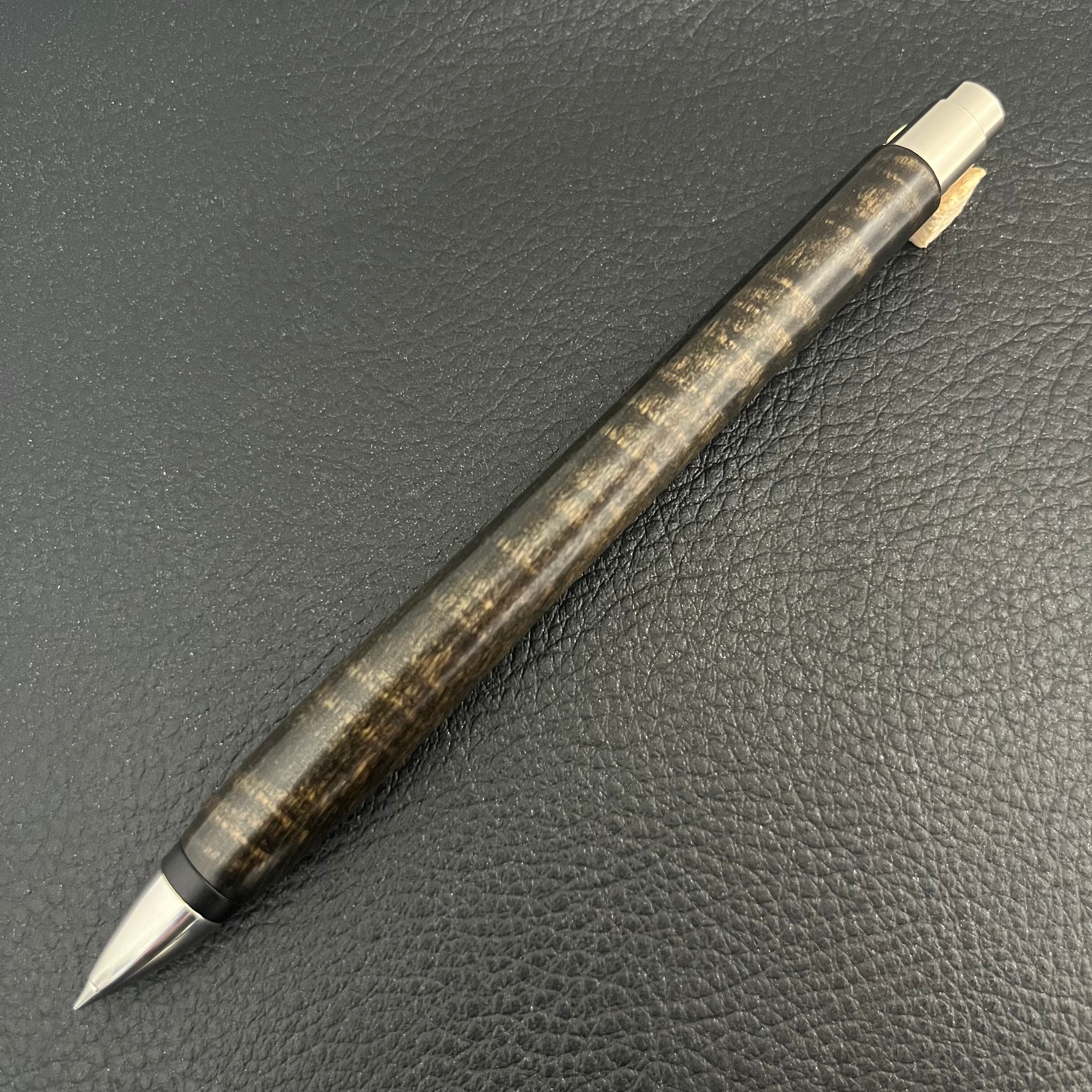 ※大阪の漆塗り職人さんにお願いして、栃縮杢に大変希少な国産漆を、何度も塗り重ねて拭き取る(摺り漆)技法で仕上げた黒漆ペンです。