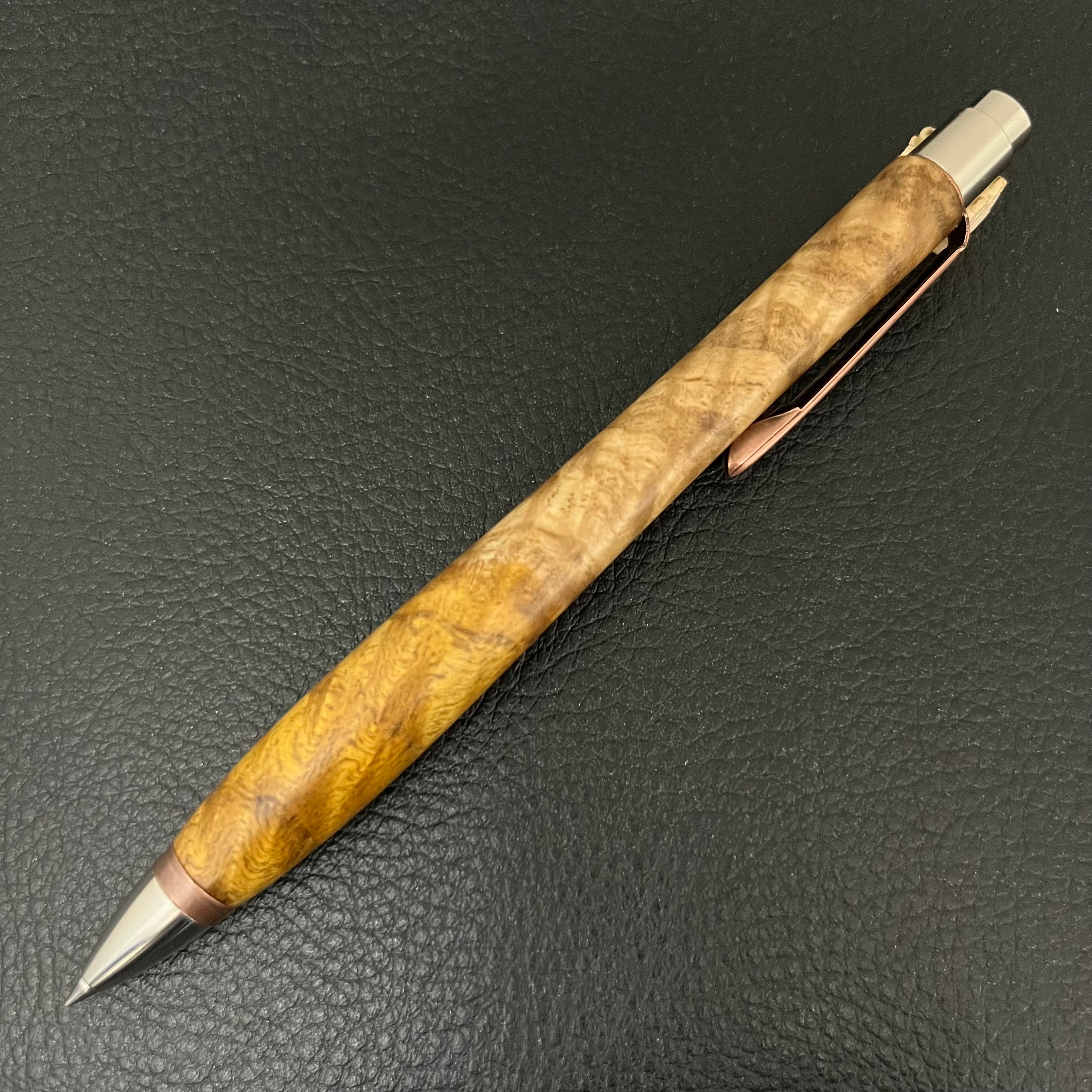 ボールペンのノックシステムは、ドイツ最高のクリックメカニズムを採用してあります。このメカニズムはユニークな機構のため、クリックしたときのカチカチ音が静かで、どんな場所でも気兼ねなく使うことができます。滑らかに動くこのプッシュ感覚を一度味わうと他には戻れなくなってしまうほどの魅力があります。 100分の1単位の加工精度で削り出されたペン先は、軸ブレも全くありません。